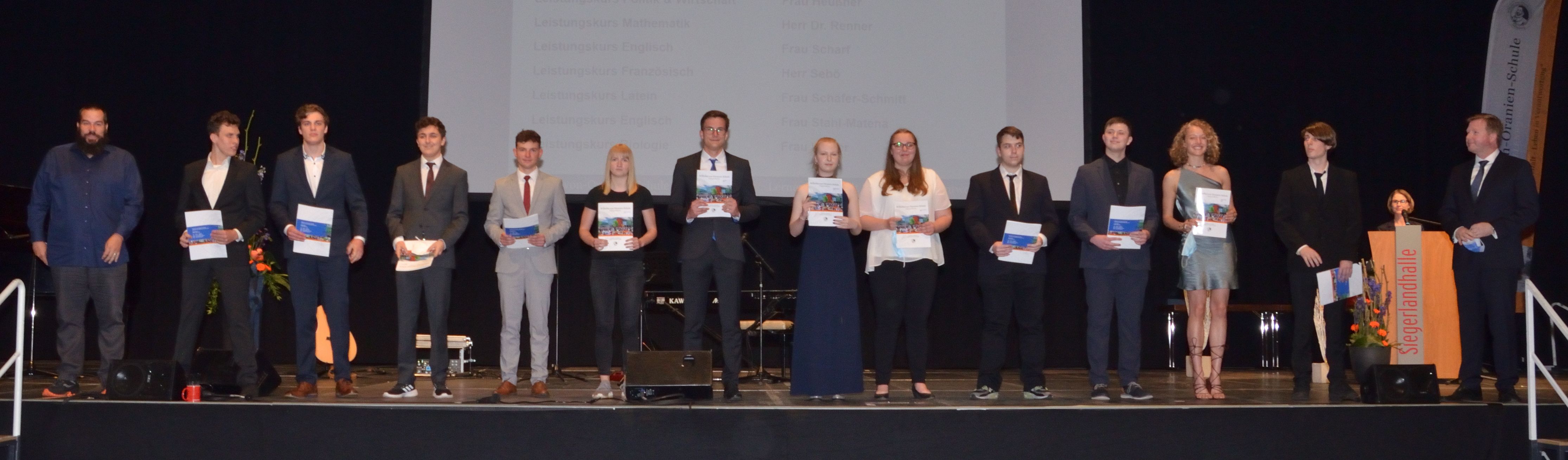 Besondere fachliche Leistungen wurden auch dieses Jahr in gewohnter Tradition geehrt. Dr. Jörg Wendel vom Dillenburger Traditionsunternehmen Wendel Email honorierte die zwei besten naturwissenschaftlichen Abiturabschlüsse mit Stipendien in Höhe von 1.500,- bzw. 750,- Euro, die an Thiess Bretsch und Constantin Jung ausgezahlt werden, wenn sie ihr naturwissenschaftliches Studium aufnehmen. Des Weiteren wurden von diversen Fachverbänden für Prüfungshöchstleistungen mit Urkunden, Sachpreisen oder Mitgliedschaften geehrt: Marie-Kristin Moos (Deutsch), Constantin Jung (Latein), Ida Warfsmann (Ethik), Saverio Asbai (Politik & Wirtschaft), Philipp Meister und Merle Womser (beide Mathematik), Paul Weiershausen (Mathematik und Physik), Mervin Albrecht, Thiess Bretsch und Larissa Moos (alle Chemie).