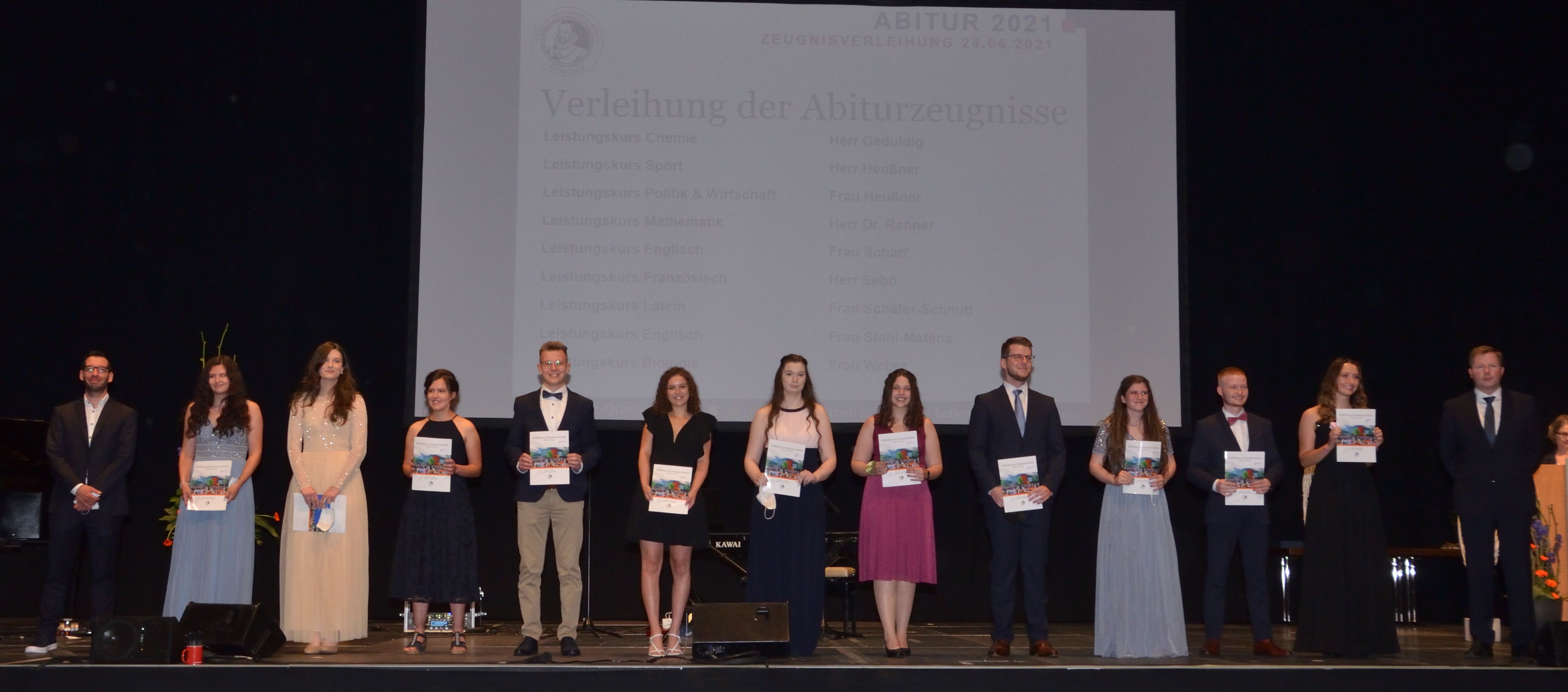 Oberstudiendirektor Martin Hinterlang freute sich aber nicht nur darüber, sondern zeigte sich überdies beeindruckt von einem formidablen Rekordergebnis, welches der „Corona-Jahrgang“ erzielt hatte. Der Notendurchschnitt kletterte auf eine bisherige Bestleistung von 2,29 – und dies, obwohl die Prüfungsanforderungen keineswegs wegen Corona inhaltlich ausgedünnt worden wären. Einen weiteren Glanzpunkt setzten vier Abiturienten mit der Traumnote 1,0. Carlotta Deffner, Philipp Meister, Paul Weiershausen und Merle Womser wurden dafür vom Schulleiter und von Studienleiterin Andrea Stühler mit Buchgutscheinen belohnt.