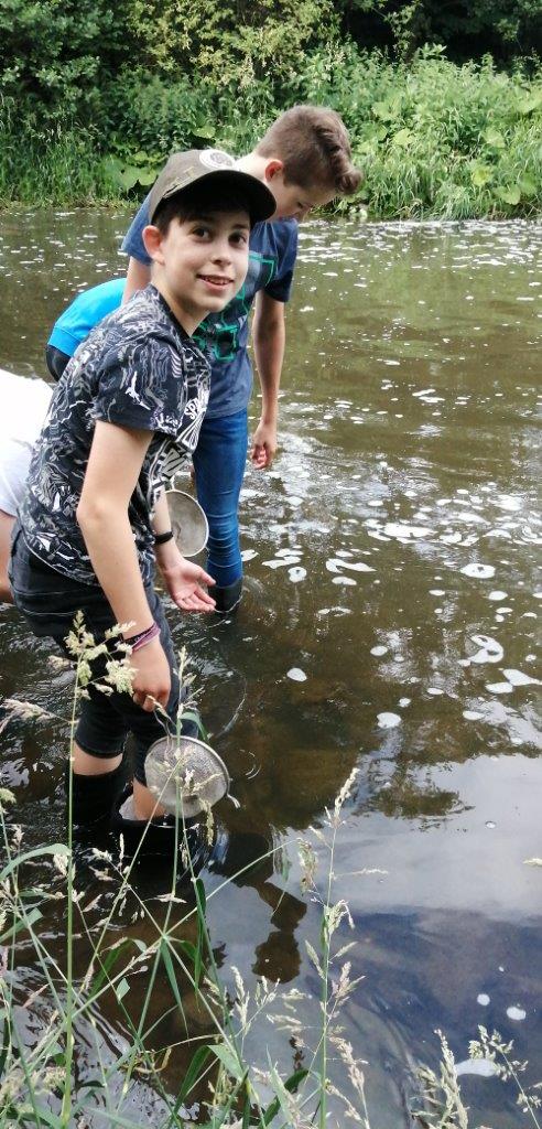An den Untersuchungsstellen wurden dann 15 bis 20 Minuten lang Organismen zur späteren Bestimmung gefangen. Dazu wurden Wassertiere unter Steinen, zwischen Pflanzen und im Sediment gesammelt. Hierbei werden die Kescher gegen die Strömung geführt und Tiere vorsichtig mit Pinseln von Steinen in die Eimer überführt. Die gefangenen Tiere werden mithilfe von Bestimmungskarten vor Ort bestimmt, die Anzahl notiert und anschließend wieder entlassen. Ausgewählte Tiere wurden in der Schule weiter mit Stereolupen untersucht und fotografiert. Auch diese Tiere wurden nach der Untersuchung und Dokumentation wieder schonend zurückgesetzt.