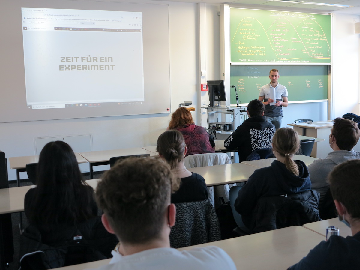 Nach einer Begrüßung von Schulleiter Martin Hinterlang und Stefan Riemer, dem Koordinator zur Berufsorientierung, hielt der ehemalige Schüler Jakob Pfeifer einen spannenden Vortrag über seinen Weg ins Studium. In seinem Vortrag setzte der Absolvent des Abiturjahrgangs 2018 Impulse auf dem Weg der Entscheidungsfindung und bediente sich hierzu bei Friedrich Nietzsche: „In dem Zitat ‚Werde, der du bist‘ steckt auf der einen Seite die Gewissheit, dass in einem selbst bereits viele Schätze und Gaben verborgen sind; während man auf der anderen Seite aktiv in einen Entwicklungsprozess geht.“