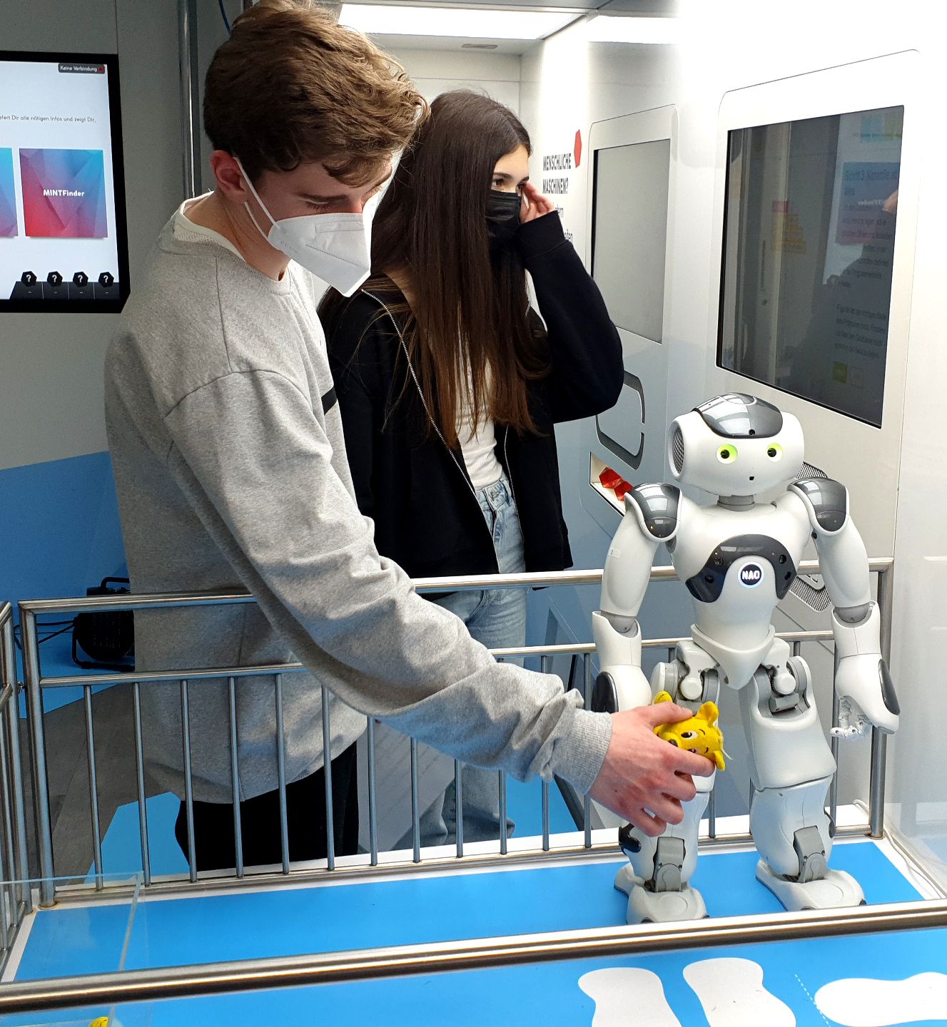 Kerstin Renkhoff von der Schulleitung hat vor allem der ‚Nao-Roboter‘ begeistert: „Eine Schülerin sagte noch zu Beginn, dass sie bei MINT-Fächern und bei Programmierung überhaupt nichts könne. Das geringe Selbstwertgefühl beobachten wir häufiger in diesem Bereich. Und dann konnte diese Schülerin bei der Programmierung im Truck die Aufgabe meistern. Die Gruppe hat sich ein ‚Highfive‘ gegeben und gemeinsam ein koopertives Erfolgserlebnis gesammelt. Das stimmt uns sehr zuver-sichtlich, dass solche Projekte der richtige Ansatz sind." Ihr Kollege, Stefan Riemer, der in der Schu-le die berufliche Orientierung koordiniert fügt hinzu: „Uns war bei der Auswahl der Teilnehmer be-sonders wichtig, in der Jahrgangsstufe 8 ein breites Interesse zu wecken. Daher besuchen alle Jahrgangsteilnehmer den Truck. Diese Jugendlichen beginnen erst ihren Weg der Berufsorientie-rung. Auf diesem Prozess bereits ein eindrückliches Aha-Erlebnis im MINT-Bereich zu sammeln, ist uns als Schule sehr wichtig. Gleichzeitig haben wir aber auch gezielt interessierte Gruppen der älte-ren Jahrgänge ausgewählt, um vorhandenes Interesse durch Begeisterung zu verstärken und den Weg der Orientierung durch Angebote zu prägen."