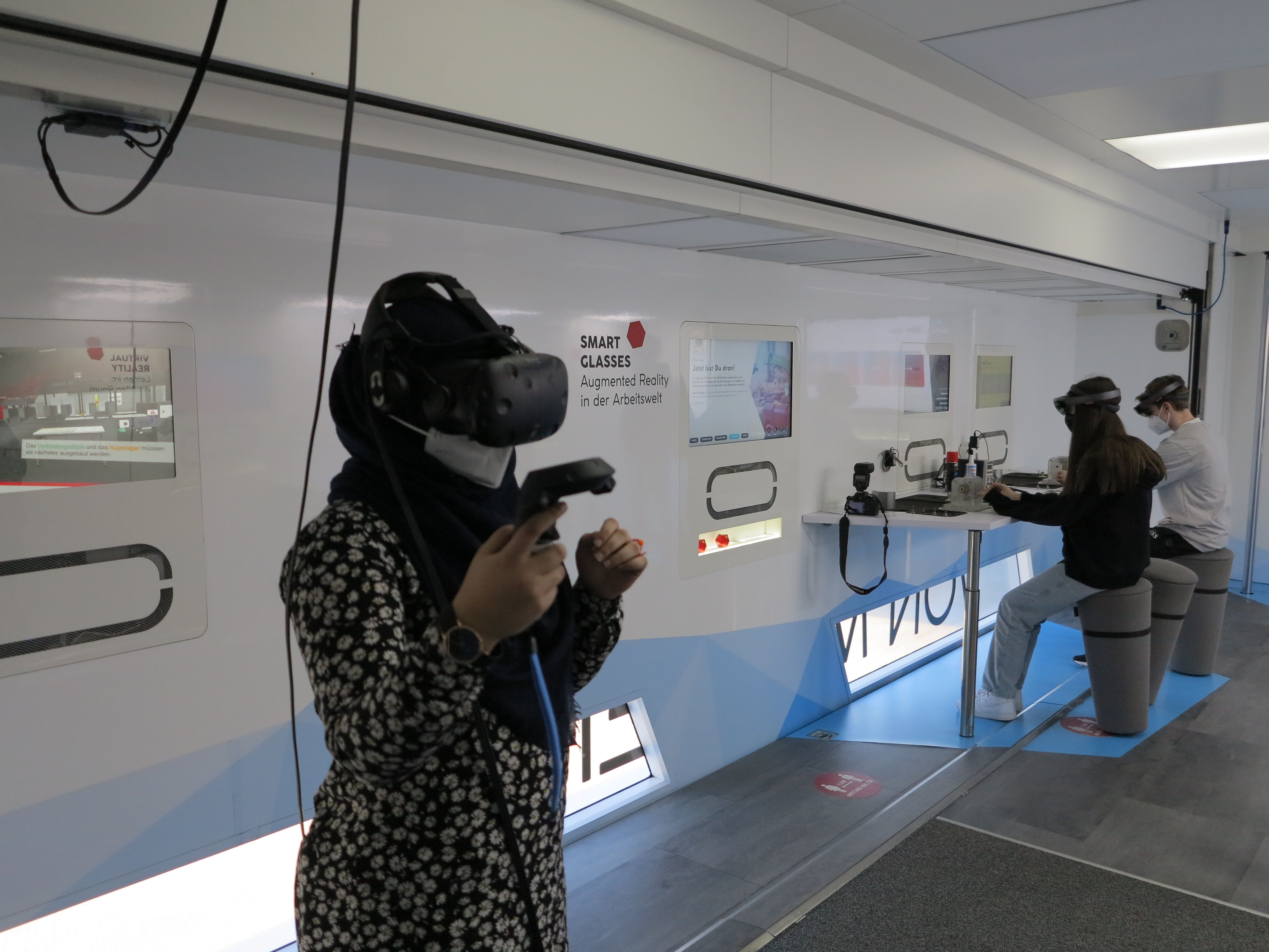 Kugeln nur mit Gedanken steuern, Roboter programmieren, die anschließend Plüschbären apportie-ren, einen Personenzug in einer Vakuumröhre durch Elektromagnetismus auf 1.300 Stundenkilome-ter beschleunigen, mit ‚Smart Glases“ in einer virtuellen Welt technische Bauteile zusammensetzen oder schon heute die textilen Materialen der Zukunft anfassen – die experimentellen Ansätze be-geistern die Schüler der 8. Klasse in der Doppelstunde, die sie im Truck zubringen. Begleitet werden sie dabei von „MINT-Coaches“ – allesamt junge, pädagogisch geschulte Naturwissenschaftler, wie Hanna Wagner. Der Kognitionswissenschaftlerin macht die Arbeit mit den Jugendlichen sichtlich Freude. Dass sie häufig von den Achtklässlern angesprochen wird, zeigt: die Chemie stimmt. „Was, die zwei Stunden sind schon vorbei?“ „Wann kann ich denn nochmal kommen?“ „Kommt Ihr wie-der?“ – alles Fragen, die Wagner nicht zum ersten Mal hört.