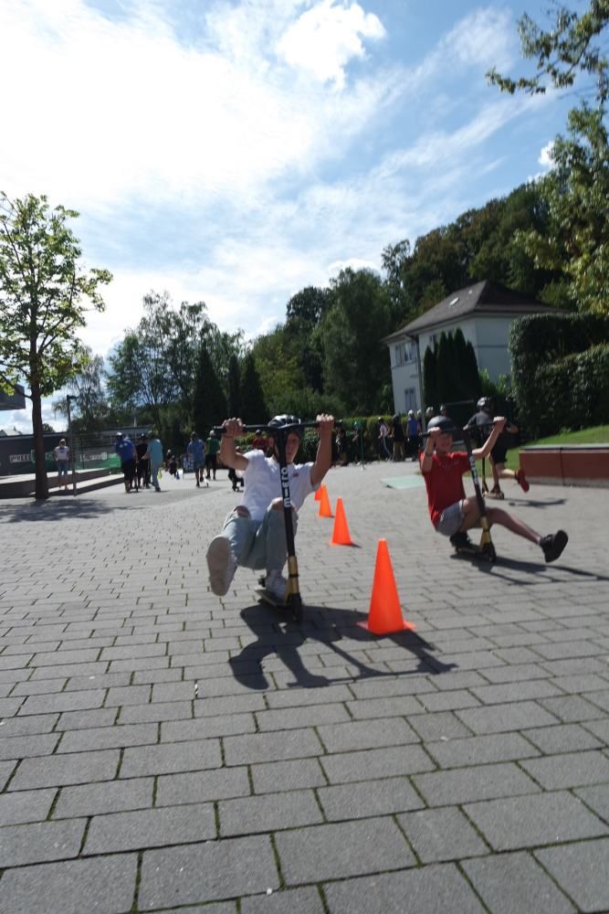 Eine schöne Ergänzung zum Fahrradfahren, als Fortbewegungsmittel auf Rädern, erlebten Schülerinnen und Schüler der Klasse 8F am 02. September 2020 bei dem Projekt WHEELUP!. Das Projekt wird von der Agentur City Skate in Zusammenarbeit mit der AOK Hessen und der Zentralen Fortbildungseinrichtung für Sportlehrkräfte des Landes Hessen (ZFS) seit 2016 an Schulen angeboten. Fachreferent Steven Moser von WHEELUP! leitete die Schülerinnen und Schüler an, wie man sich mit Scootern und Waveboards bewegen kann. Zunächst sollten die Sportlerinnen und Sportler ein Gefühl für das Fortbewegen mit den "wackeligen" Waveboards bekommen. Dank hilfreicher Tipps war der Lernfortschritt für viele von ihnen sehr motivierend. Für bereits Geübte standen ein Slalom-Parkour und Rampen bereit, auf denen man sein Können unter Beweis stellen konnte. Anschließend durften alle mit den Scootern über den Schulhof rollen. Unterschiedliche Übungen und Spiele forderten das Gleichgewicht und die Orientierungsfähigkeit der Schülerinnen und Schüler heraus. So konnten hospitierende Sportlehrkräfte der WvO beispielsweise beobachten, wie die jungen Sportlerinnen und Sportler mit nur einer Hand am Lenker fahren, unter einer Limbo-Stange durchrollen oder in der Hocke gleiten und dabei ein Bein anheben.