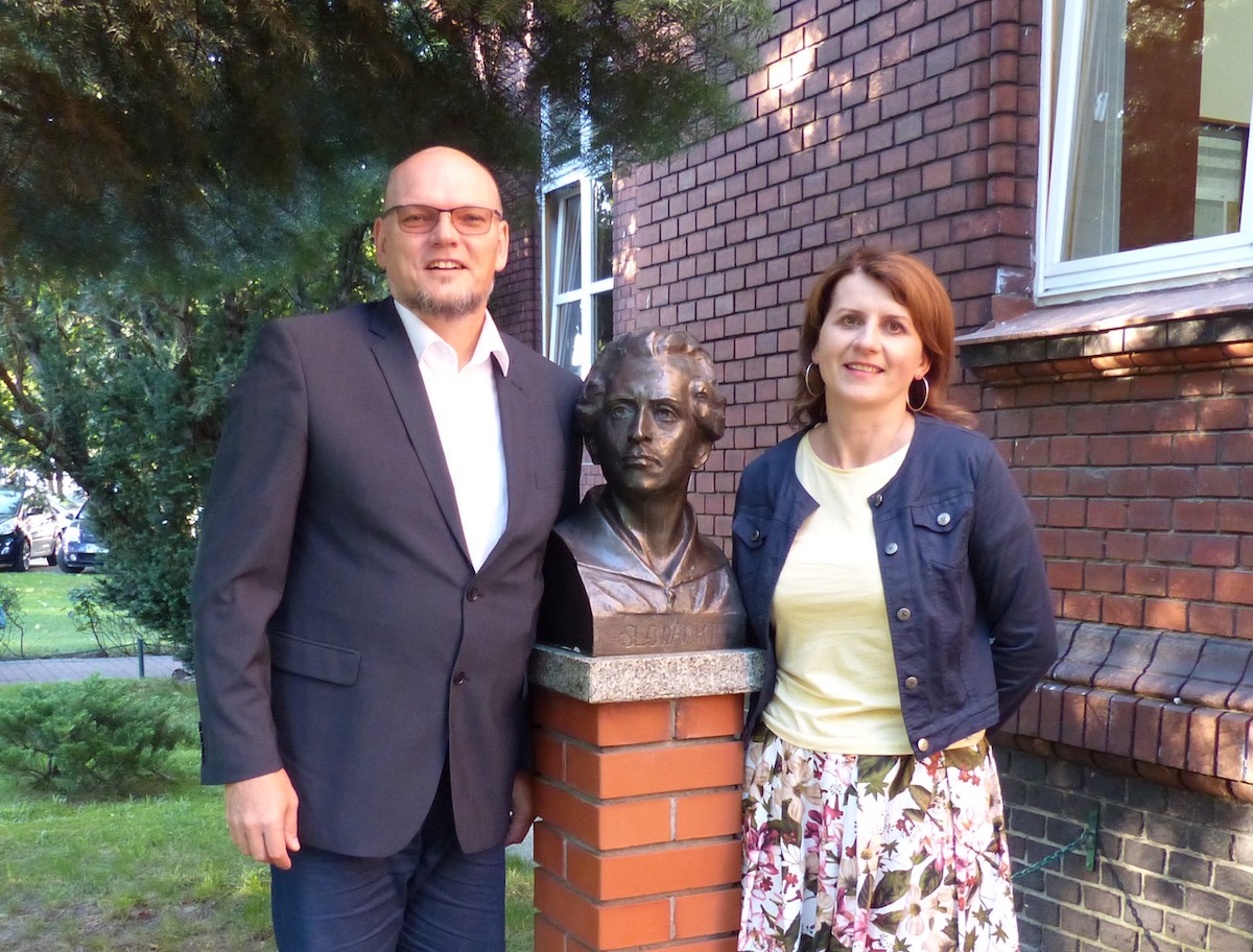 An der Büste des pol. Nationaldichters Juliusz Słowacki (Namensgeber d. Lyzeums) _v.l.n.r.: Paul Sajon + Vizeleiterin Grażyna Skrzypczak