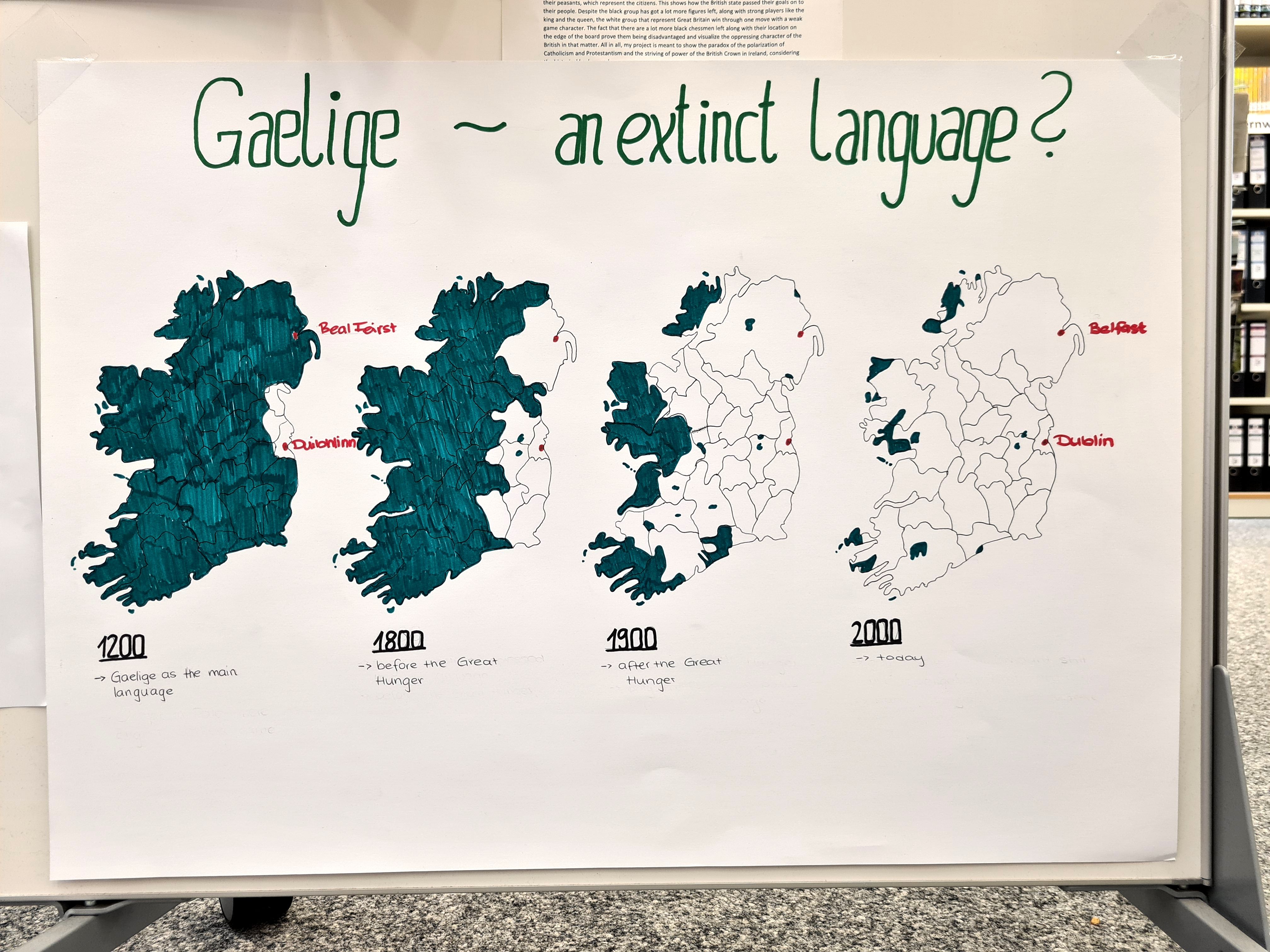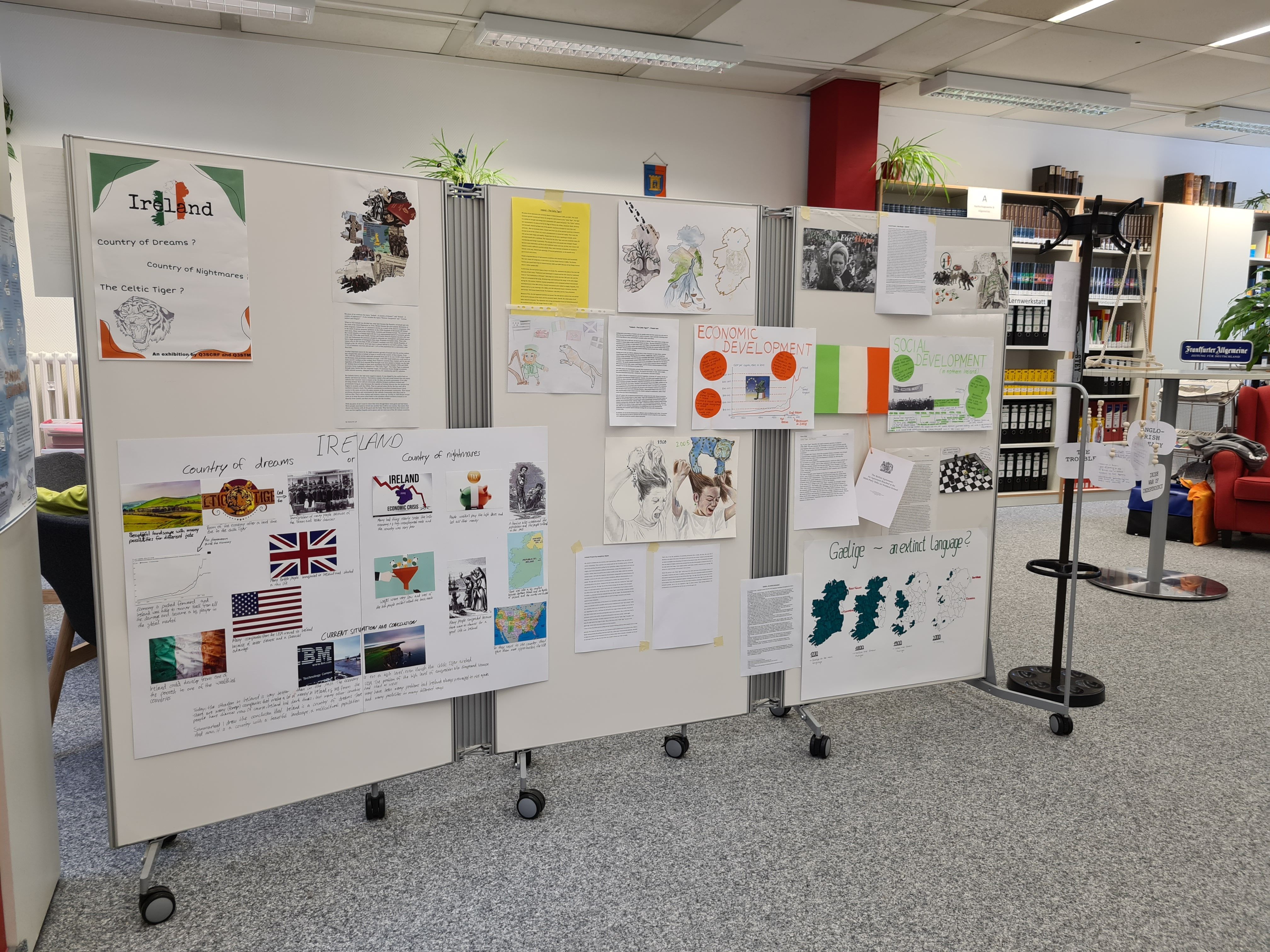 Auf der Grundlage intensiver Recherche zu den Themenbereichen „Ireland – A country of dreams?“, „Ireland - A country of nightmares?“ , „Ireland – The Celtic Tiger“ sowie frei wählbarer Aspekte aus den Bereichen Musik, Literatur und Kunst erarbeiteten die Schülerinnen und Schüler zunächst ein inhaltliches Konzept sowie eine Skizze des herzustellenden Exponats. Die in der Bibliothek ausgestellten Arbeitsergebnisse bieten nun vielfältige Einblicke in Irlands Geschichte, Wirtschaft, Kultur und Menschen.