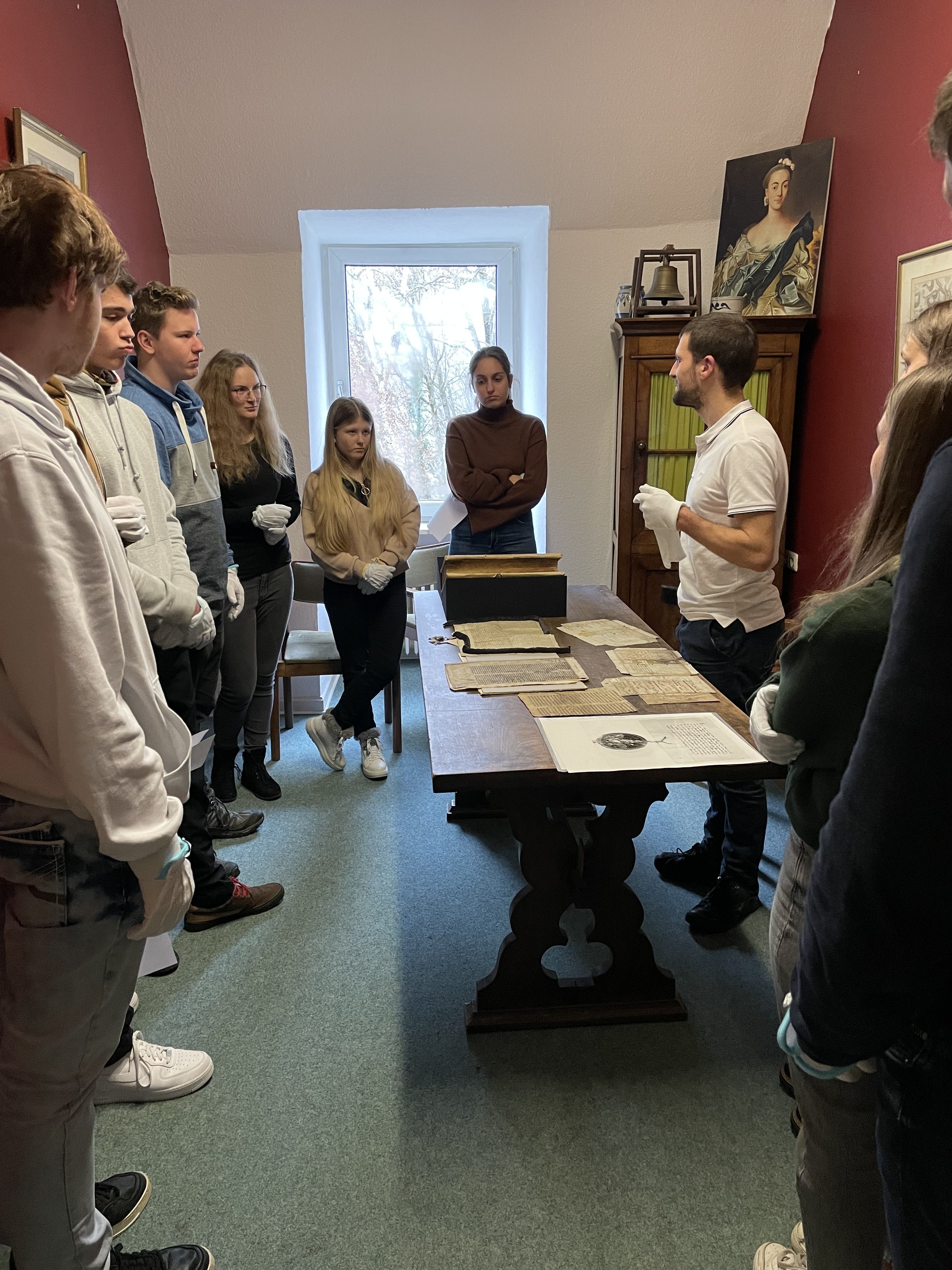 Herr Dietrich hat den Schülerinnen und Schülern einen Einblick in seine Arbeit als Stadthistoriker gegeben, die aus den drei Hauptaufgaben Bewertung/Übernahme von archivwürdigem Schriftgut, dessen Erschließung und schließlich der Sicherung und Bestandserhaltung besteht. All diese Aspekte des Berufs durften die Schülerinnen und Schüler danach vor Ort live sehen und anfassen – natürlich mit Handschuhen, um das teilweise viele hundert Jahre alte Schriftgut nicht zu beschädigen.