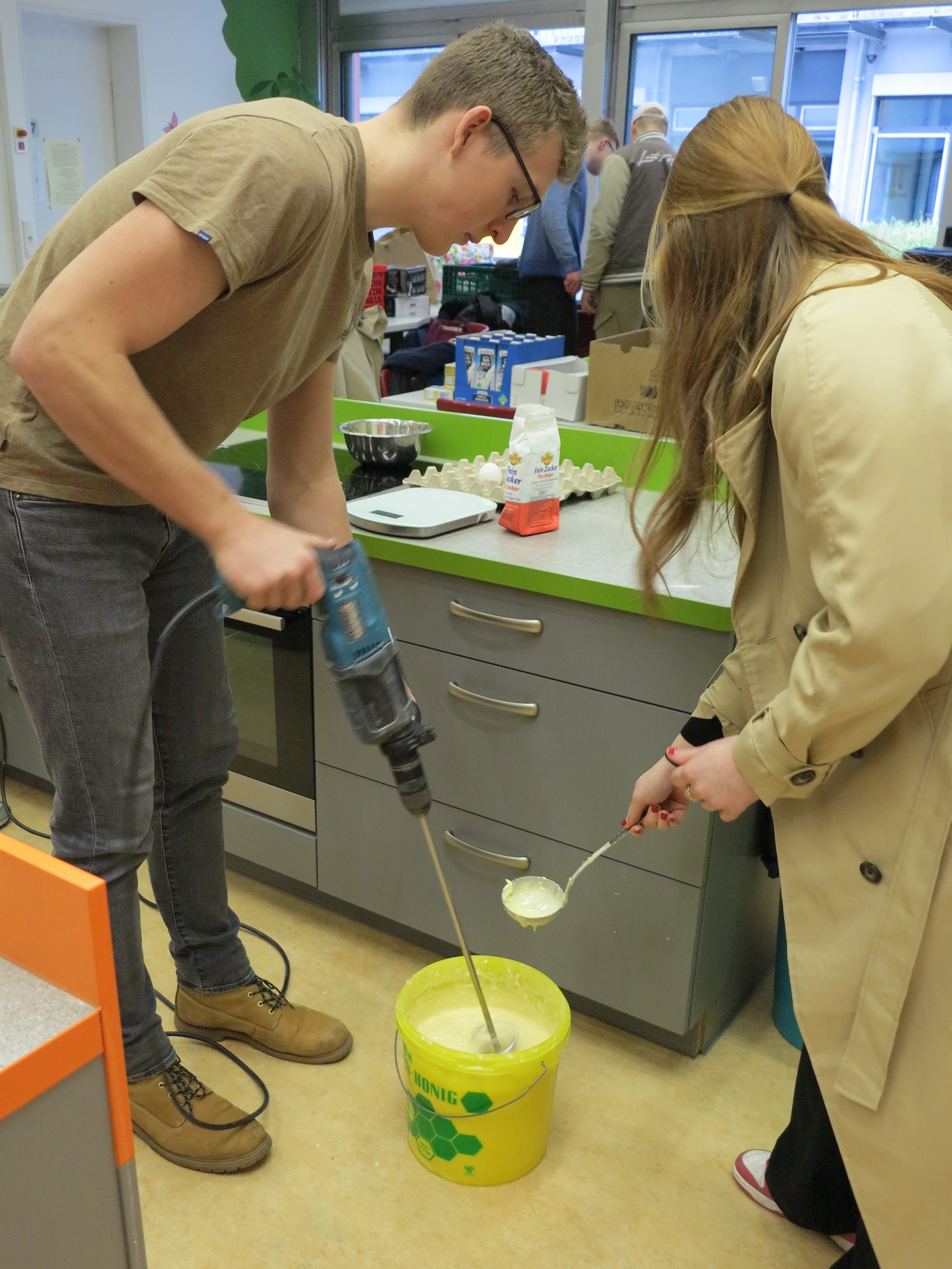 Die Schulküche glich dabei oft eher einem Strandrestaurant in der besten Urlaubszeit, innerhalb von vier Stunden wurden etwa 1.000 Waffeln von den fleißigen Waffelbäckerinnen und -bäckern produziert und der Andrang schien bis zum Schluss kein Ende zu nehmen. Eine Freude für viele Kinder war überdies das Angebot des Waffelpakets, bei dem interessierte Lehrkräfte 30 Waffeln für ihre Klassen bestellen konnten, welche dann sogar in die jeweiligen Klassen geliefert wurden.