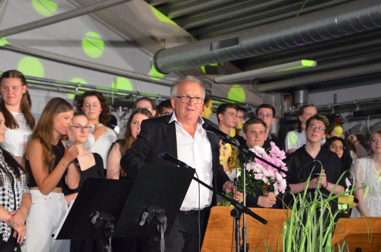 Das letzte Viertel des Konzertabends gehörte dem Schulchor unter Leitung von Armin Müller. Vermutlich niemand habe damit gerechnet, so der Oberstudienrat bei seinem letzten Konzert als WvO-Musiklehrer, dass nach der Corona-Zwangspause binnen kurzer Probenzeit wieder ein so kräftiger Chor von fast 30 Sängerinnen und Sängern zusammenkommen würde. Die Freude darüber war dem „WvO-Showman“ – Zitat von Fachsprecher und Moderator Ulrich Kögel – deutlich anzusehen. Aus dem Musicalfilm „Greatest Showman“ stammte denn auch eines der Lieder („From now on“), welches der von Armin Müller und Johanna Klöpper gemeinsam trainierte Chor mit strahlenden Gesichtern vortrug. Aber alle, die ihn kennen, wussten: Ohne das Gospel-Genre wäre Müllers Abschied musikalisch und inhaltlich nicht komplett gewesen. So endete der Abend mit „God is good“ und mit „Freedom is coming“, dem eisernen Repertoire des WvO-Chors. Beim letzten Song reihten sich zahlreiche ehemalige Schülerinnen und Schüler sowie die Familie des Breitscheiders in die Riege der Sängerinnen und Sänger ein, sodass der Abend in einem zwar etwas wehmütigen, aber doch auch fröhlich-familiären Finale gipfelte.