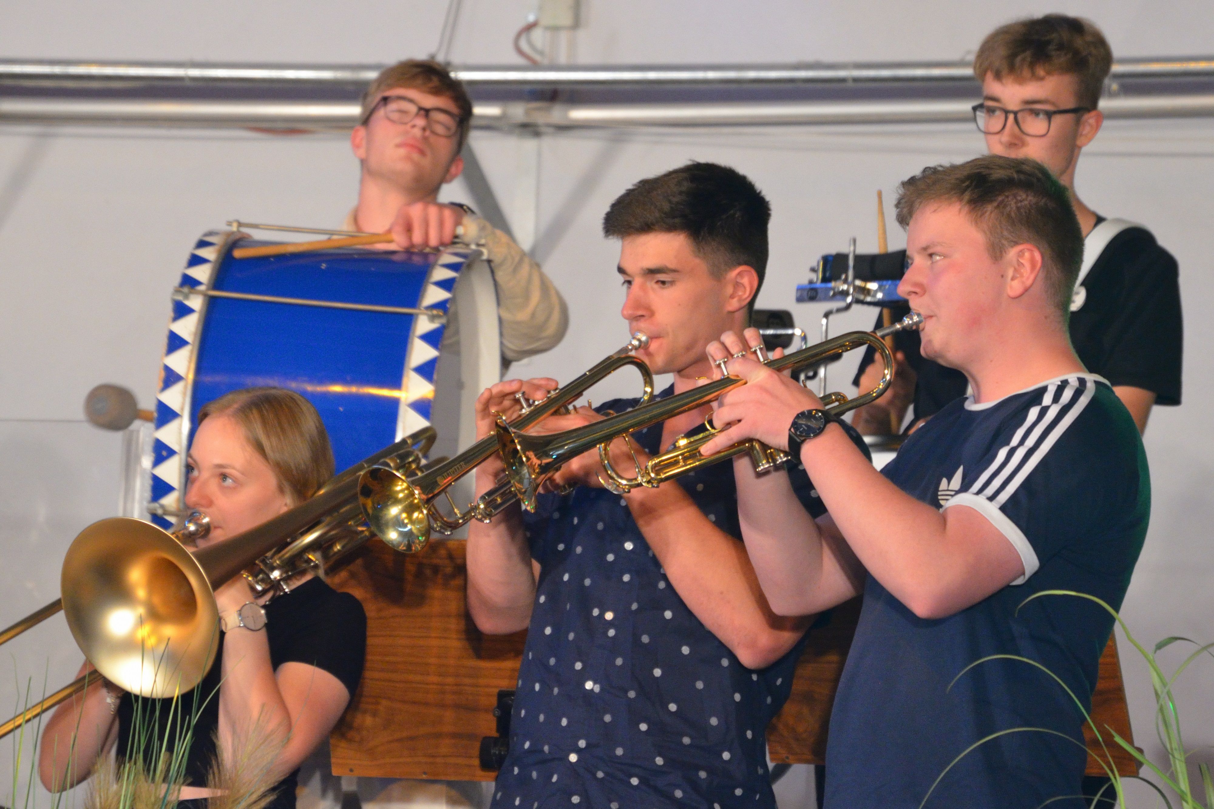 Vorjahressieger beim Wetzlarer Straßenmusikfestival war die WvO-Streetband, die nun folgte und ihren vermutlich letzten großen Auftritt hatte, denn die meisten Mitspieler sind Abiturienten und werden bald in den viel zitierten „Ernst des Lebens“ verabschiedet. Aber beim Konzertabend gaben die sechs Bläser und zwei Schlagwerker nochmal alles. Mit „Cold Duck Time“ von Eddie Harris, „Back to black“ von Amy Winehouse und dem Evergreen „I got you“ von James Brown bot die Truppe unter Leitung von Trompeter Nicolas Grebe ein Highlight des Abends in Rhythmik und Lautstärke. Der Sound einer Streetband braucht nun mal keinen Verstärker, um die Zuhörer zu begeistern. Publikumsliebling war wieder einmal Nikita Werner, der mit seinem Bass-Saxophon spürbar für „good vibes“ im Raum sorgte.