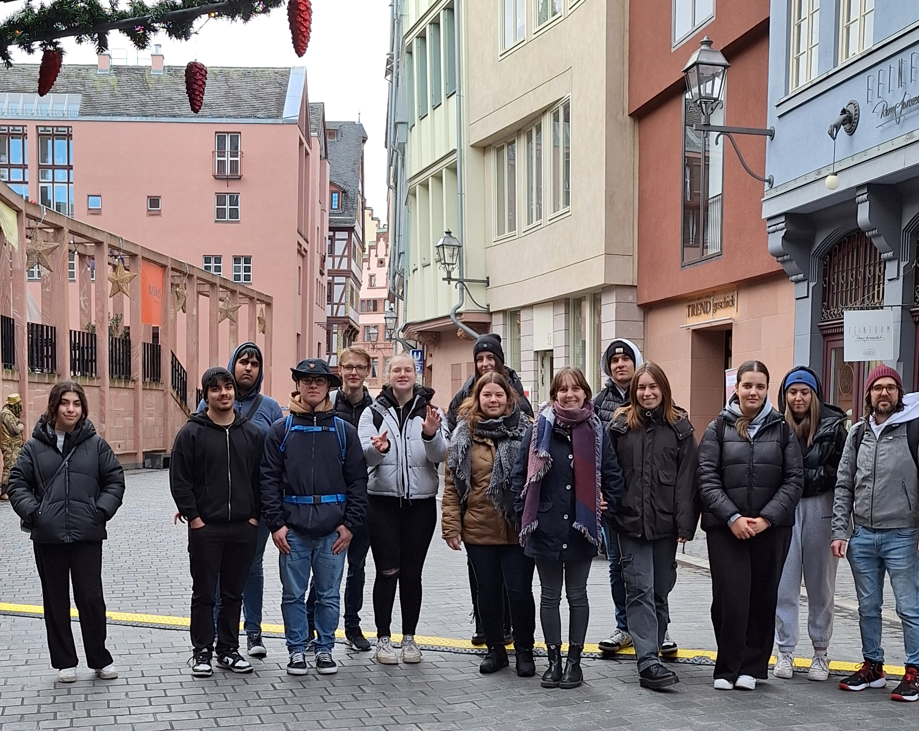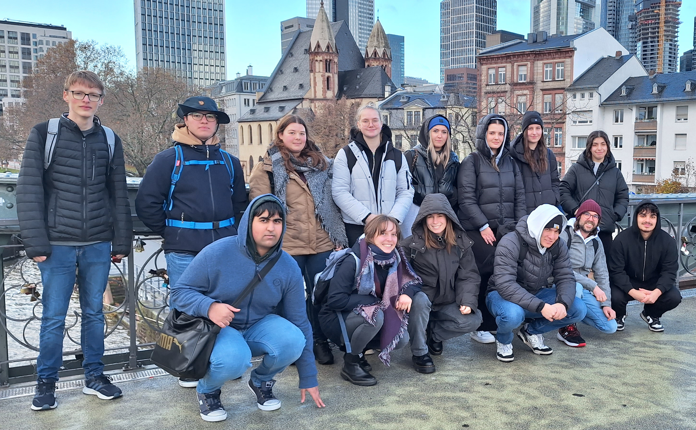 Am Freitag, den 24.11.2023 führten die beiden Q3-Kunstkurse von Moon Lindemann und Sascha Schulze eine Exkursion nach Frankfurt mit einem Architekturrundgang durch. Ziel war es, eine „Reise durch die Architekturgeschichte“ zu machen, die in Frankfurt besonders eindrucksvoll erfahrbar wird. Die zu besichtigenden Bauten reichten von den Funden aus der Römerzeit (Kaiserpfalz) aus dem frühen 9. Jahrhundert bis zum neusten Bauprojekt „Four“ zwischen Gallus- und Junghofstraße, das voraussichtlich erst 2025 fertiggestellt werden soll.