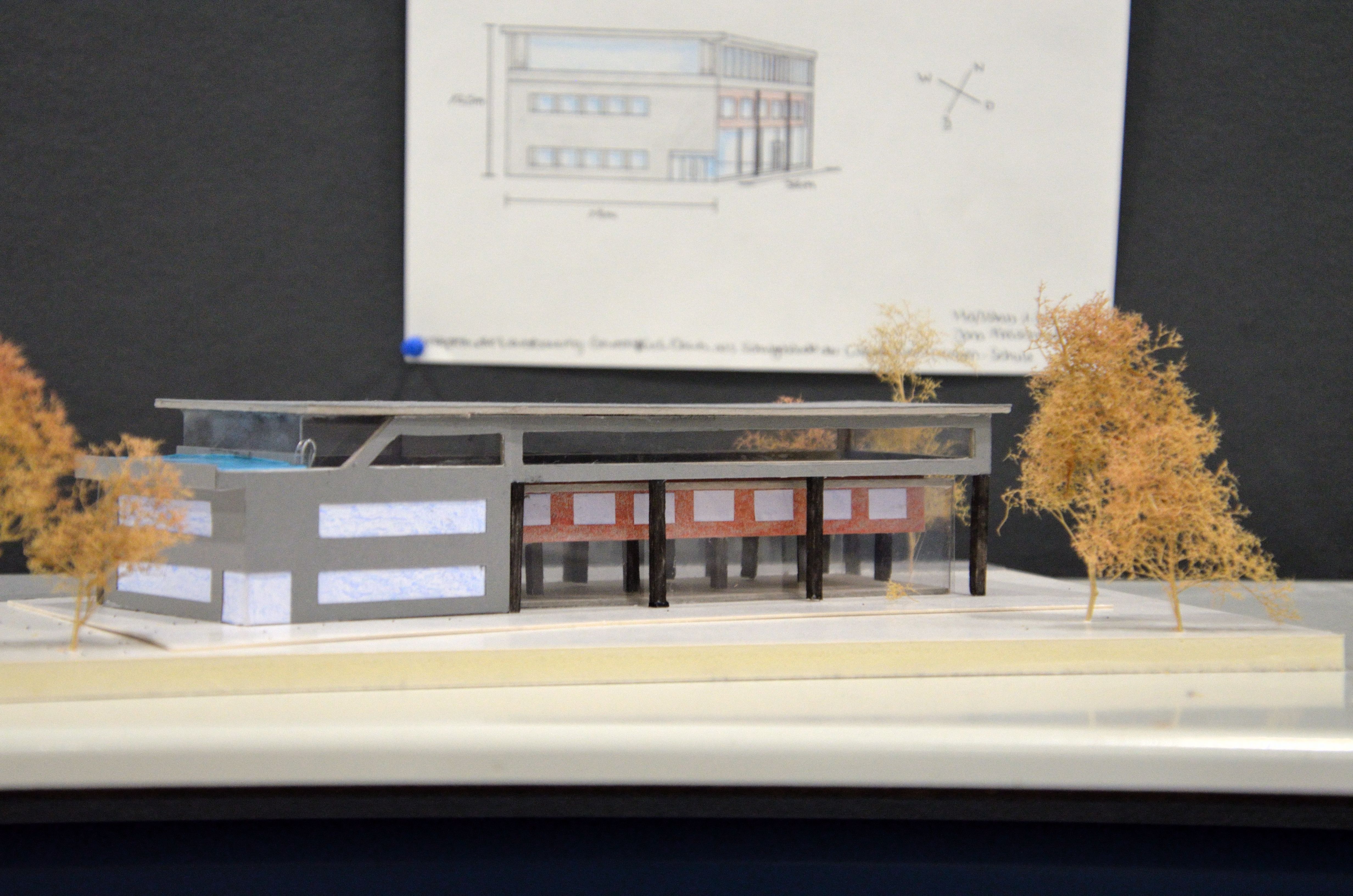 Im Forum der Schule wurden die Kunstwerke über mehrere Wochen der Schulöffentlichkeit zur Ansicht ausgestellt. Anfang Februar nahmen sich außerdem die Schulleitungsmitglieder Martin Hinterlang, Andrea Stühler, Stefan Riemer und Markus Hoffmann Zeit, die Entwürfe genauer zu sichten und sich vom hauseigenen Architekturnachwuchs erklären zu lassen. Die Pläne und Modelle waren mal sehr fantasievoll, mal sehr nüchtern und realistisch, aber allesamt durchdacht und faszinierend abwechslungsreich gestaltet. Es zeichnete sich aber ab, dass es ein gewisses Grundbedürfnis der Schülerinnen und Schüler gibt, genügend „Frei“-Raum zur Erholung und Interaktion zur Verfügung zu haben. Zahlreiche Entwürfe warteten mit einem Pool oder begrünten Dachterrassen auf.