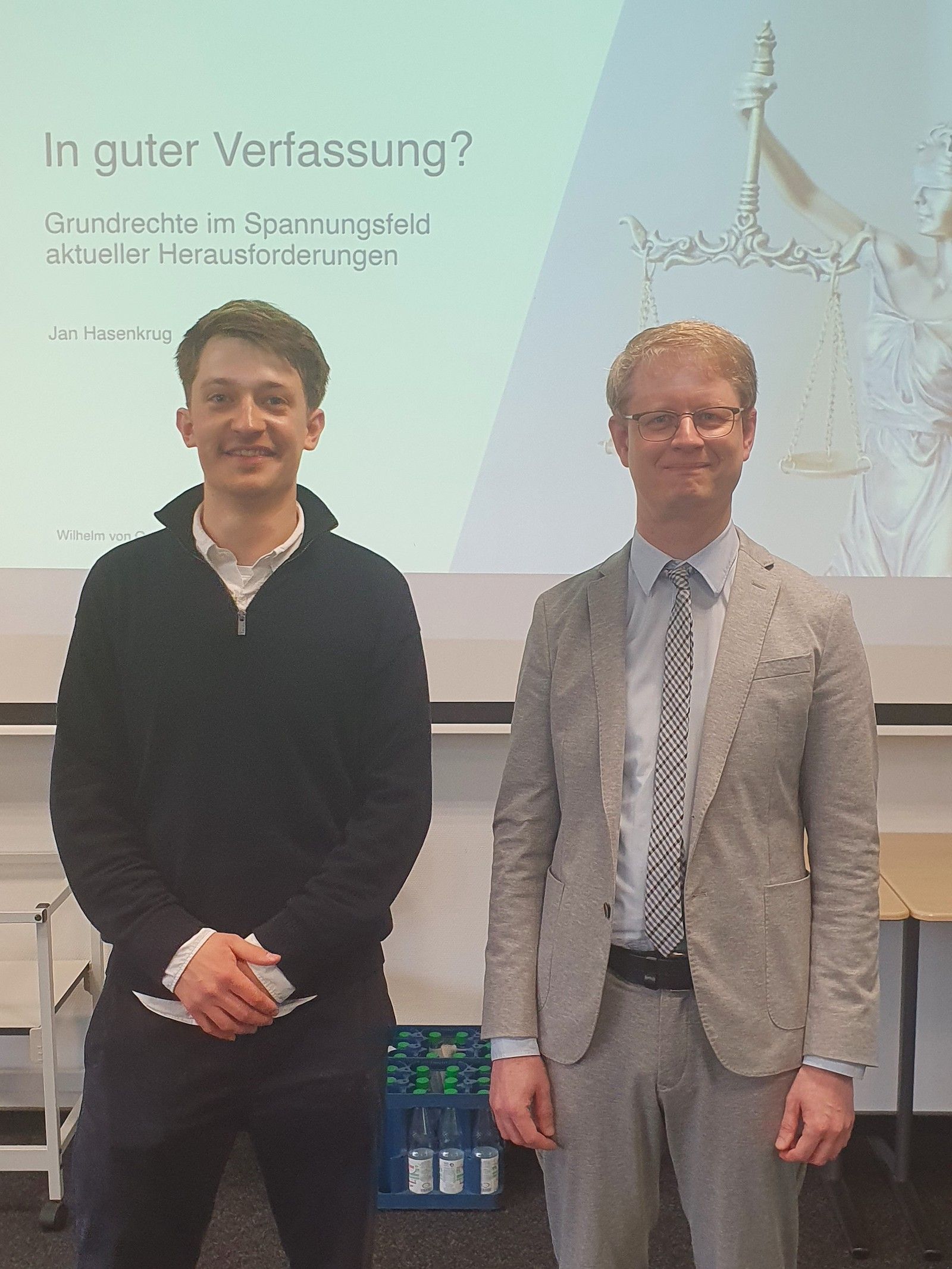 Am 21. Juni besuchte Jan Hasenkrug, Bachelor der Politikwissenschaften und momentan Student an der juristischen Fakultät der Universität Münster, seine ehemalige Wirkungsstätte, um sein Wissen an Schülerinnen und Schüler der Jahrgangsstufen 10 bis Q4 weiterzugeben, die an der von Jan Harms geleiteten Begabtenförderung teilnehmen.