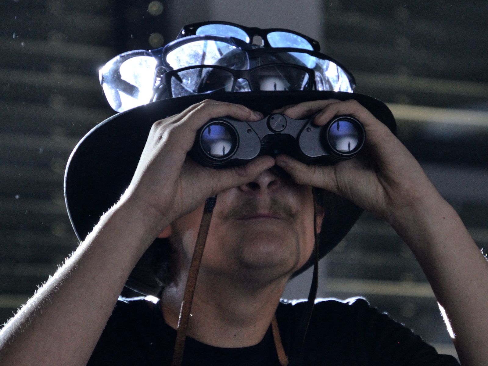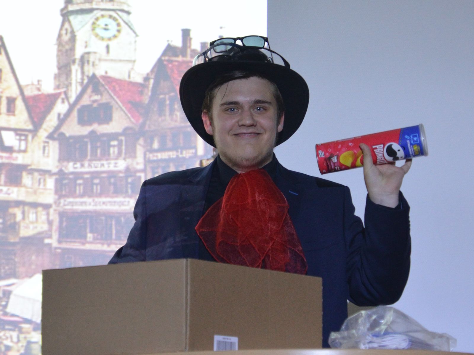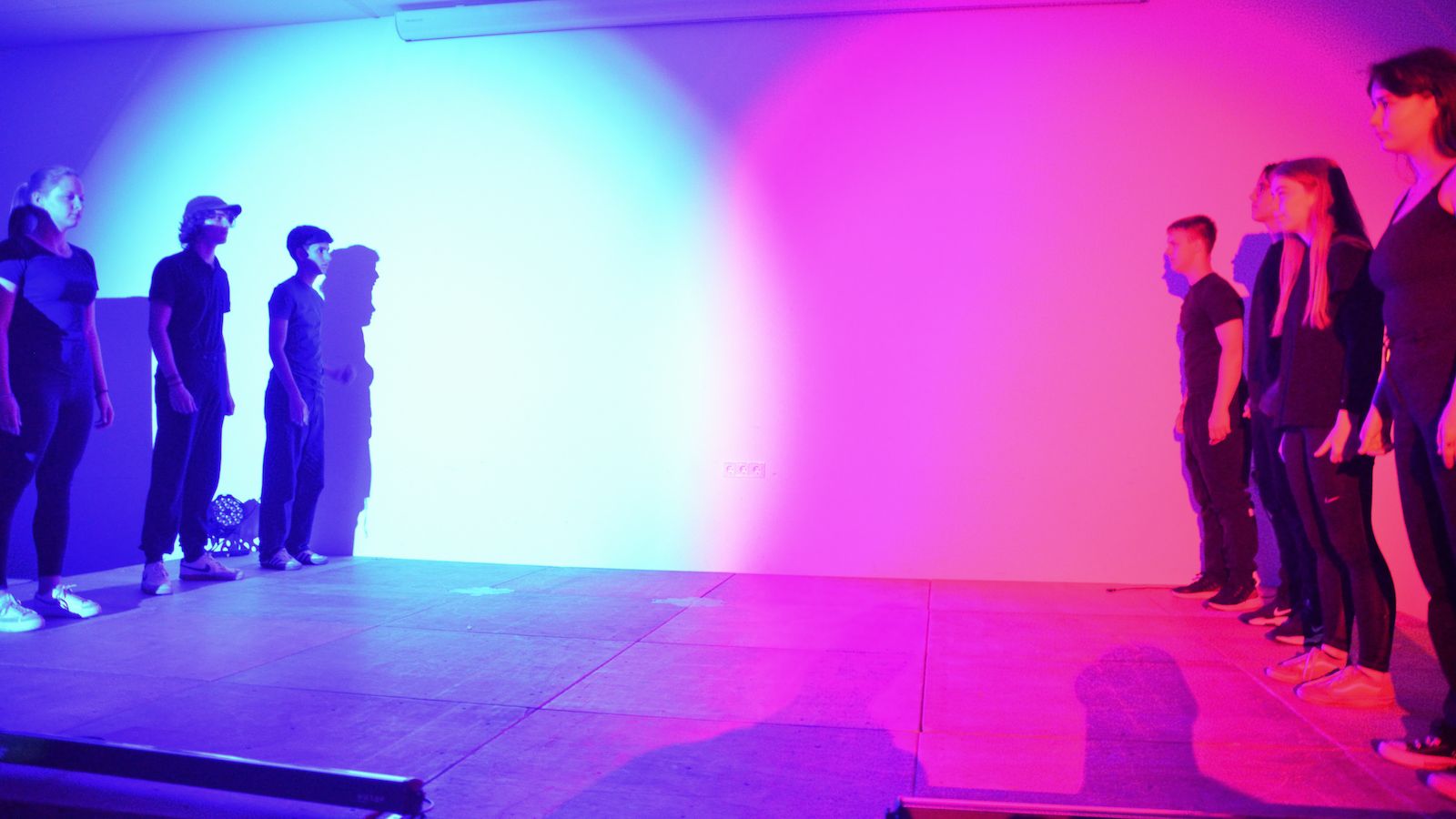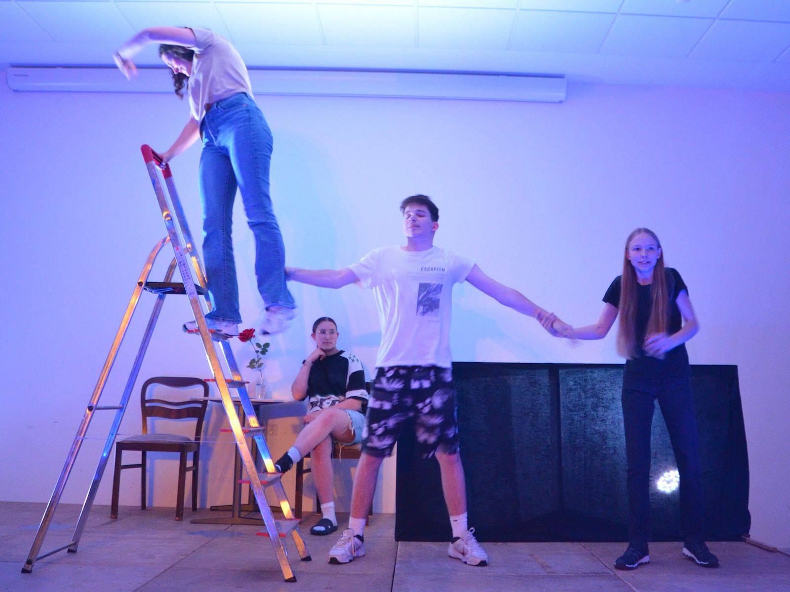 Der jüngste Theaternachwuchs, der beim Festival sein Stück präsentieren durfte, war der Wahlunterrichtskurs 10 von Harald Minde mit dem Stück „Und es hat ZOOM gemacht“. Nicht ohne Grund war auf dem Werbeplakat die Warnung „FSK ab 12“ abgedruckt, denn es wurde auffällig viel und auffällig spektakulär gestorben in dieser Collage aus Spielszenen und Rezitationen von Liedtexten aus Liebesliedern und Schnulzenschlagern. Die groteske Montage von ausgelutschten Zuneigungsbekundungen einerseits und Katastrophen mittleren bis globalen Ausmaßes andererseits – von Stromschlägen bei ungeschickten DIY-Arbeiten bis Atombombenexplosionen war so ziemlich alles dabei – bot sowohl Raum für die große Spielfreude der Mannschaft wie auch für die Minde-typischen pantomimischen Slapstickeinlagen.