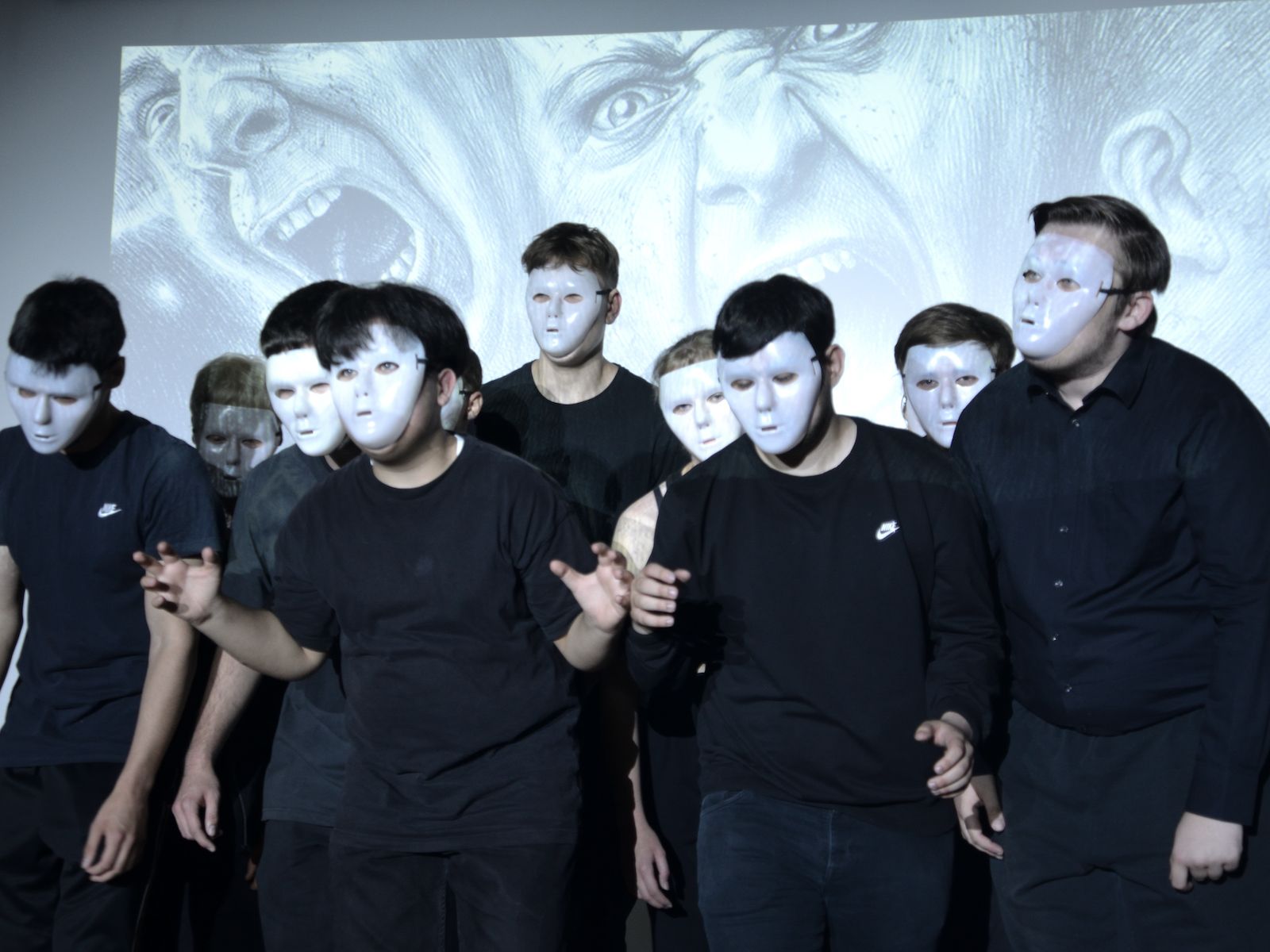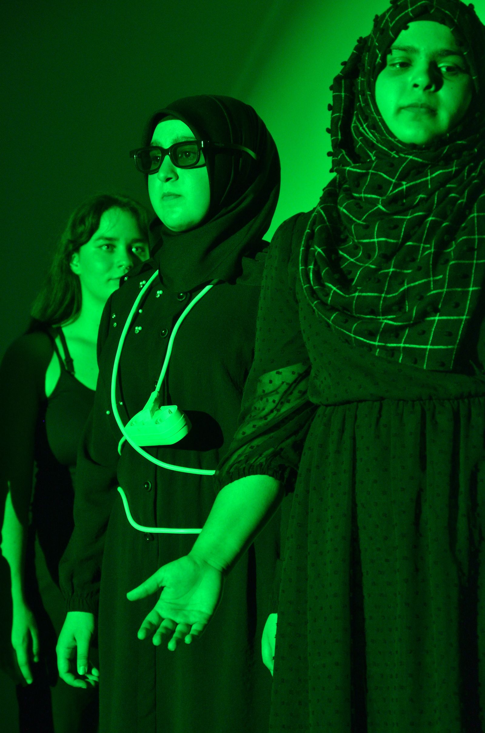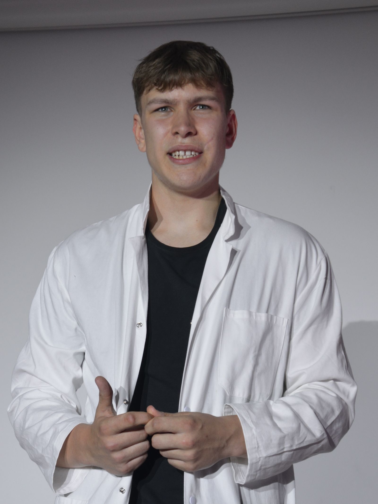 Die Schauspieler des E2-Kurses präsentierten also das selbst(?) geschriebene Stück „Aura macht Theater – ein Stück von, mit und über KI“, in welchem die Experimente eines finanziell klammen Wissenschaftlers mit Künstlicher Intelligenz gänzlich aus dem Ruder laufen und schließlich zu einer Spaltung der Gesellschaft in Pro-Aura-Aktivisten und Widerstandskämpfer führen. Im Stil von Brechts Epischem Theater wurde jeder Akt vorher mit einer kurzen Inhaltsangabe eingeführt und dann die Spirale der gesellschaftlichen Eskalation eindrucksvoll weitergedreht, bis sogar in Talkshows auftretende Minister KI-gesteuerte Statements herunterratterten. Die Chancen, aber noch mehr die Gefahren einer außer Kontrolle geratenen KI wurden dem Publikum in „Aura“ auf beklemmende Art und Weise vor Augen geführt.
