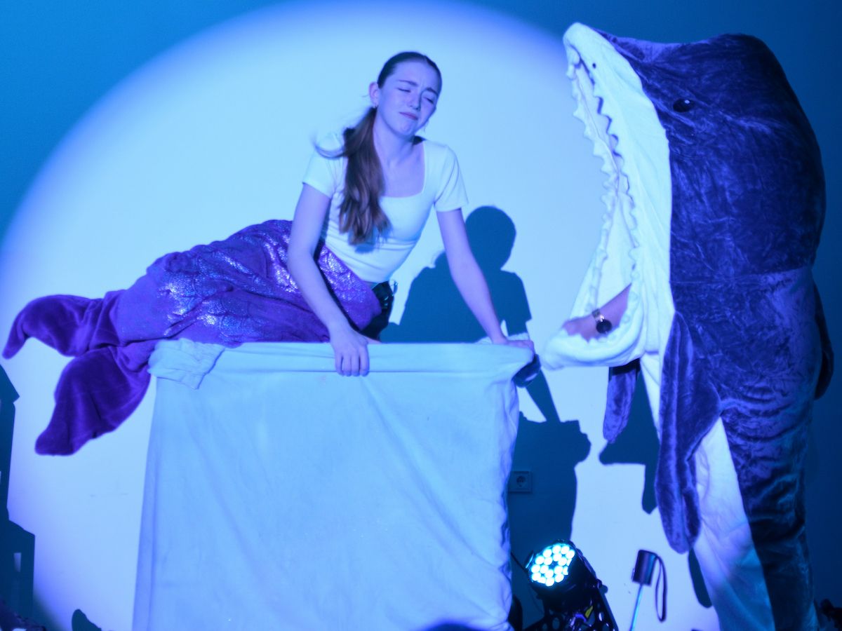 Vordergründig einem älteren literarischen Stoff zugewandt, doch thematisch in dieselbe Kerbe schlug der Q2-Kurs von Jana Gehlen, der sich E.T.A. Hoffmanns Nachtstück „Der Sandmann“ widmete, welcher zugleich in Hessen Abiturlektüre ist. Die Truppe machte aus der Vorlage ein „Sandmännchen“ und verarbeiteten die Parade-Erzählung der Schwarzen Romantik in kurze Spielszenen mit manchmal eher schwarzem Humor und mit wechselnder schauspielerischer Besetzung. So wusste man als Zuschauer manchmal nicht, ob man mit dem armen Nathanael, der – vom grausamen Advokaten Coppelius als Kind traumatisiert – eher Mitleid haben oder ihn auslachen sollte, wenn er dem zwielichtigen Wetterglashändler Coppola und noch viel mehr dem Automatengeschöpf Olimpia auf den Leim ging. Sehr hellsichtig hat E.T.A. Hoffmann in dieser Figur die Ängste vor den Täuschungen durch Künstliche Intelligenz vorausgeahnt, sodass auch in diesem Stück der rote Faden des Abends aufgegriffen wurde.