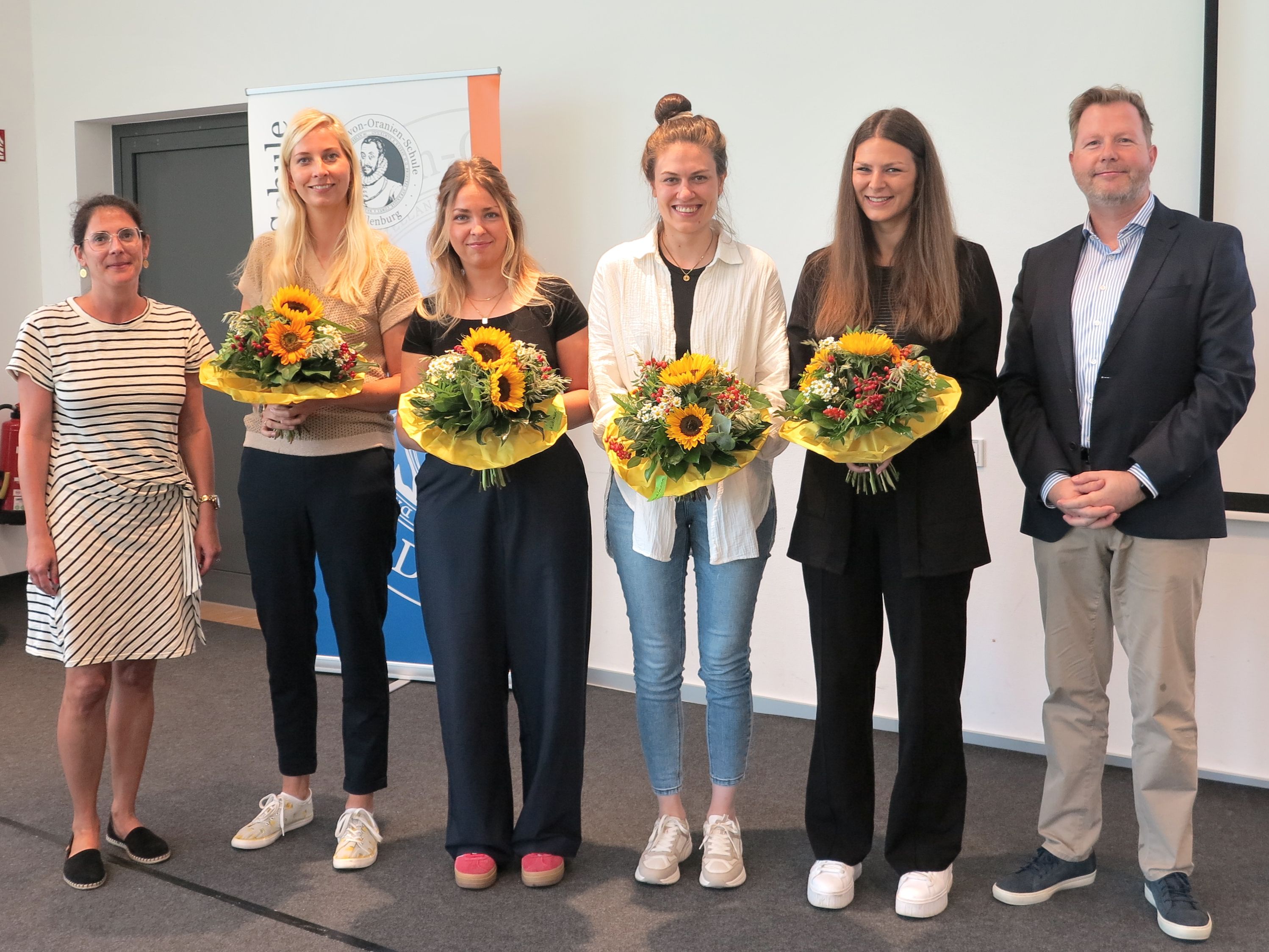 Vier neue Lehrerinnen an der WvO, flankiert von der Personalratsvorsitzenden Julia Schäfer-Schmitt (l.) und Schulleiter Martin Hinterlang (r.): Dr. Catharina Löffler, Janine Halfmann, Anna Hehl und Elisa Preis (von links)