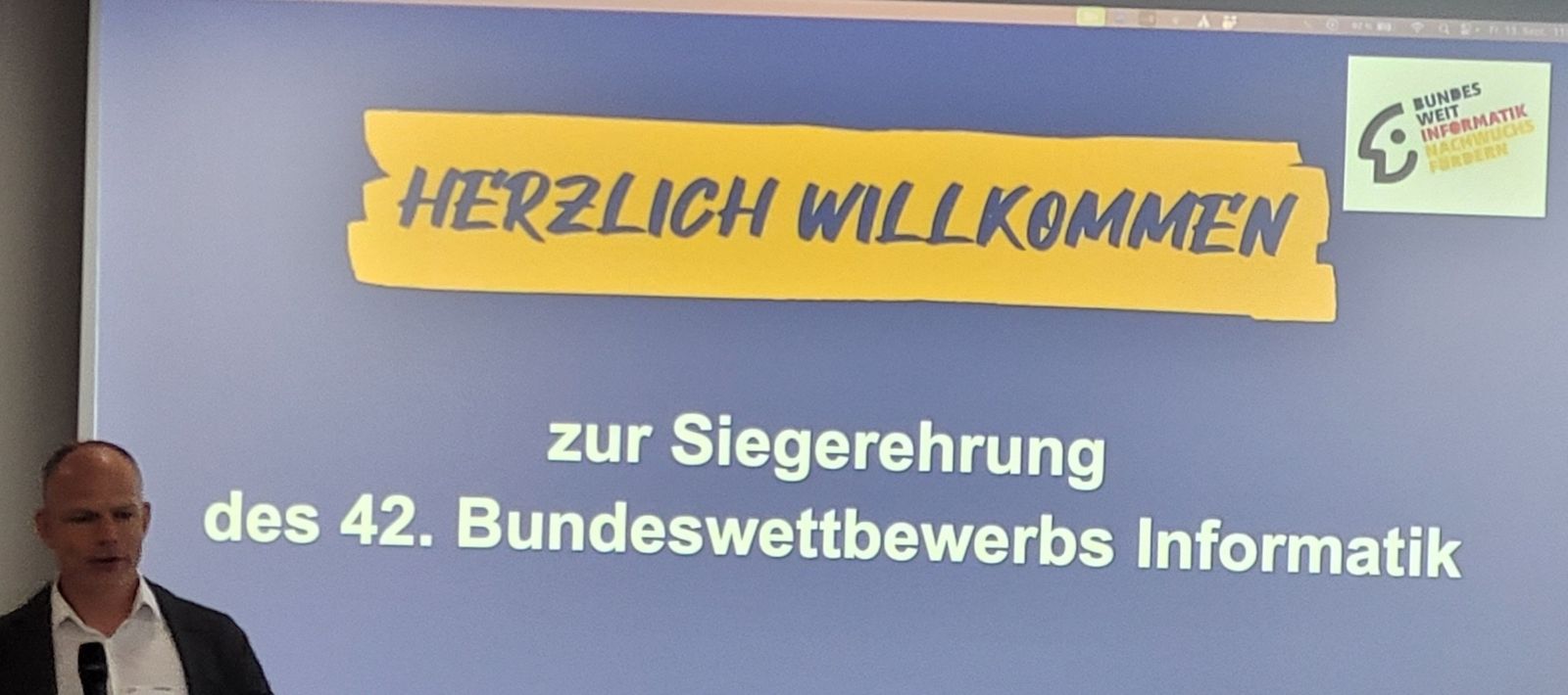 Am Nachmittag wurden alle per Busshuttle zum diesjährigen Veranstalter CHECK24 ins Stadtzentrum gebracht. Hier wurden alle Teilnehmer vom Geschäftsführer des Bundeswettbewerbs Informatik, Herr Dr. Wolfgang Pohl, begrüßt und ihnen zur Zulassung zur Finalrunde des Bundeswettbewerbs gratuliert. Herr Dr. Pohl unterstrich die Leistung der Finalistinnen und Finalisten noch einmal, indem er die diesjährigen Teilnehmerzahlen der Wettbewerbe darstellte: