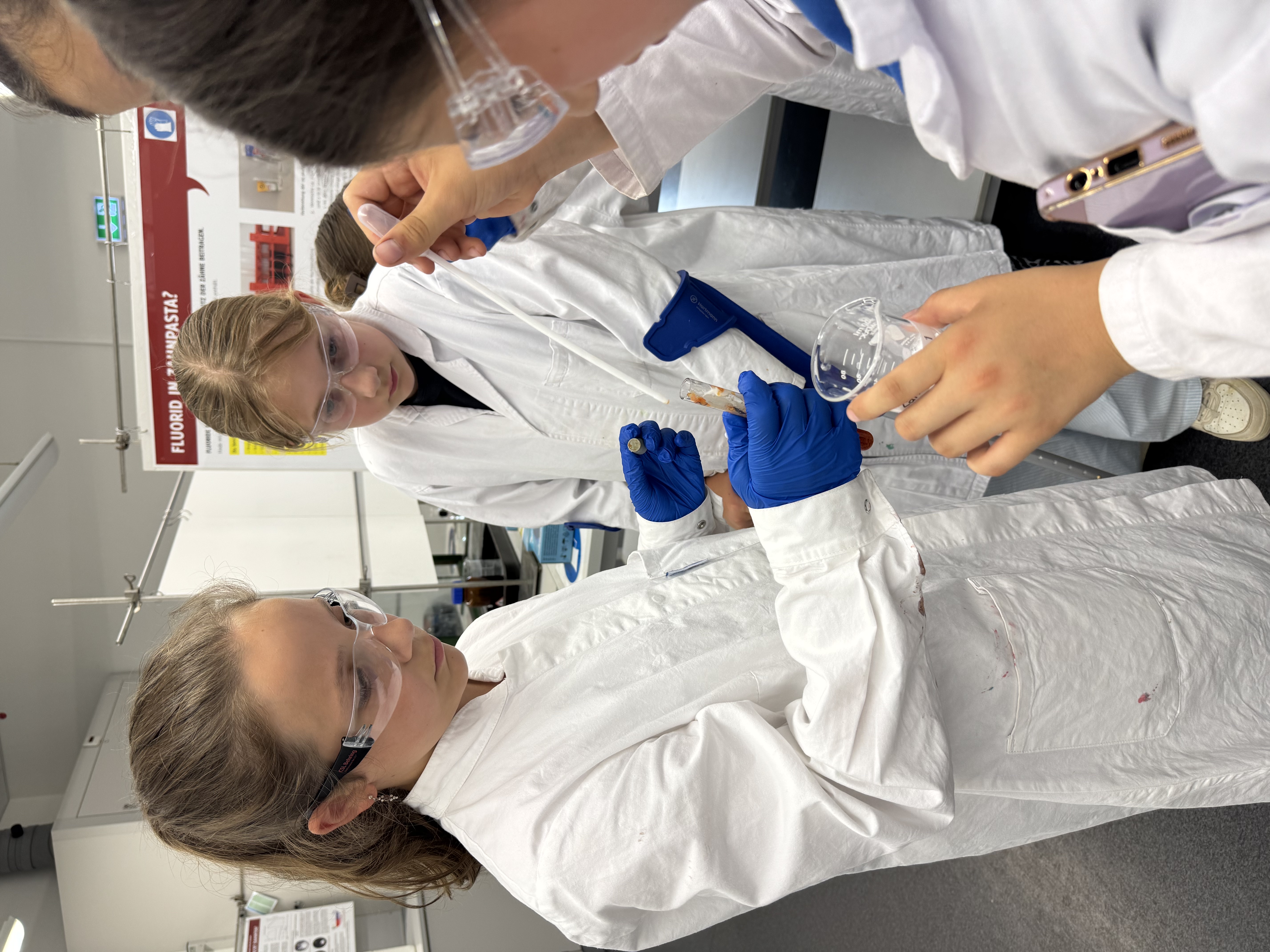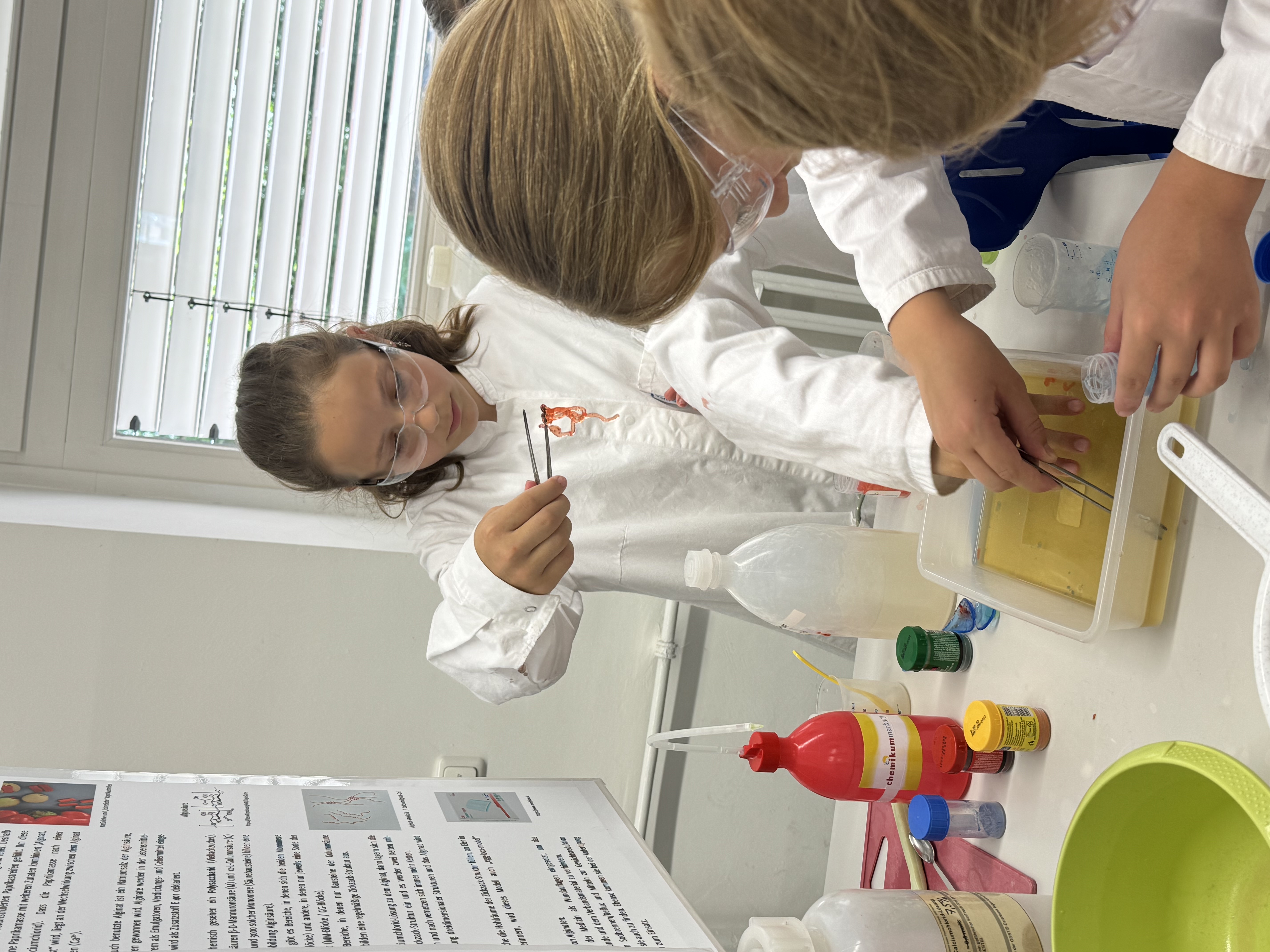 Am 02.07.2025 machten sich die drei Kurse der Jahrgangsstufe 5, geleitet von Anna Hehl, Timo Jung und Wolfgang Stowasser, auf den Weg ins Chemikum. Ausgestattet mit Laborkittel und Schutzbrille konnten die jungen Forscherinnen und Forscher vor Ort in kleinen Gruppen eigenständig experimentieren. Dabei nutzten sie ihr Vorwissen aus dem Profilunterricht, um viele spannende Fragen durch praktische Versuche zu beantworten.
