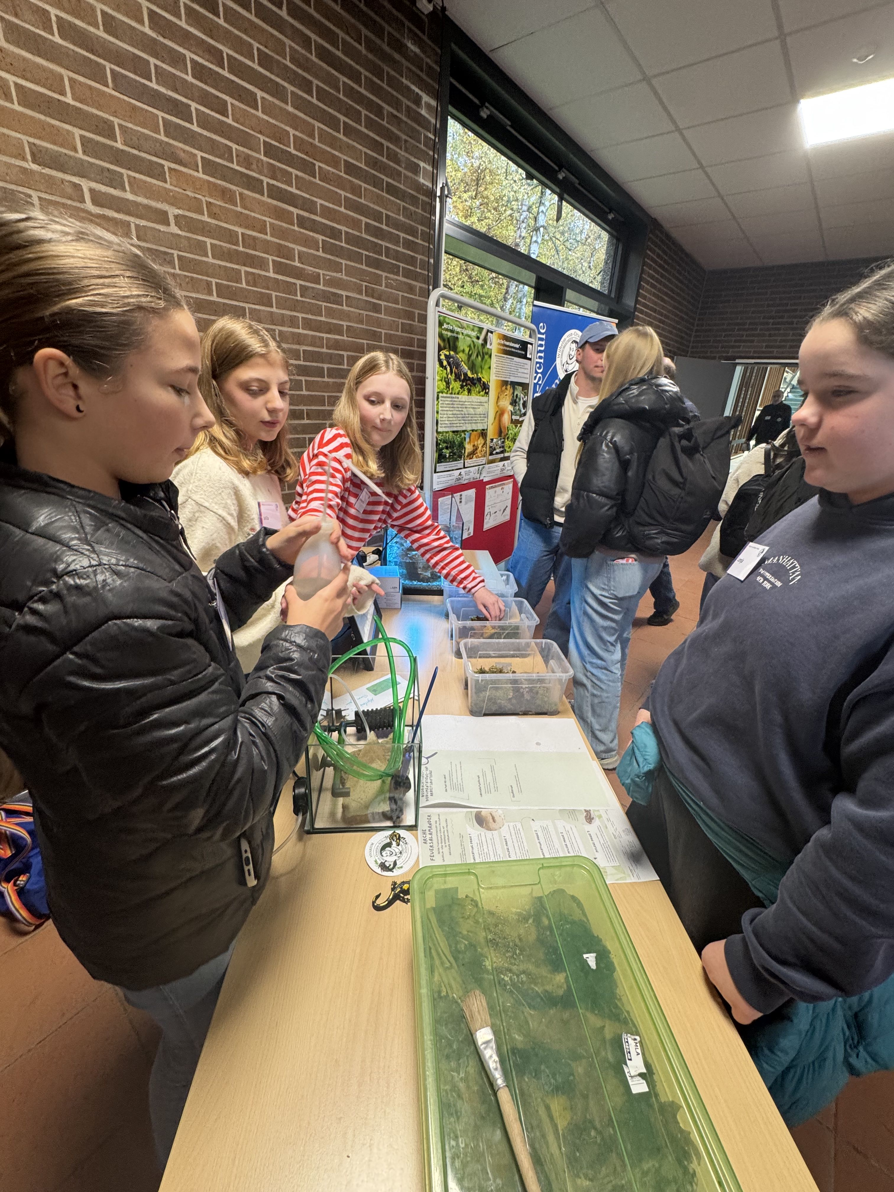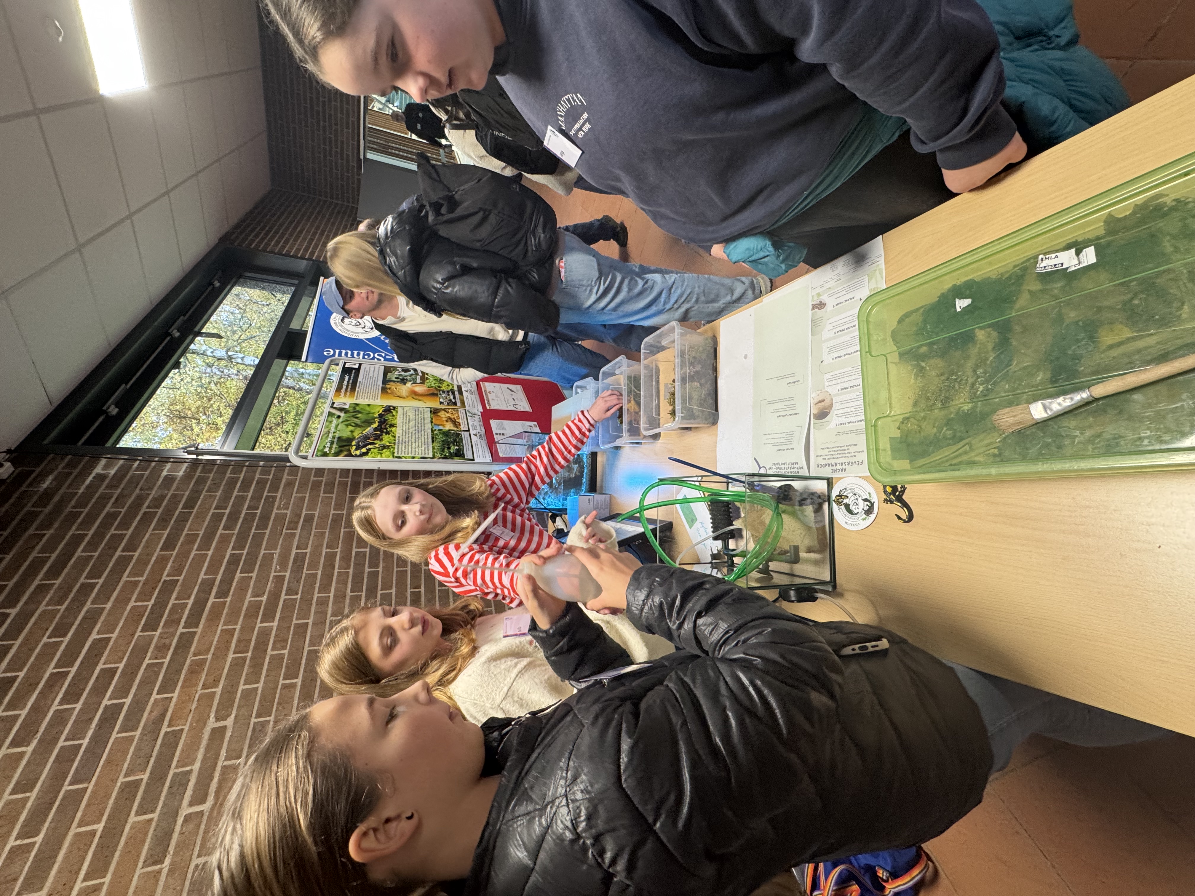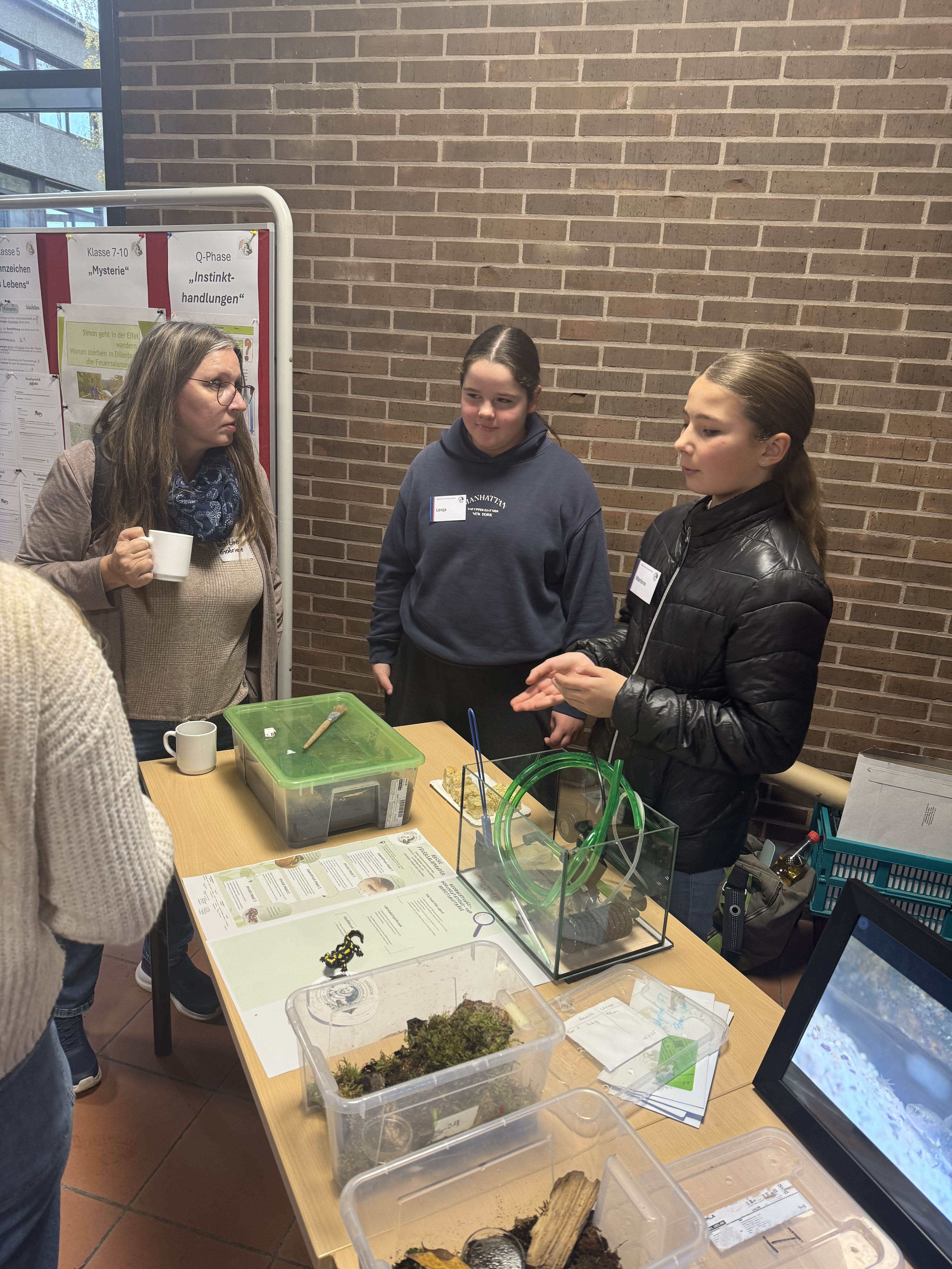 Das WvO-Feuersalamander-Team um die Lehrkräfte Hannah Brill, Simon Grebeldinger, Sedric Haus und Timo Jung wurde von vier Schülerinnen aus der Vivarium-AG nach Gießen begleitet. Vor rund 130 Gästen hatte die WvO die Gelegenheit, ihre pädagogische Arbeit im Rahmen des Projektes vorzustellen. Die Schülerinnen Henriette, Lenja, Marlene und Mila (alle 7c) präsentierten gemeinsam mit ihren Lehrkräften nicht nur Wissenswertes zur Haltung und Pflege der schuleigenen Feuersalamander, sondern auch eigens entwickelte Unterrichtsmaterialien und -sequenzen. Sie beantworteten zahlreiche Fragen, kamen mit Besuchern ins Gespräch und tauschten sich mit Vertretern anderer Institutionen aus.