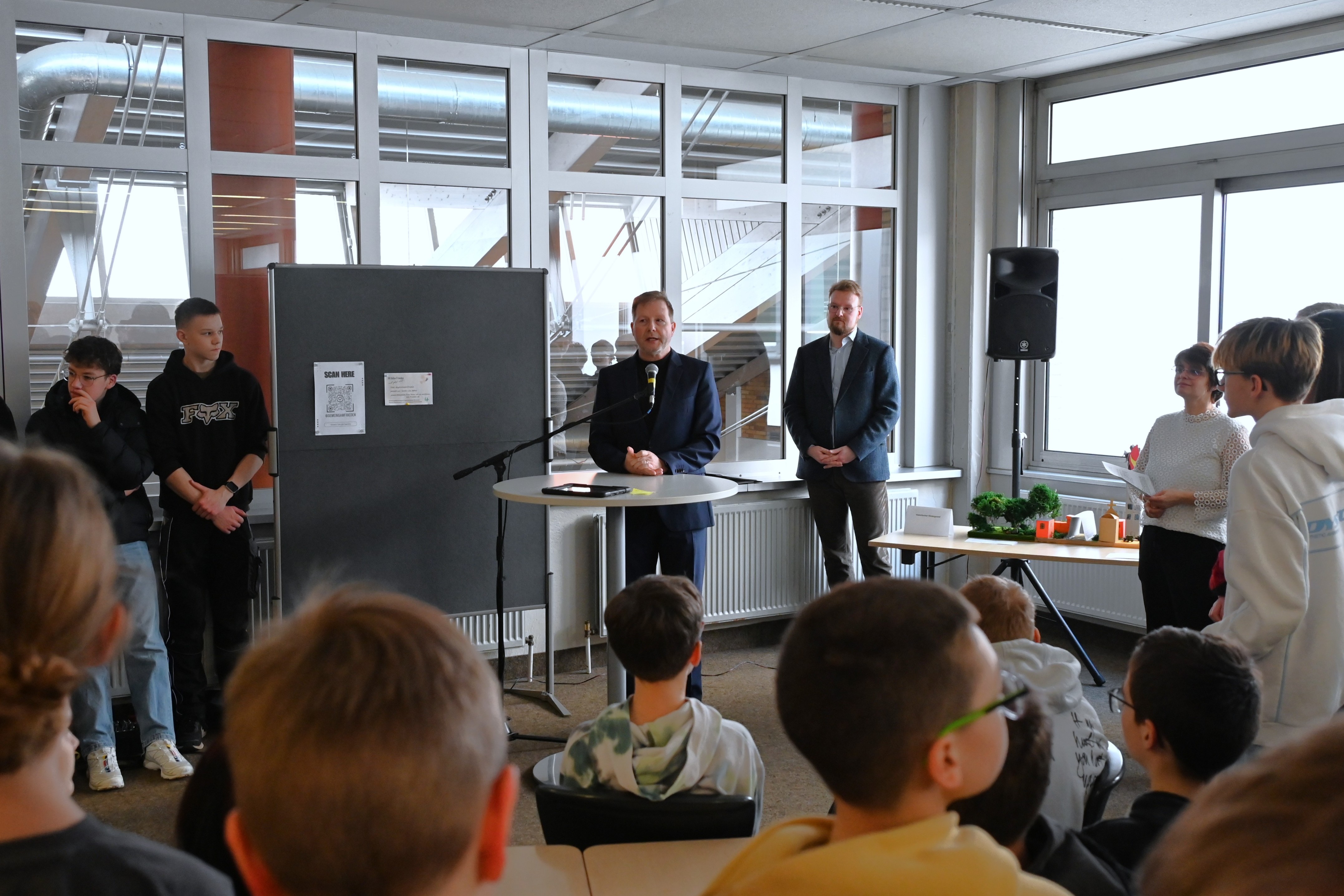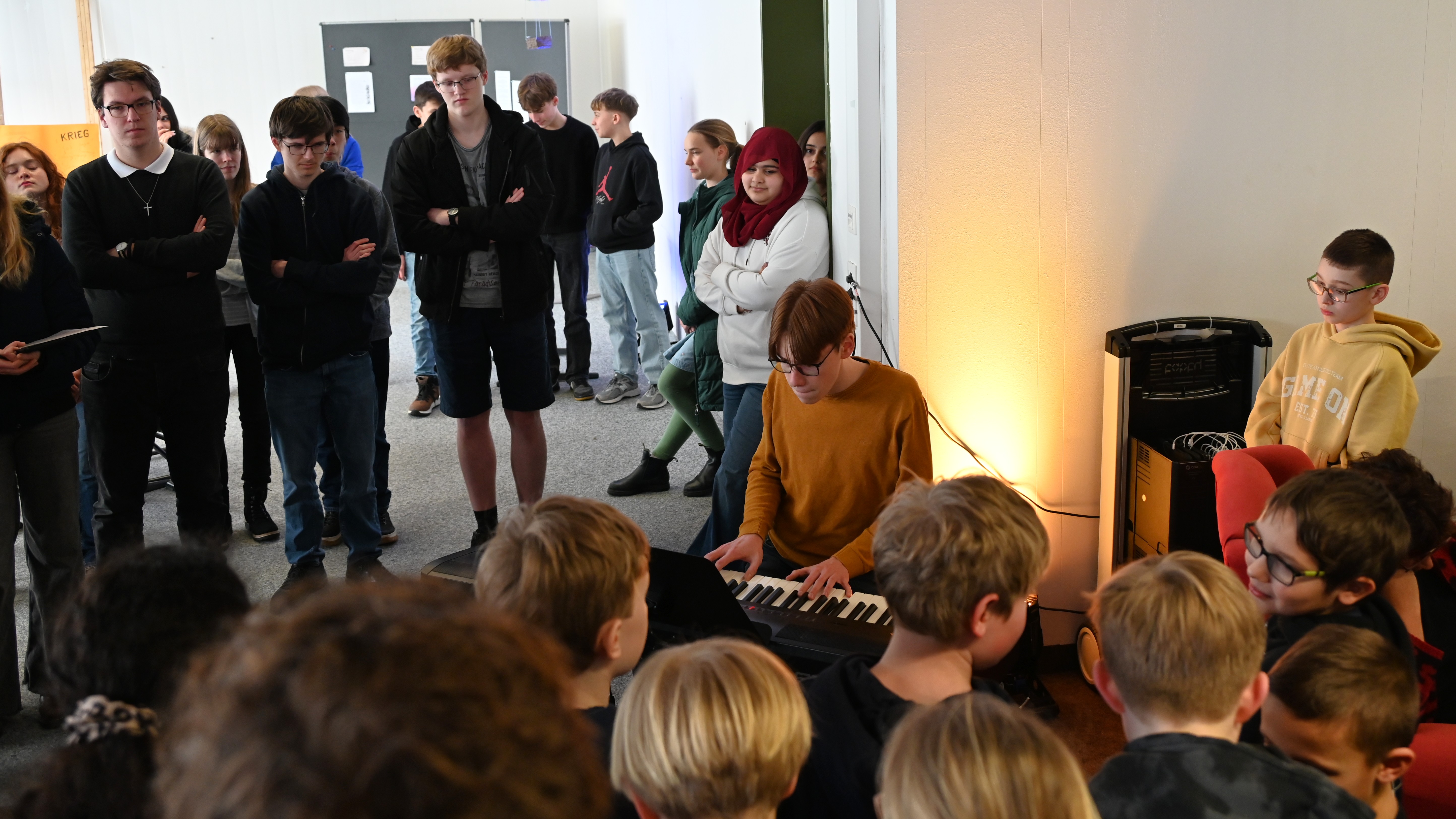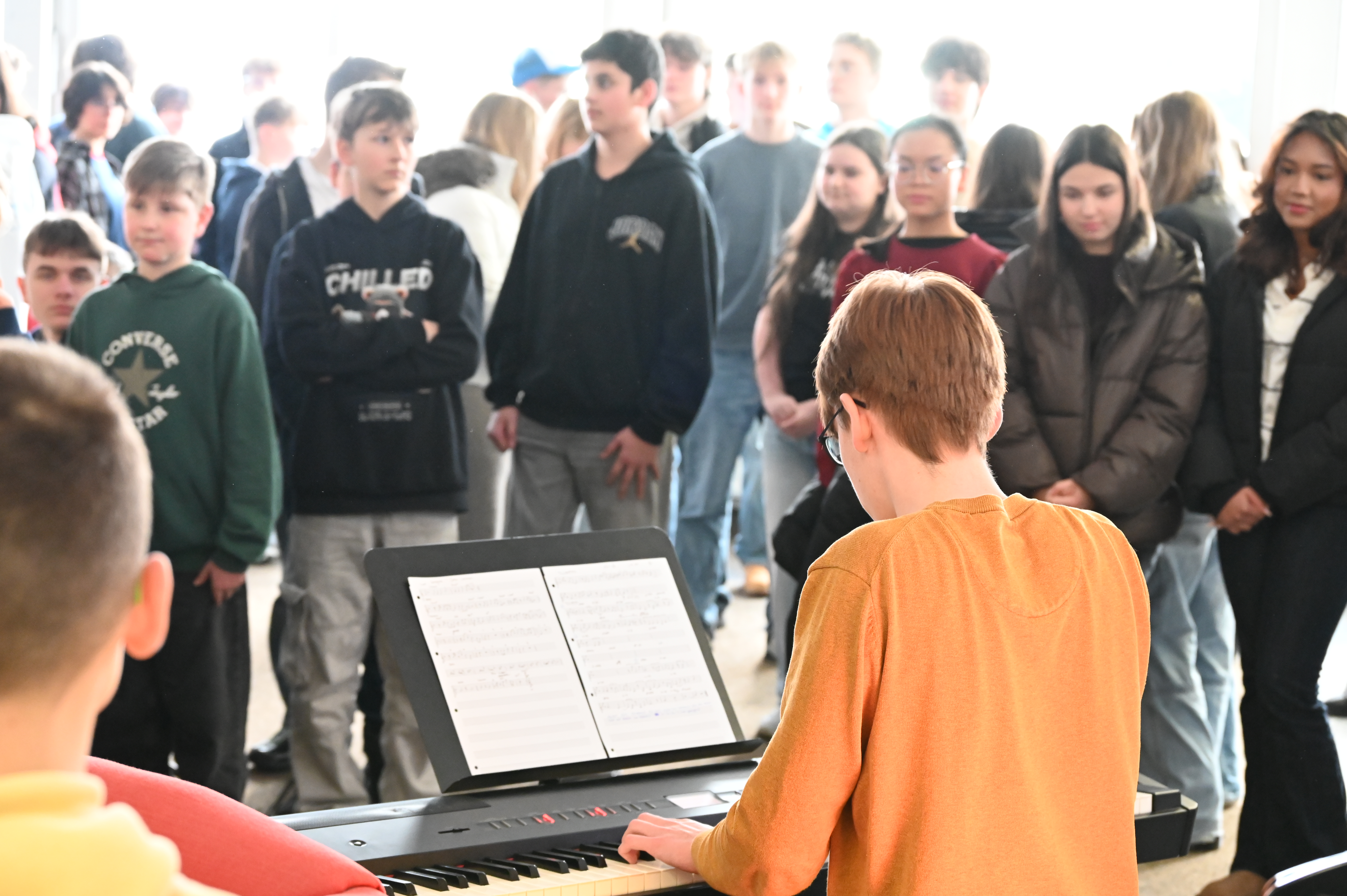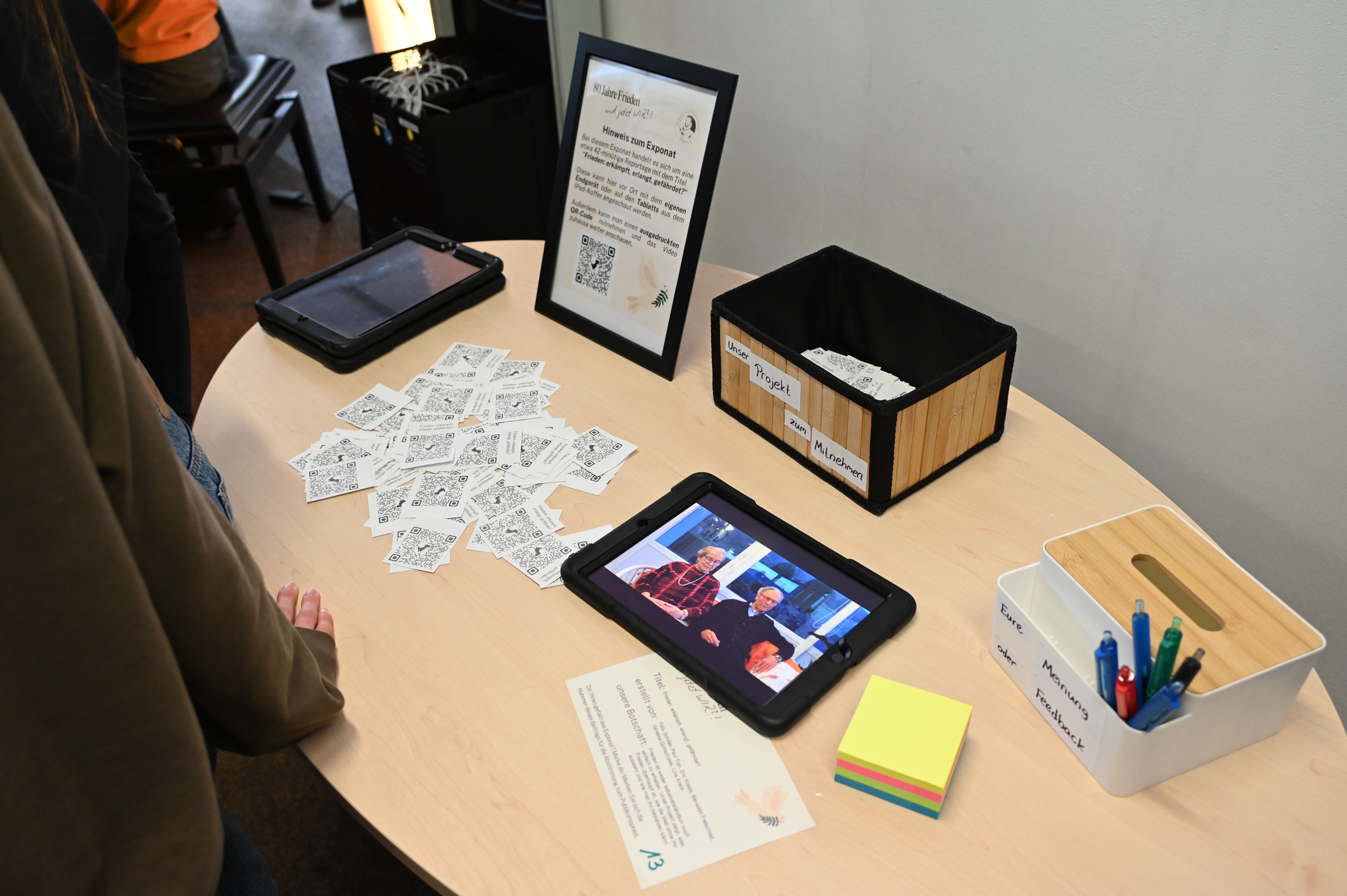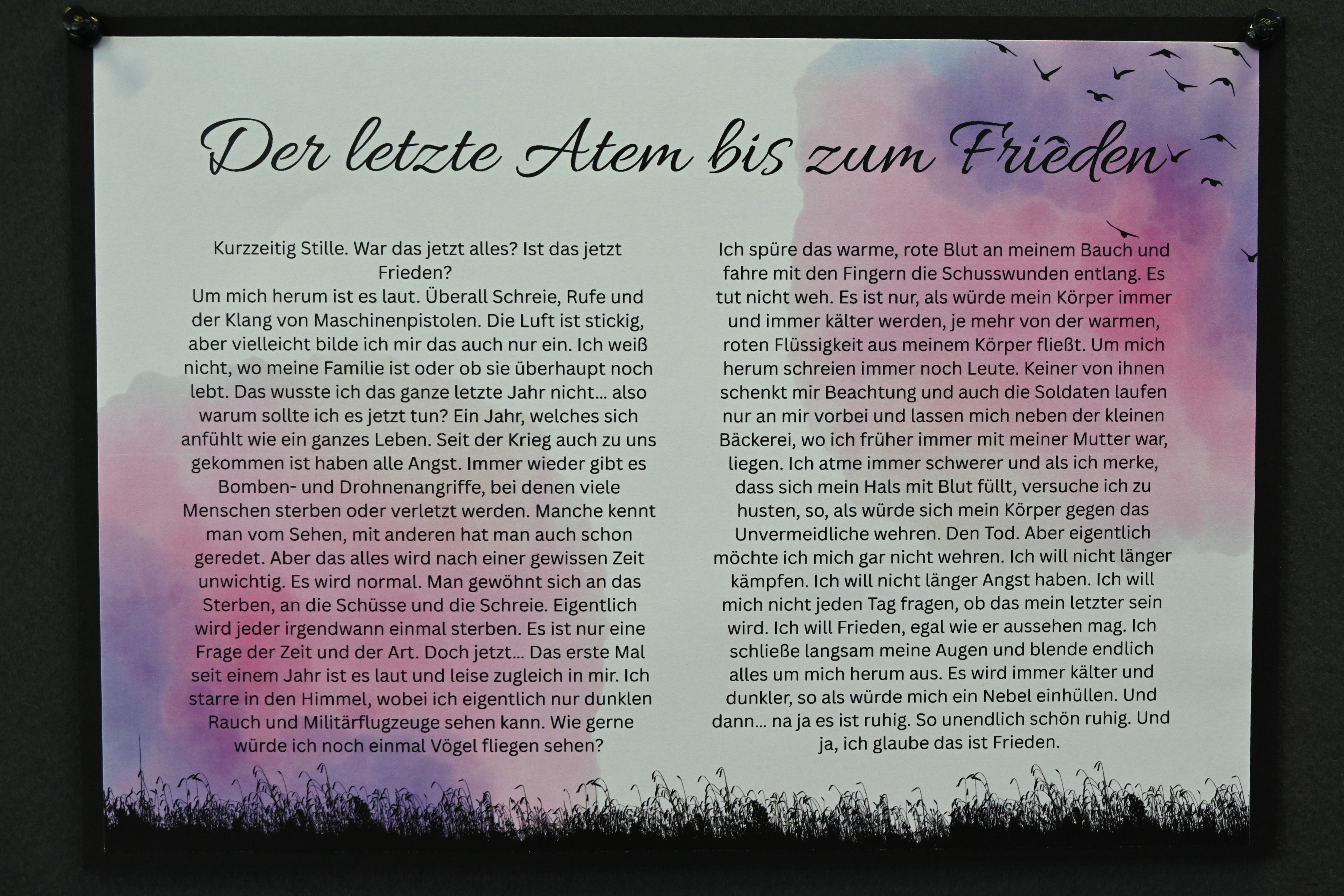 Die aus verschiedenen Klassen oder von Einzelpersonen eingegangenen Wettbewerbsbeiträge wurden nun in einer Ausstellung zusammengetragen und in einer festlichen Vernissage am 2. Februar der Öffentlichkeit präsentiert. Die AG-Mitglieder Kati Weigel und Jonas Seibel begrüßten in ihrer Eröffnungsrede die zahlreichen Gäste: alle Wettbewerbsteilnehmerinnen und -teilnehmer, viele interessierte Schülerinnen und Schüler sowie Lehrerinnen und Lehrer, aber auch Vertreterinnen und Vertreter des Schulelternbeirates. Schulleiter Martin Hinterlang zeigte sich in seinem Grußwort beeindruckt von der Vielfalt an Produkten, die zusammengetragen wurden: Texte in Form von Erlebnisberichten oder Gedichten, Videoclips mit Spielszenen oder Zeitzeugeninterviews, selbstgeschriebene Lieder oder künstlerische Installationen, die das Thema bildlich ergründen, und vieles mehr. Musikalisch umrahmt wurde die Vernissage von Jonatan Schmidt am Piano, der mit John Lennons „Imagine“ dazu anregte, sich eine friedlichere Welt als die jetzige vorzustellen.