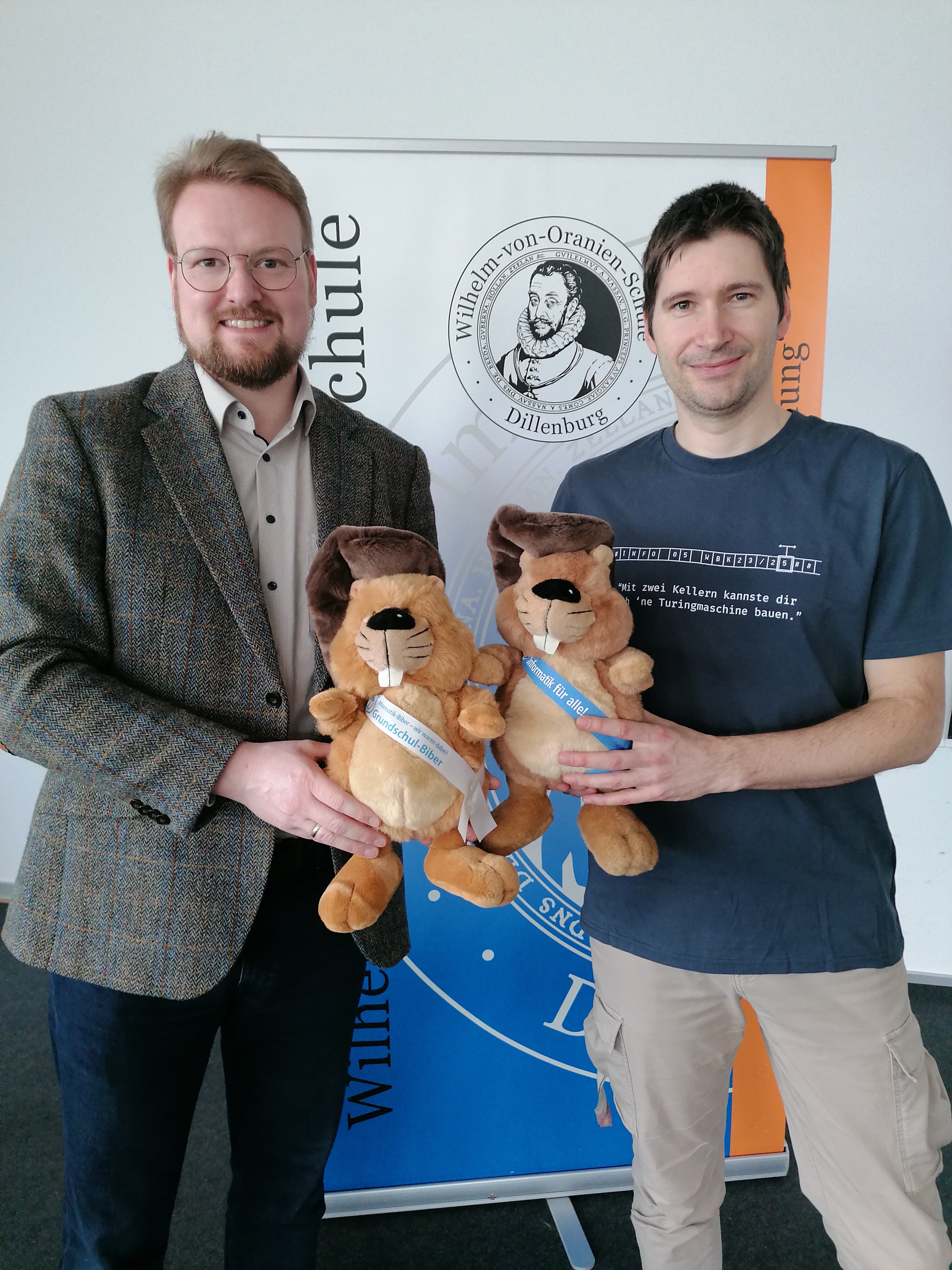 Zudem konnte die WvO in diesem Jahr auch die Schelderwald-Schule Oberscheld für die Teilnahme am Grundschul-Informatik Biber Wettbewerb begeistern. Dort haben insgesamt 30 Kinder teilgenommen und hatten großen Spaß. Als Dank für dieses Engagement erhielten beide Schulen einen kuscheligen Plüsch-Biber, worüber sich die Wettbewerbskoordinatoren Jonas Seibel und Sebastian Jakobi sichtlich freuten.