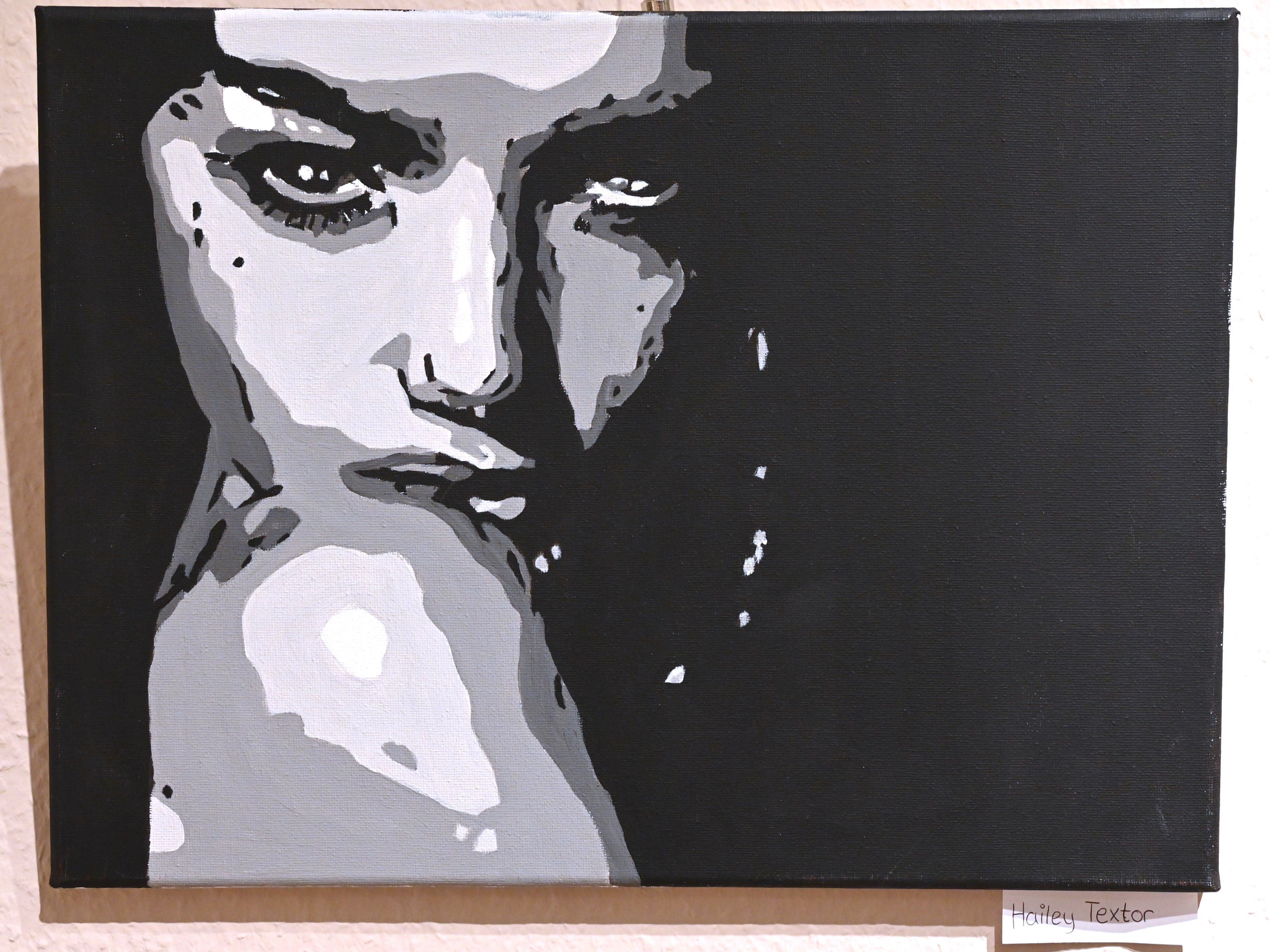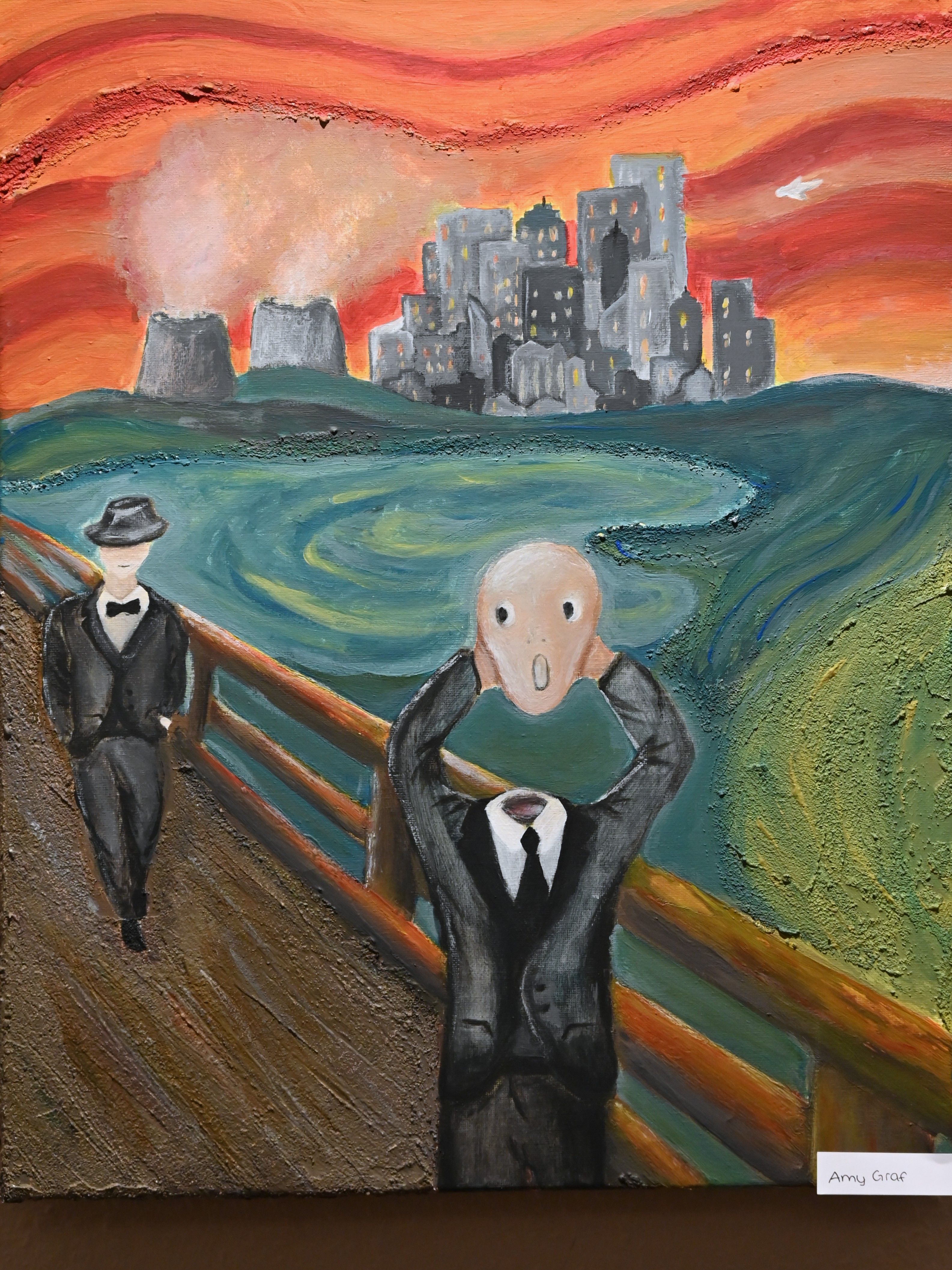 Ein weiterer Schwerpunkt lag auf fotografischen Arbeiten. Schwarz-weiß-Fotos, auf einer Exkursion in Frankfurt entstanden und im schuleigenen Labor entwickelt, sowie inszenierte Selbstporträts, Momentaufnahmen und experimentelle Bildideen setzten sich mit gesellschaftlichen Rollenbildern, Emotionen und Inszenierungen nach Cindy Sherman auseinander. Besonders eindrucksvoll waren die großformatigen Fotografien, die gesellschaftskritische Themen wie Identität und Selbstwahrnehmung aufgriffen. Gerade diese Werke regten zum Nachdenken und Diskutieren an – ganz im Sinne einer Ausstellung, die nicht nur gefallen, sondern auch bewegen will, wie es Sascha Schulze in seiner Eröffnungsrede deutlich machte. Neben der Wertschätzung für die künstlerischen Arbeiten war ihm wichtig, dass die in der Schule entstehende Kunst auch im öffentlichen Raum einen Platz bekommt.
