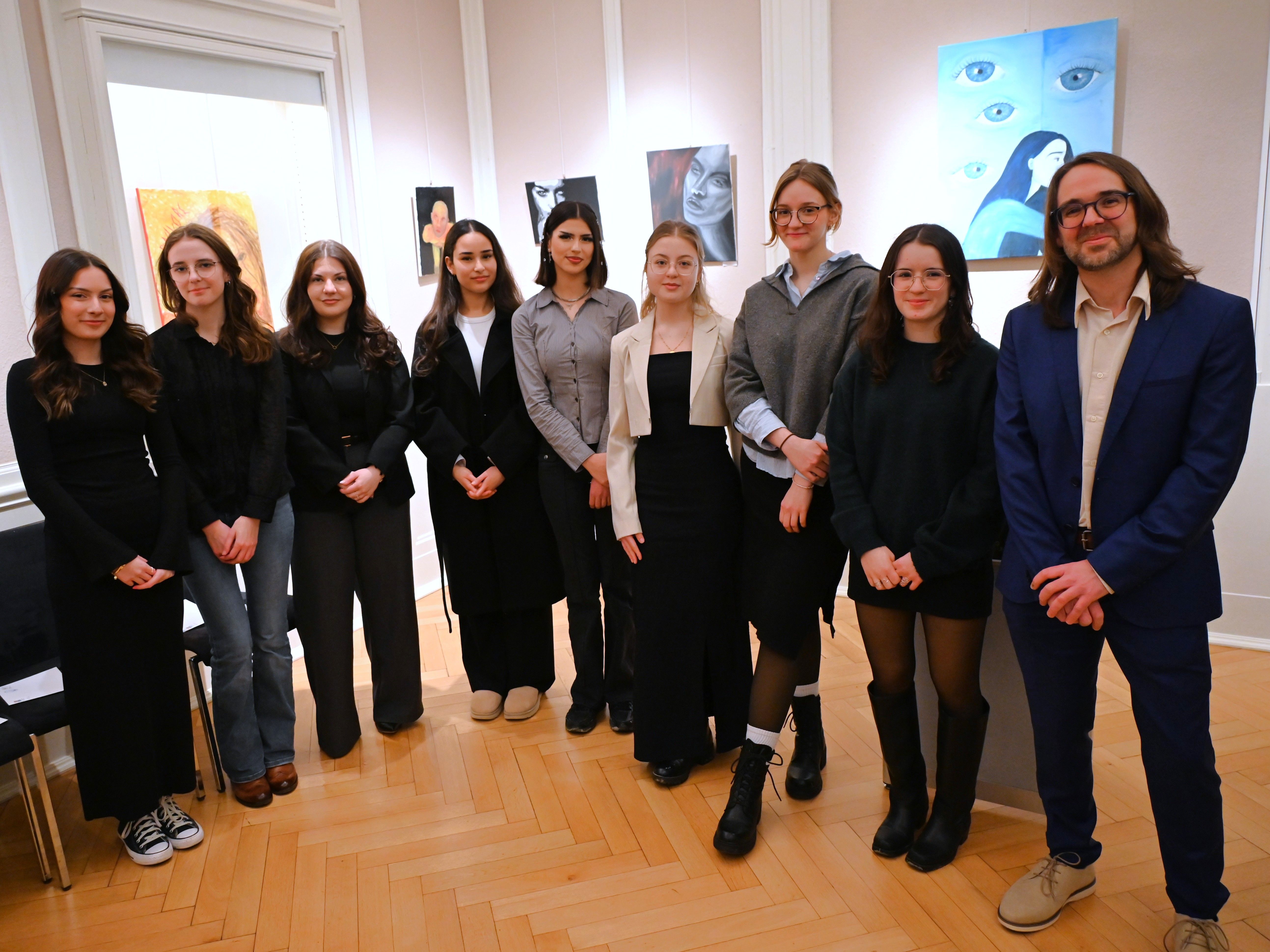 Gruppenfoto, v.l.: Ebru-Nur Baykal, Maja Pieck, Hailey Textor, Nisa Sarikus, Mina Demirdöven, Janset Sagirkaya, Amy Graf, Lina Hofheinz, Kunstpädagoge Sascha Schulze (es fehlt: Yagmur Kizil)