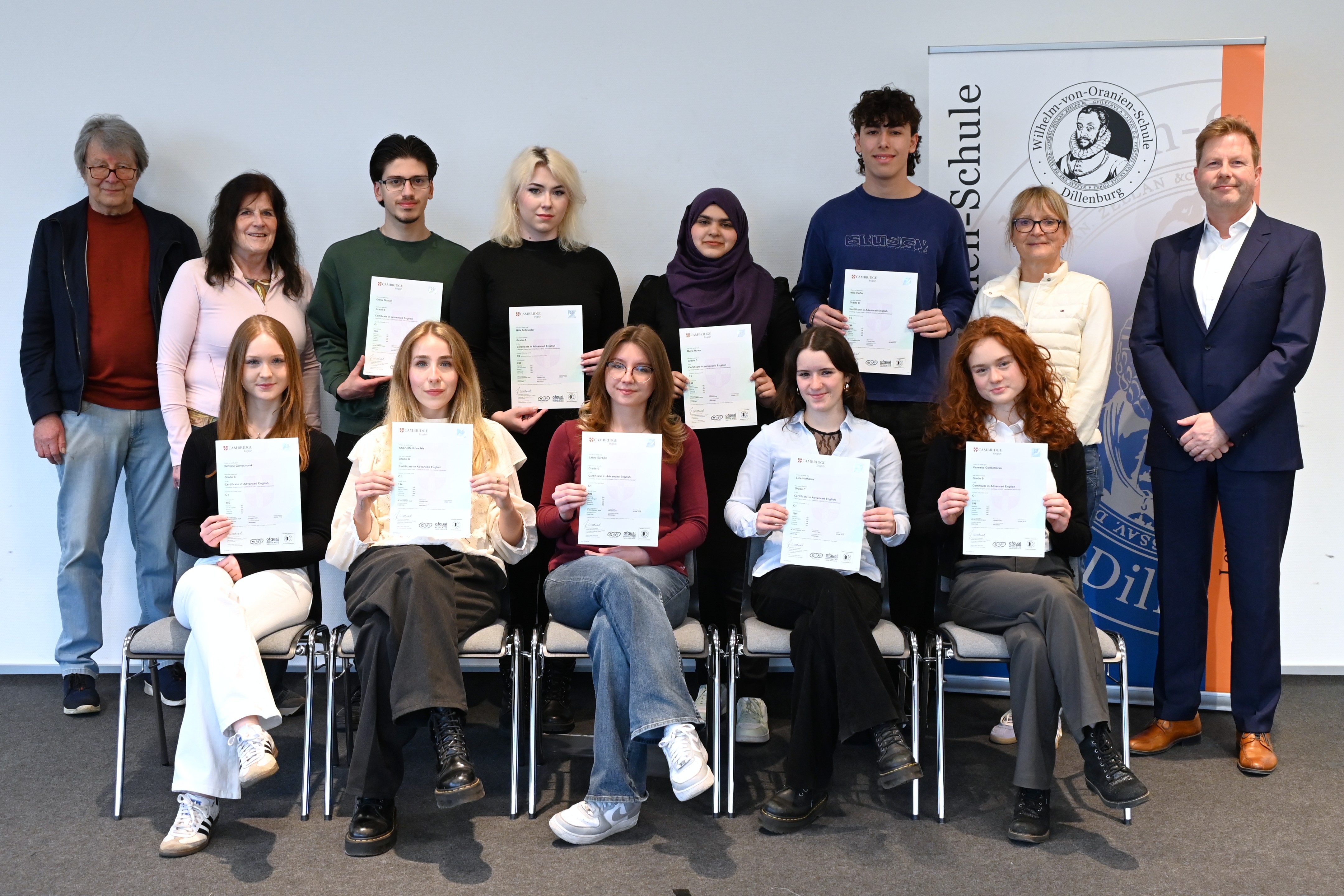Neun Schülerinnen und Schüler der Wilhelm-von-Oranien-Schule (WvO) haben das renommierte Sprachzertifikat „Cambridge English“ erworben, nachdem sie in über 40 Schulstunden von Englisch-Lehrerin Heike Bappert auf die Prüfung vorbereitet wurden. Die Deutsch-Englische Gesellschaft (DEG) – vertreten von Dorothea Rabanus und Ulrich Mai – gratulierte bei der Zertifizierung mit Buchgeschenken.