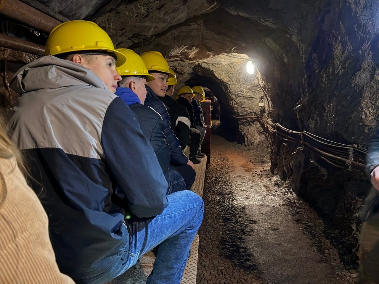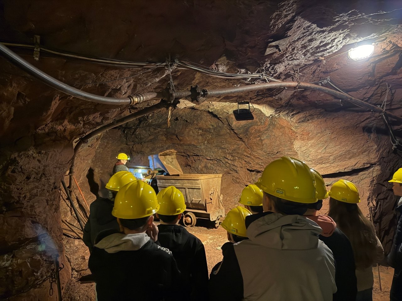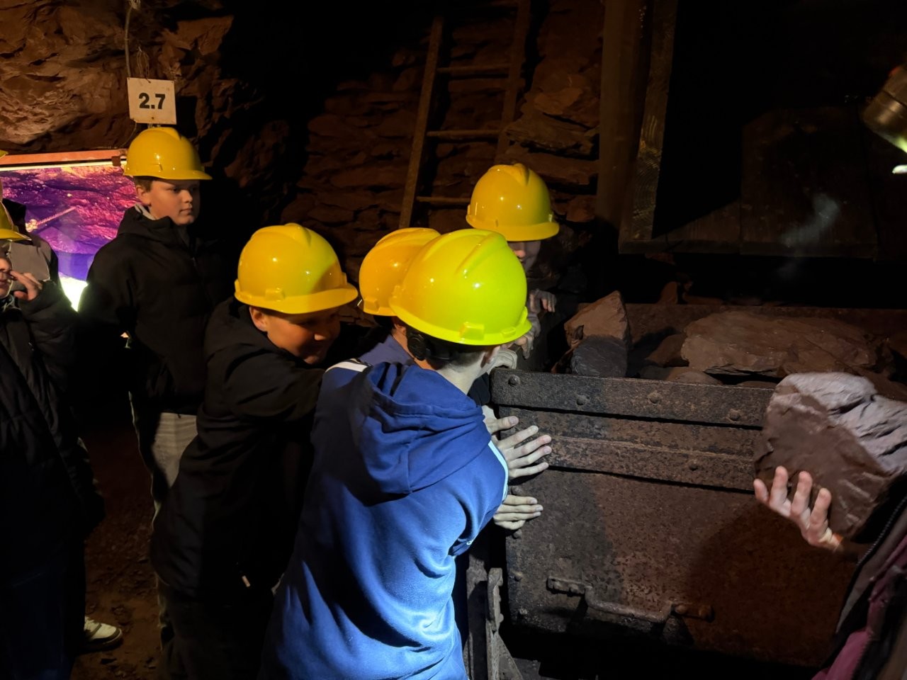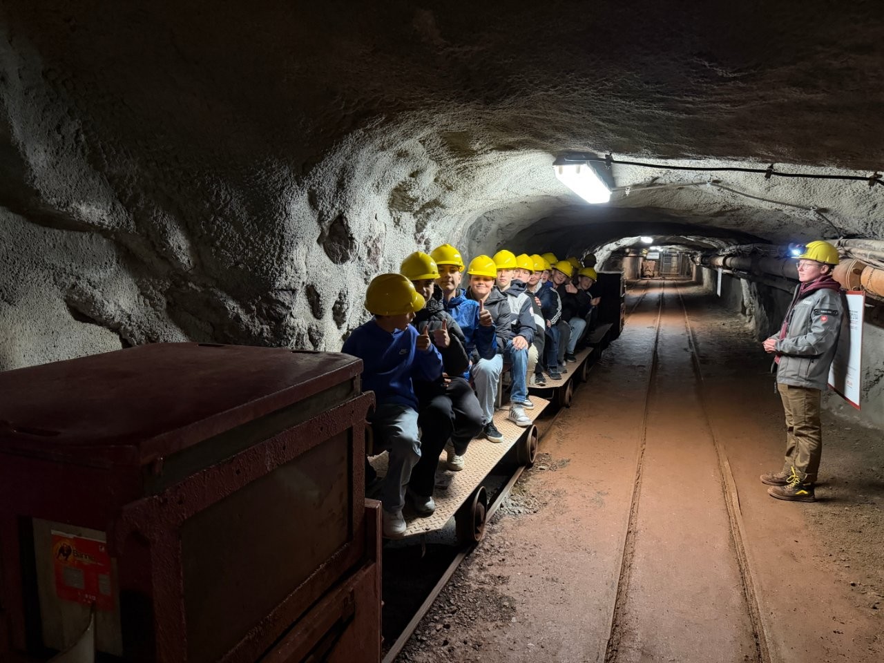 Der Zugang erfolgte durch einen Stollen, der in den zentralen Schacht mündet. Mit dem bergmännischen Gruß „Glück auf“, der sowohl die Hoffnung auf reiche Funde als auch auf eine sichere Rückkehr ausdrückt, fuhren die Schülerinnen und Schüler in den Berg ein. Von dort aus ging es mit dem Förderkorb 150 Meter in die Tiefe. Anschließend brachte eine Grubenbahn die Gruppen in den Abbaubereich, wo originale Maschinen vorgeführt und ihre Funktionsweise erläutert wurden.