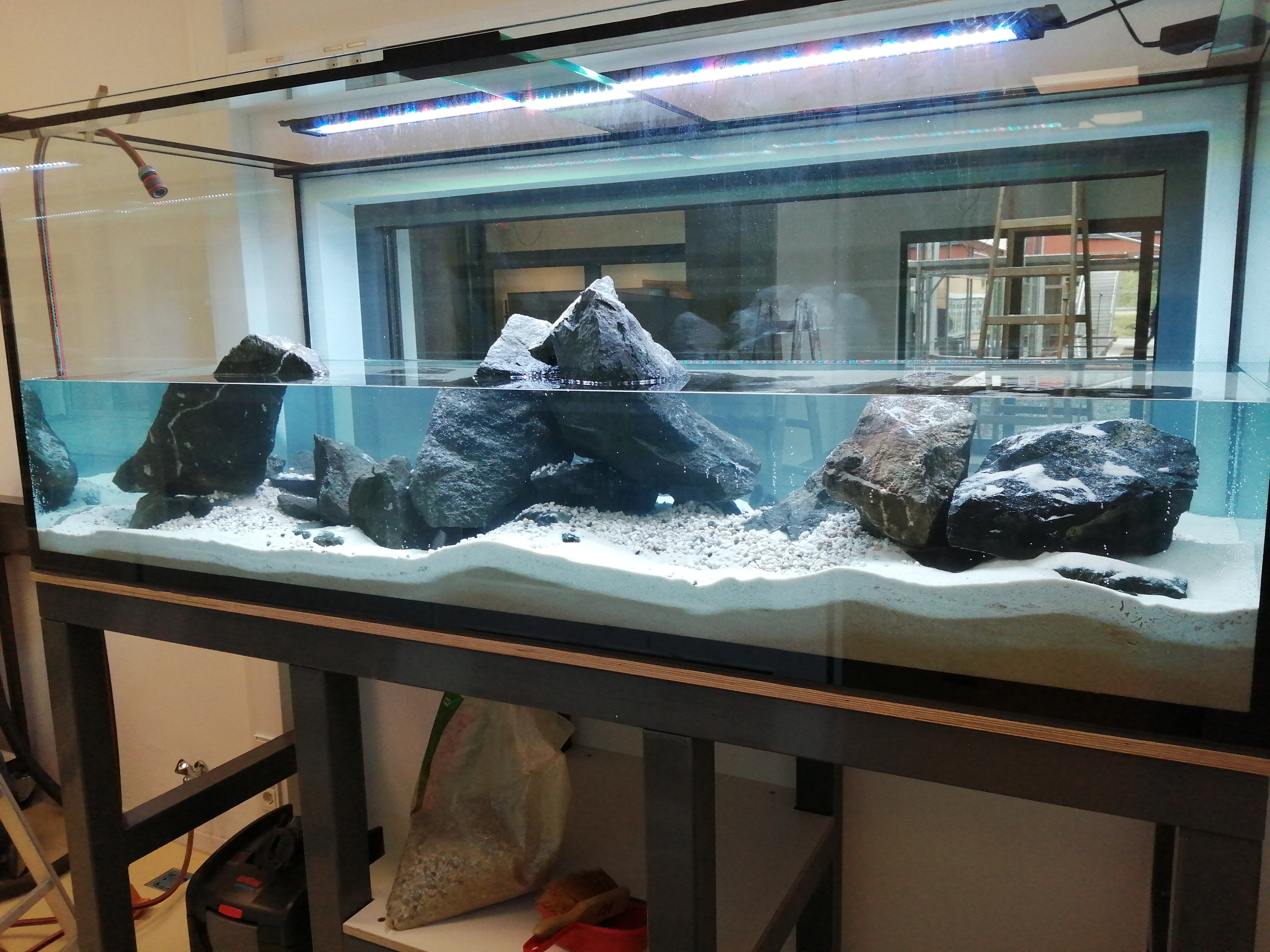 Das Ergebnis kann sich jedenfalls sehen lassen: Hat man einmal, nach der Eröffnung, die neue Eingangshalle betreten, geht man seit Ende Juni 2020 an einem 1400 Liter fassenden Aquarium - 210cm x 80cm x 85cm (L x B x H) - rechtsseitig in Sichthöhe vorbei. Nach dem erfolgreichen Transport an seinen Bestimmungsort durch ein Umzugsunternehmen übernahmen die Biologielehrer Timo Jung und Sedric Haus die weitere Einrichtung, Installation der Technik und den Erstbesatz mit Fischen und Pflanzen.