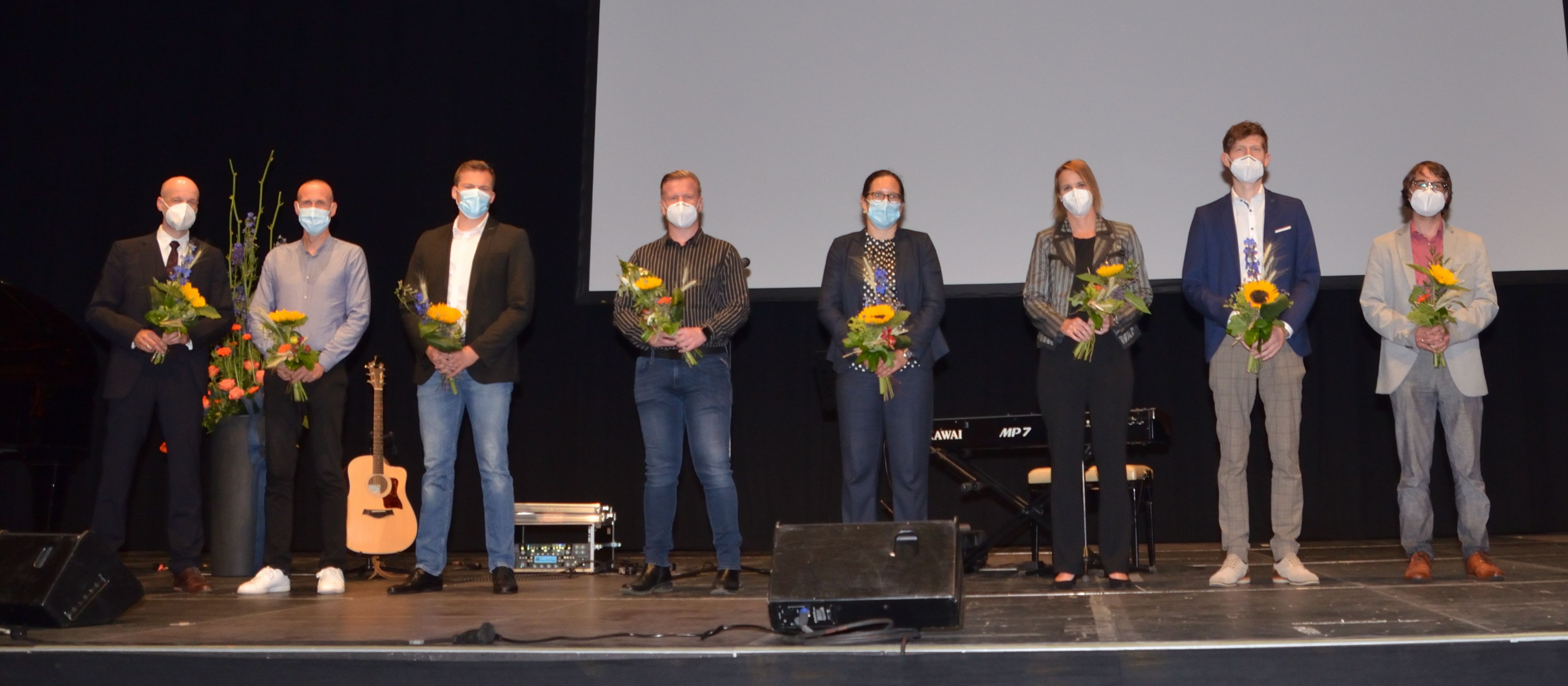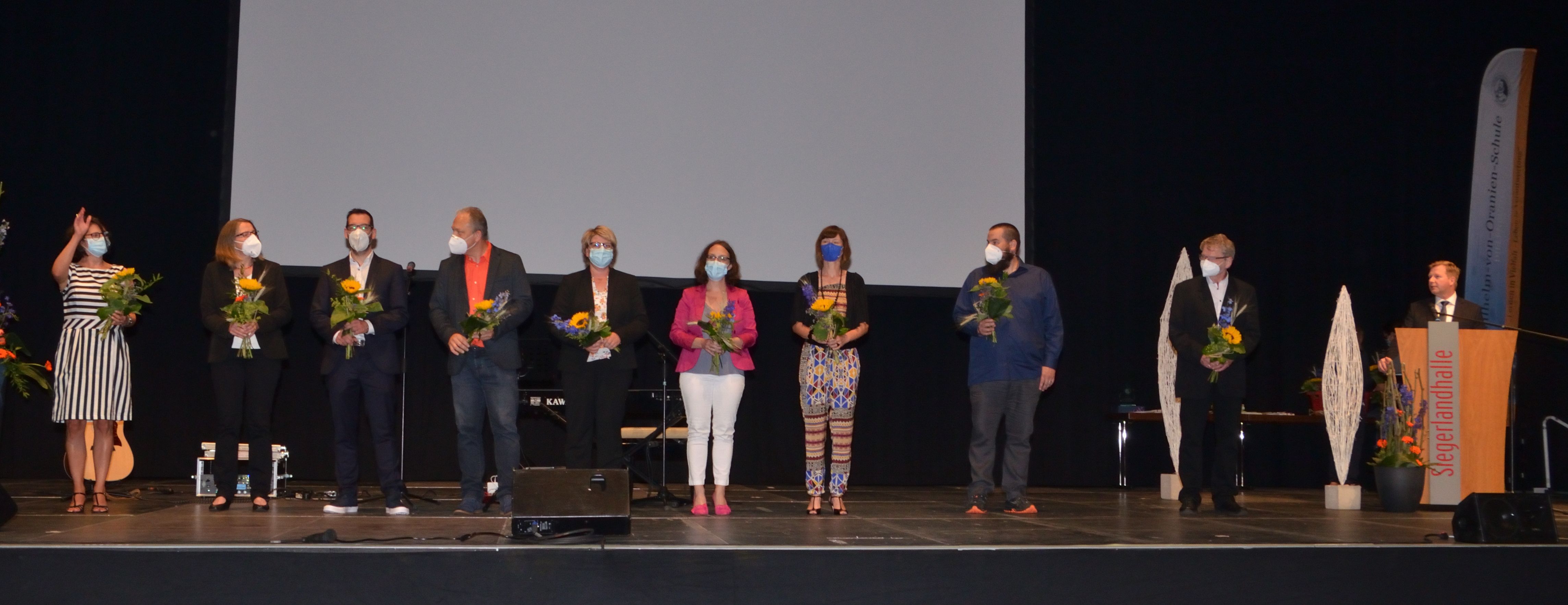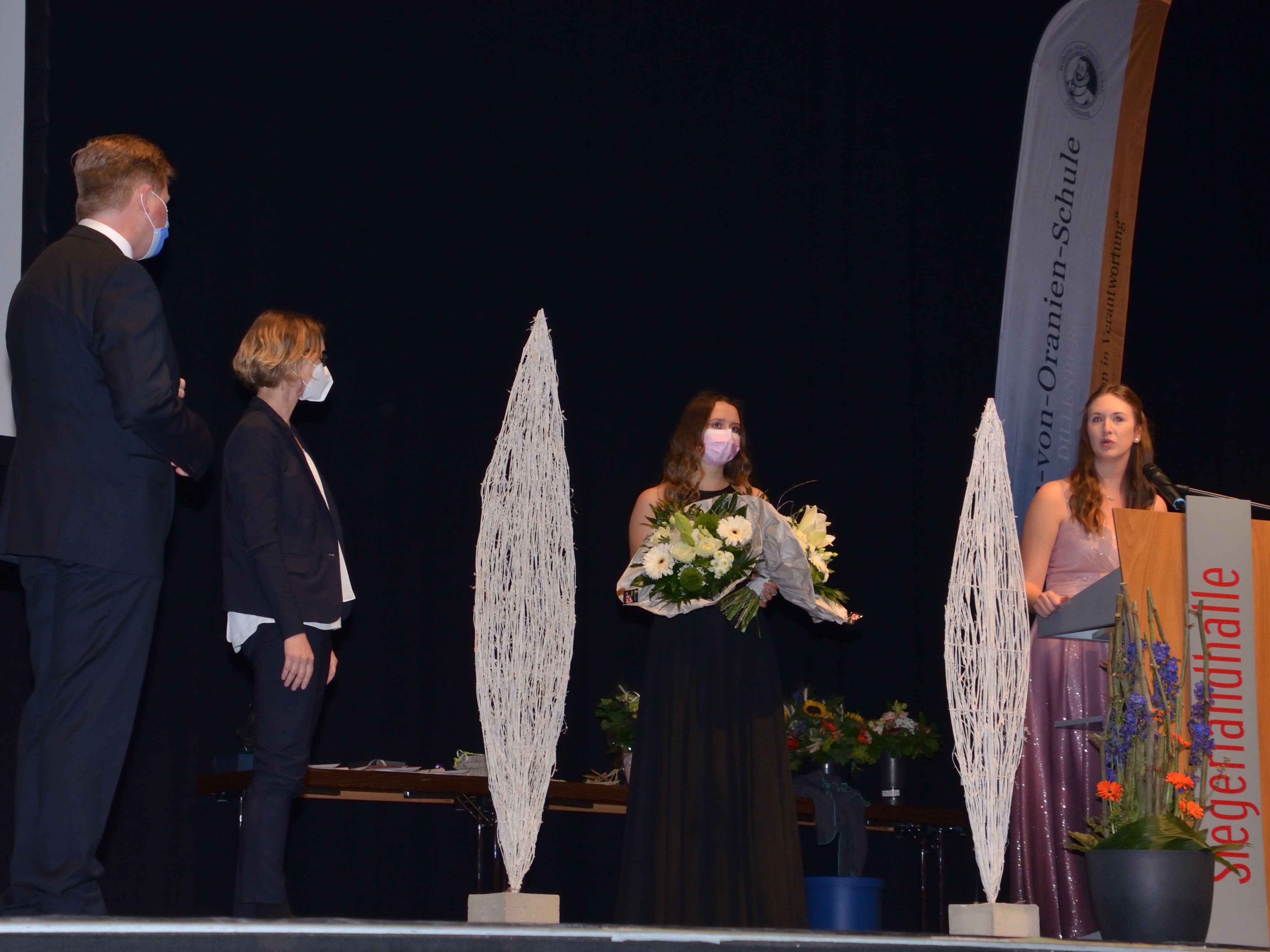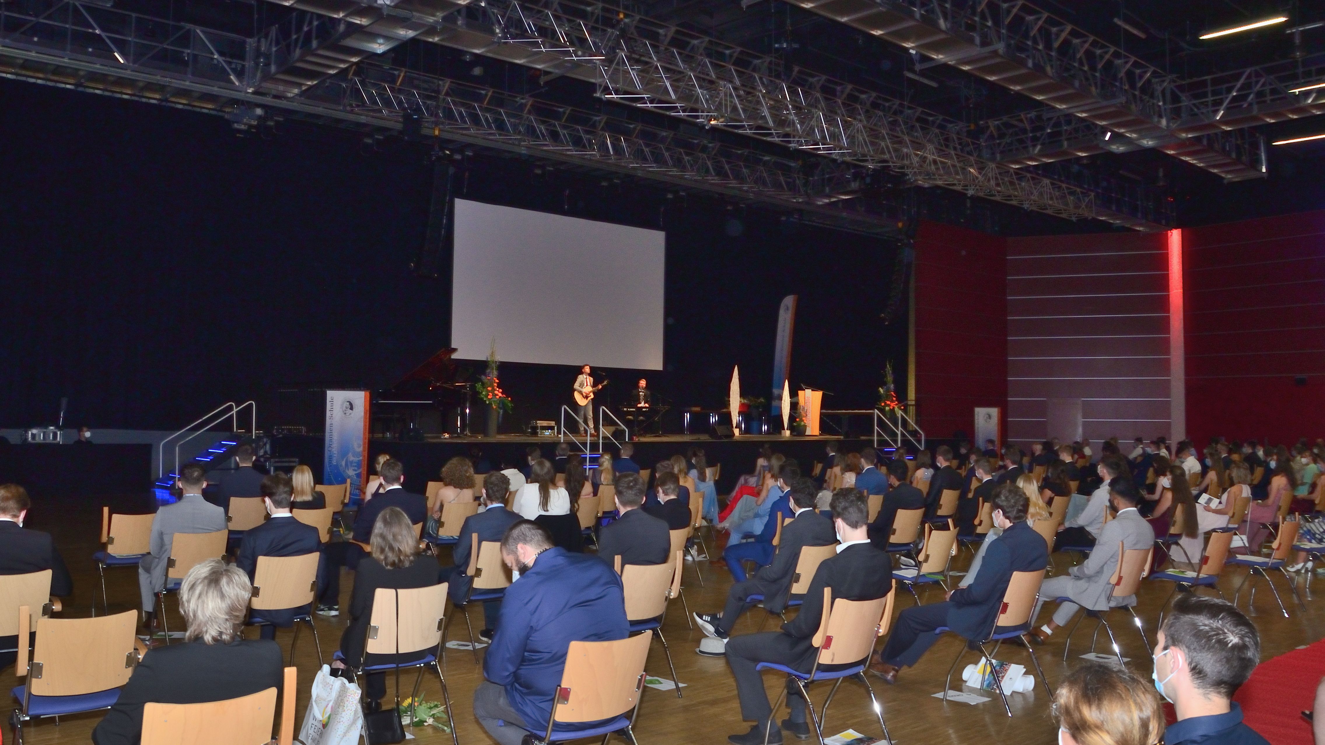 Möglich machten diesen schönen Abschluss nach allen Pandemiestrapazen einerseits die rechtzeitig sinkenden Inzidenzwerte sowie andererseits eine etwas liberalere Coronaschutzverordnung des Landes Nordrhein-Westfalen im Vergleich zur hessischen. Die Siegerlandhalle konnte gemeinsam mit dem Dillenburger Gymnasium ein überzeugendes und verordnungskonformes Hygienekonzept vorlegen: genügend Platz fürs Abstandhalten, feste Sitzplätze mit namentlicher Registrierung, Eintritt nur mit aktuellem Negativ-Testnachweis, Maskenpflicht usw. Niemand hätte vor einigen Wochen damit gerechnet, dass es auf diese Weise möglich sein würde, die Zeugnisfeier gemeinsam zu begehen, hatten doch im letzten Jahr die Eltern nur per Videoübertragung ins heimische Wohnzimmer zuschauen dürfen, wie ihre Sprösslinge das Zeugnis der Allgemeinen Hochschulreife überreicht bekamen. Dieses Jahr nun waren alle dabei, und die Freude darüber war den Gesichtern der Gäste wie auch den Redebeiträgen auf der Bühne deutlich anzumerken.
