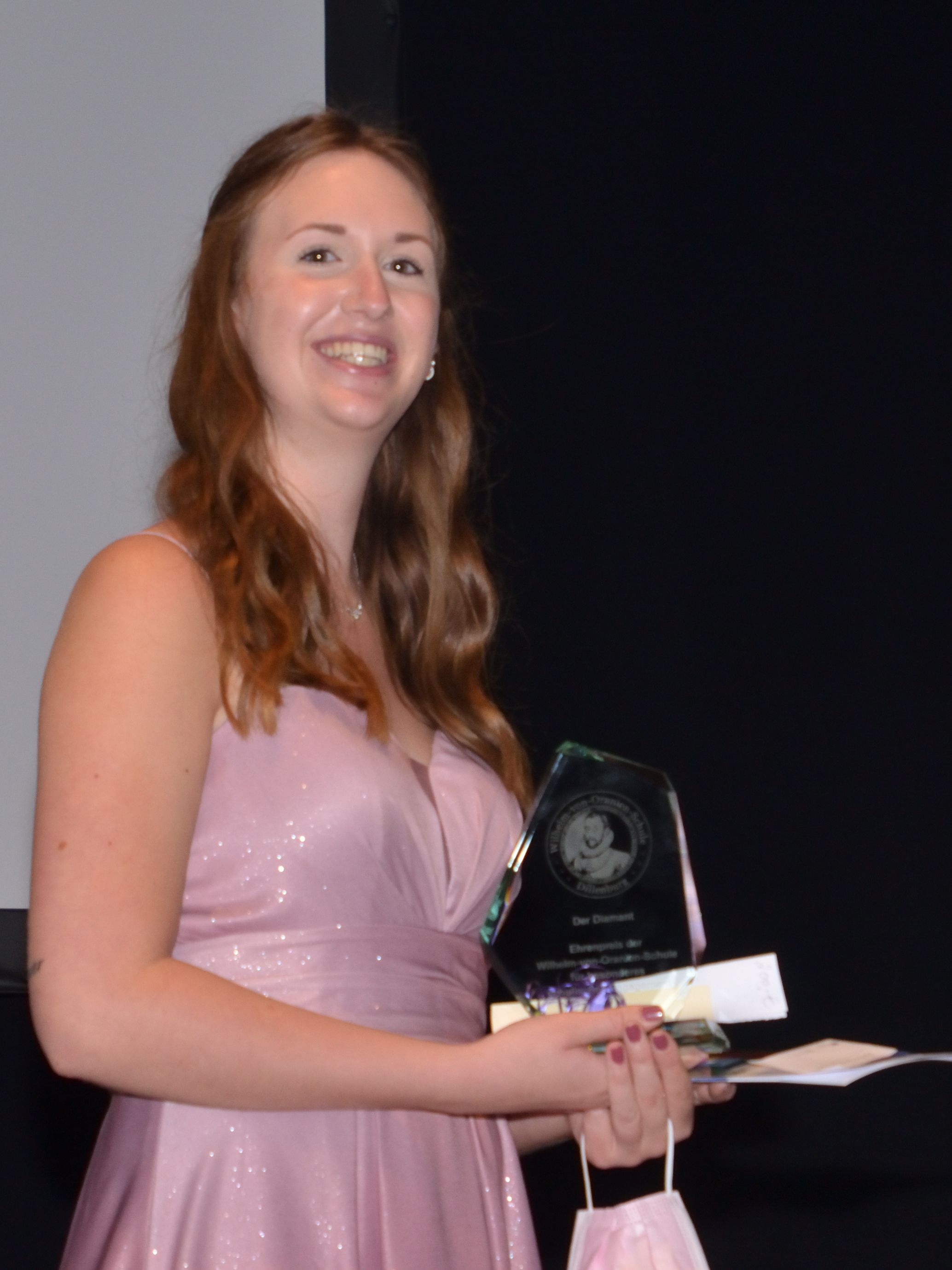 Seit 2013 wird der „WvO-Diamant“ vom Bürgermeister der Stadt Dillenburg gemeinsam mit dem Förderverein „Wilhelms Freunde e.V.“ für besonderes soziales Engagement in der Schulgemeinde gestiftet. Die Diamant-Trophäe sowie den Buchgutschein über 200,- Euro überreichte Vereinsvorsitzender Dr. Bernd Peter an Jahrgangssprecherin Hanna Nix, die sich trotz Corona als „krisenfestes Organisationstalent“ erwiesen und „das Herz auf dem rechten Fleck“ habe, so Peter in seiner Laudatio.