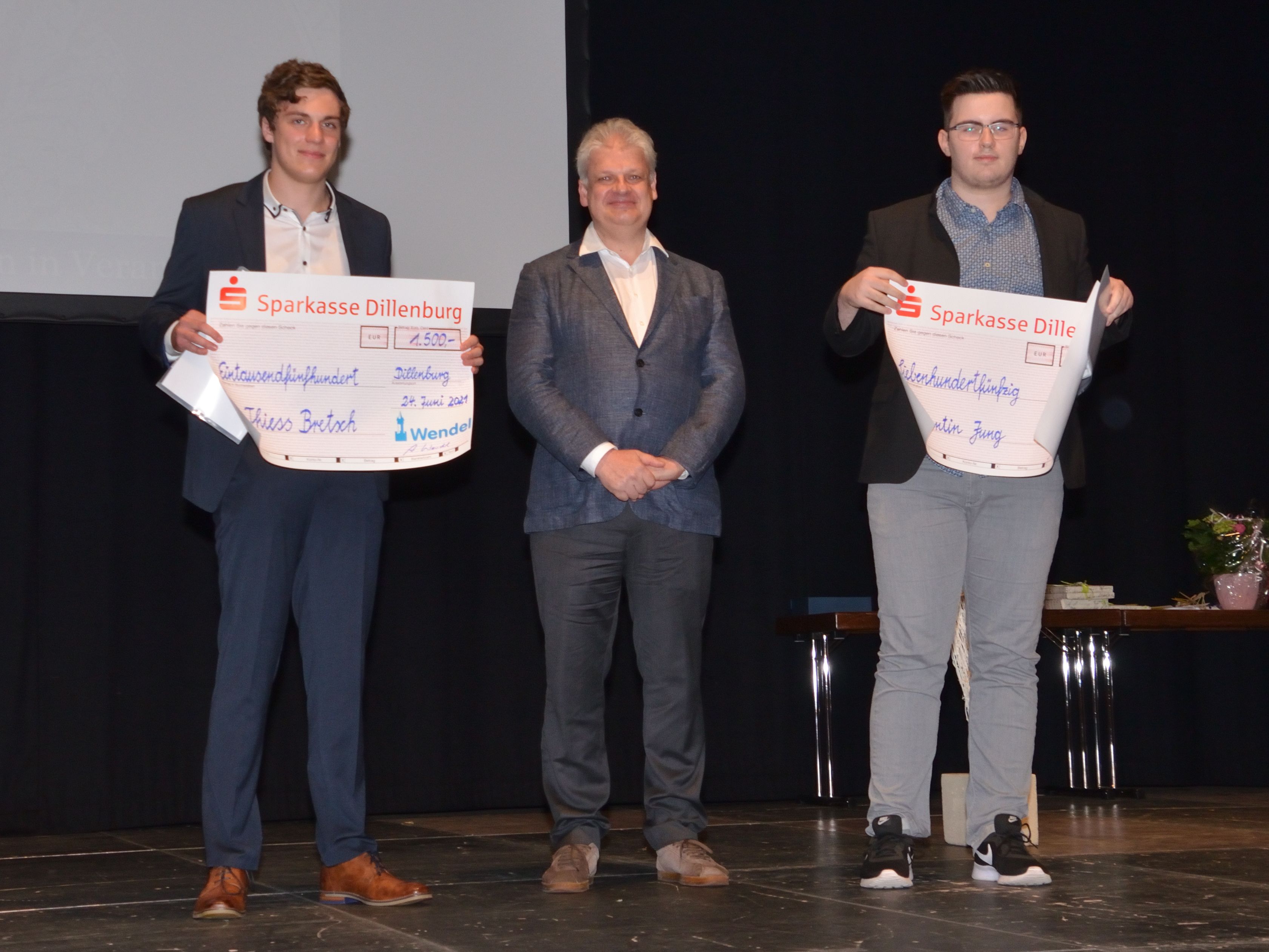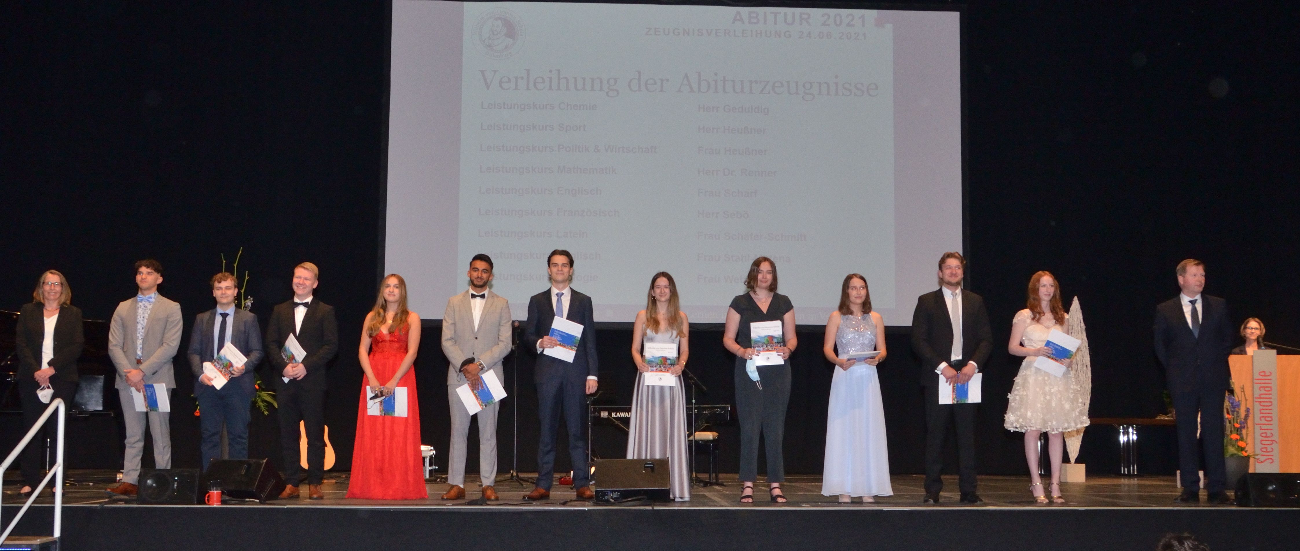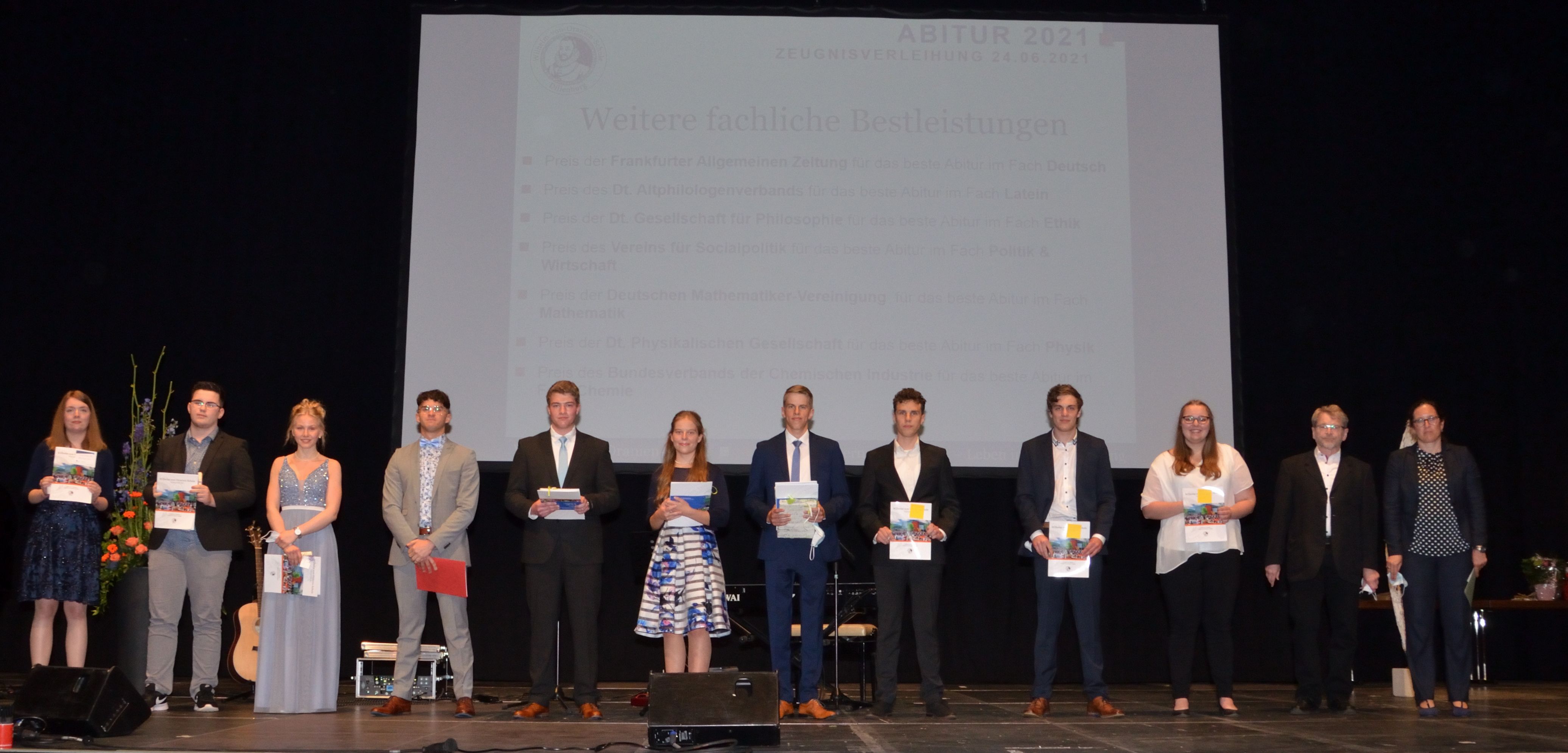 Besondere fachliche Leistungen wurden auch dieses Jahr in gewohnter Tradition geehrt. Dr. Jörg Wendel vom Dillenburger Traditionsunternehmen Wendel Email honorierte die zwei besten naturwissenschaftlichen Abiturabschlüsse mit Stipendien in Höhe von 1.500,- bzw. 750,- Euro, die an Thiess Bretsch und Constantin Jung ausgezahlt werden, wenn sie ihr naturwissenschaftliches Studium aufnehmen. Des Weiteren wurden von diversen Fachverbänden für Prüfungshöchstleistungen mit Urkunden, Sachpreisen oder Mitgliedschaften geehrt: Marie-Kristin Moos (Deutsch), Constantin Jung (Latein), Ida Warfsmann (Ethik), Saverio Asbai (Politik & Wirtschaft), Philipp Meister und Merle Womser (beide Mathematik), Paul Weiershausen (Mathematik und Physik), Mervin Albrecht, Thiess Bretsch und Larissa Moos (alle Chemie).
