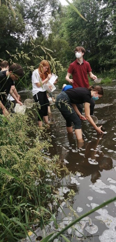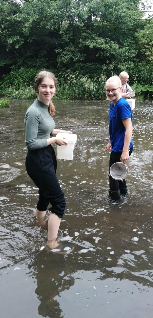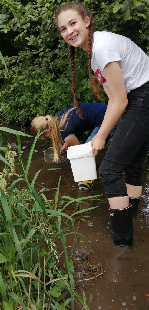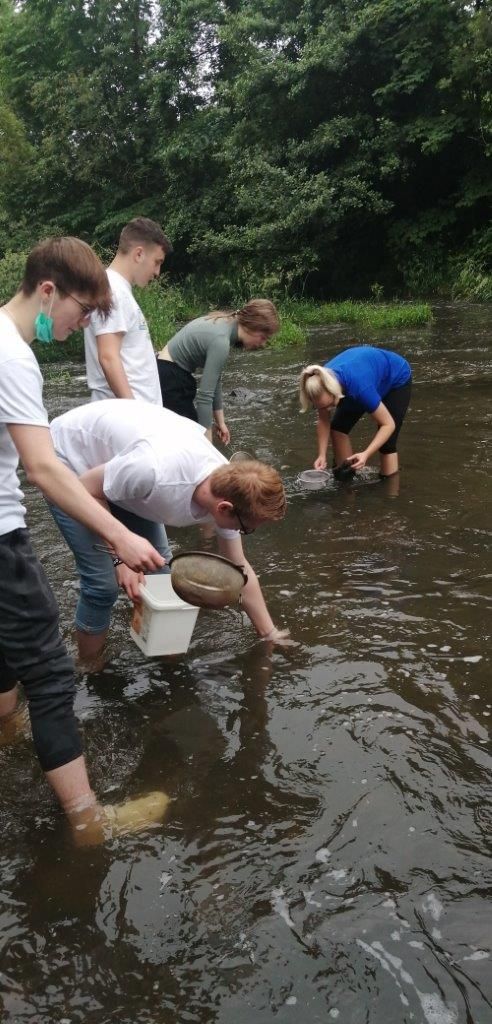 An den Untersuchungsstellen wurden dann 15 bis 20 Minuten lang Organismen zur späteren Bestimmung gefangen. Dazu wurden Wassertiere unter Steinen, zwischen Pflanzen und im Sediment gesammelt. Hierbei werden die Kescher gegen die Strömung geführt und Tiere vorsichtig mit Pinseln von Steinen in die Eimer überführt. Die gefangenen Tiere werden mithilfe von Bestimmungskarten vor Ort bestimmt, die Anzahl notiert und anschließend wieder entlassen. Ausgewählte Tiere wurden in der Schule weiter mit Stereolupen untersucht und fotografiert. Auch diese Tiere wurden nach der Untersuchung und Dokumentation wieder schonend zurückgesetzt.