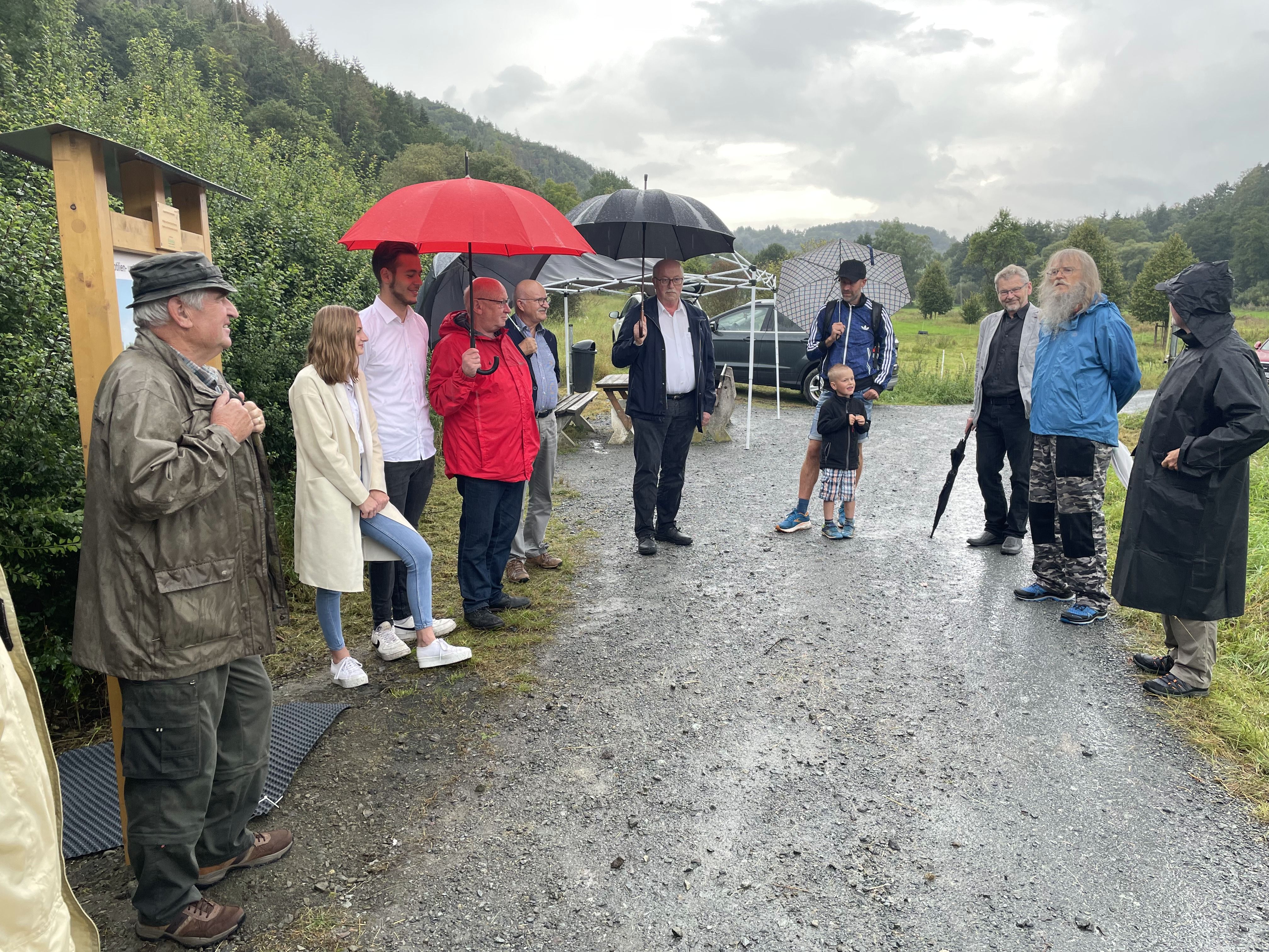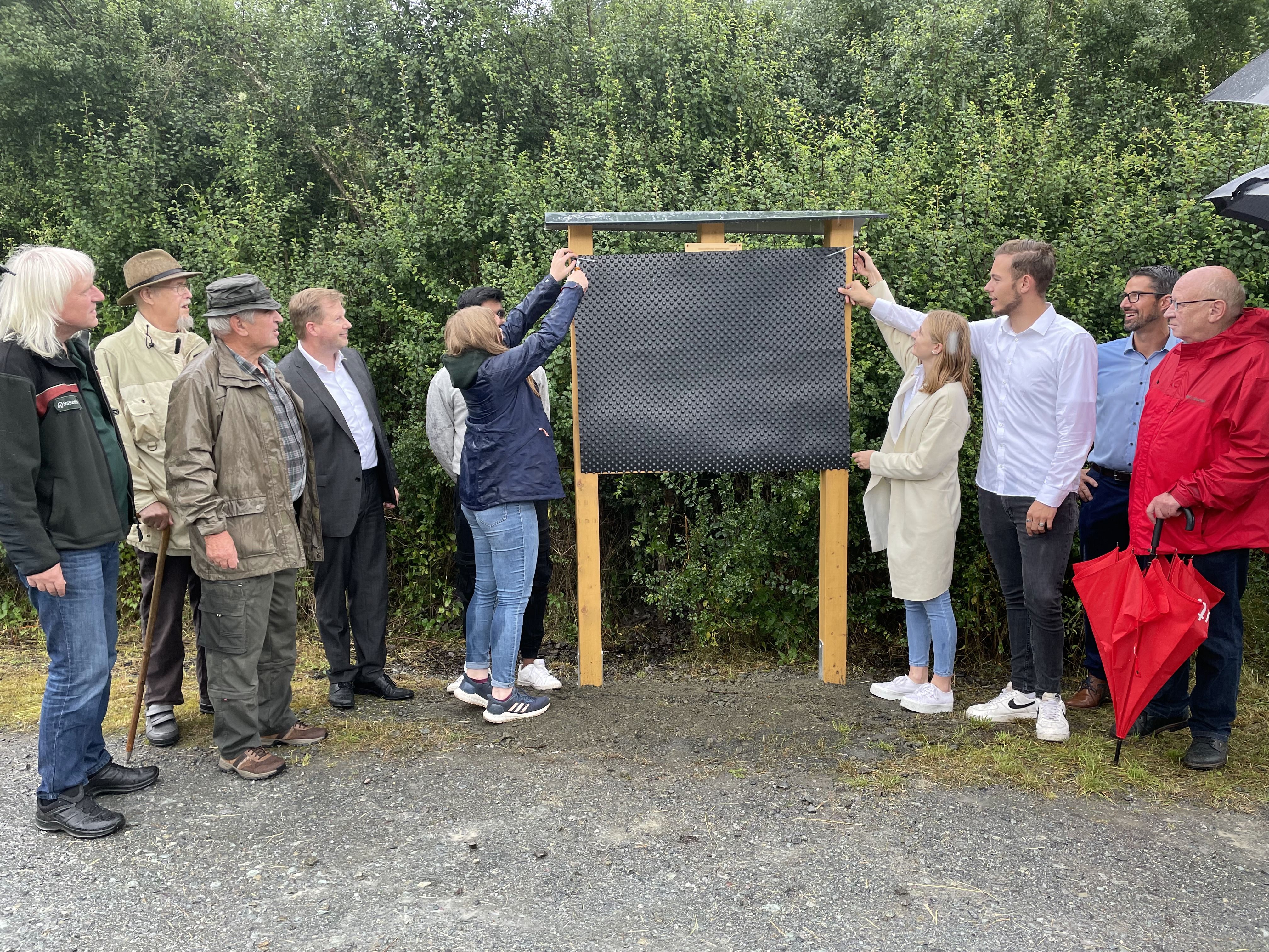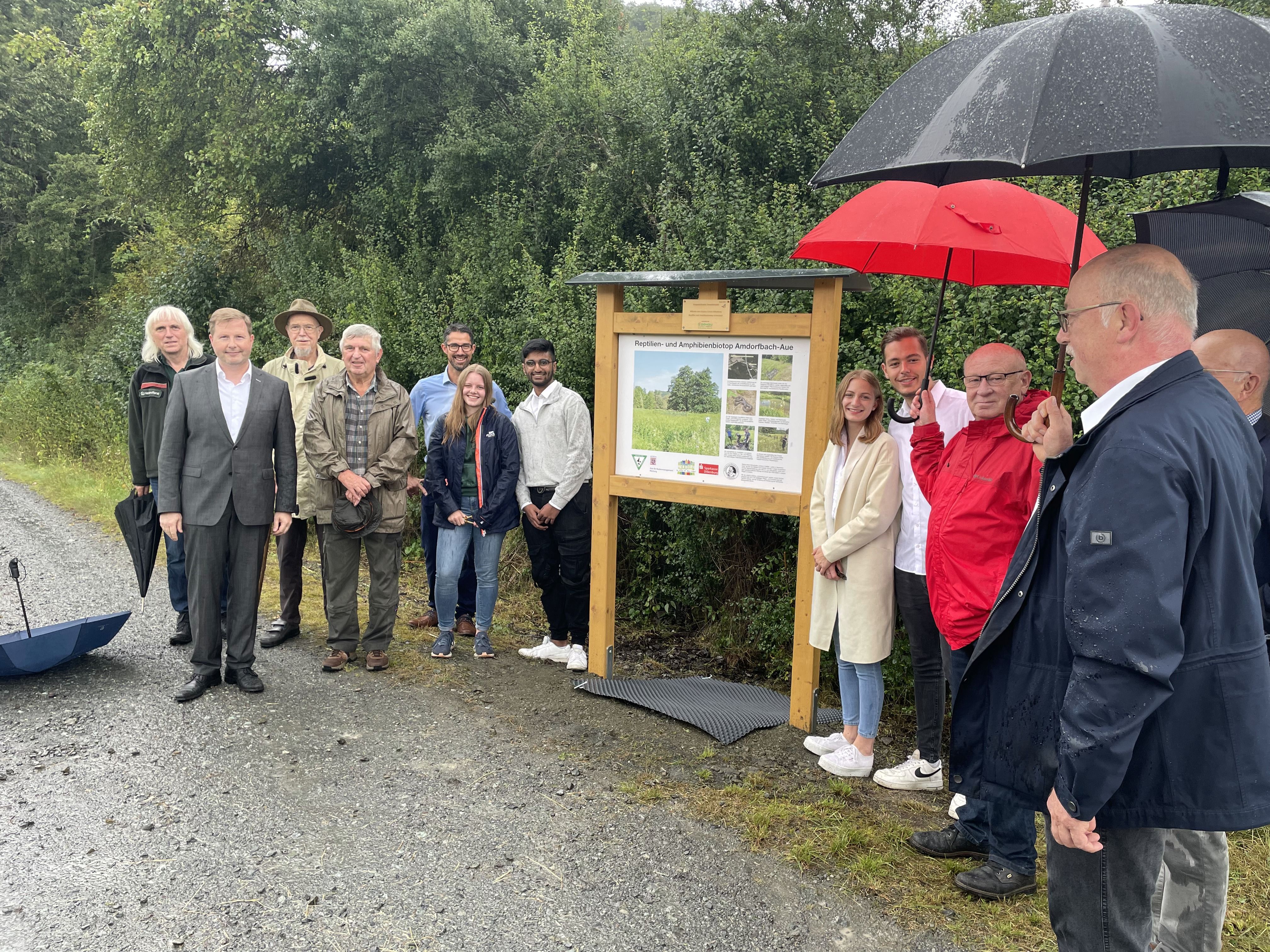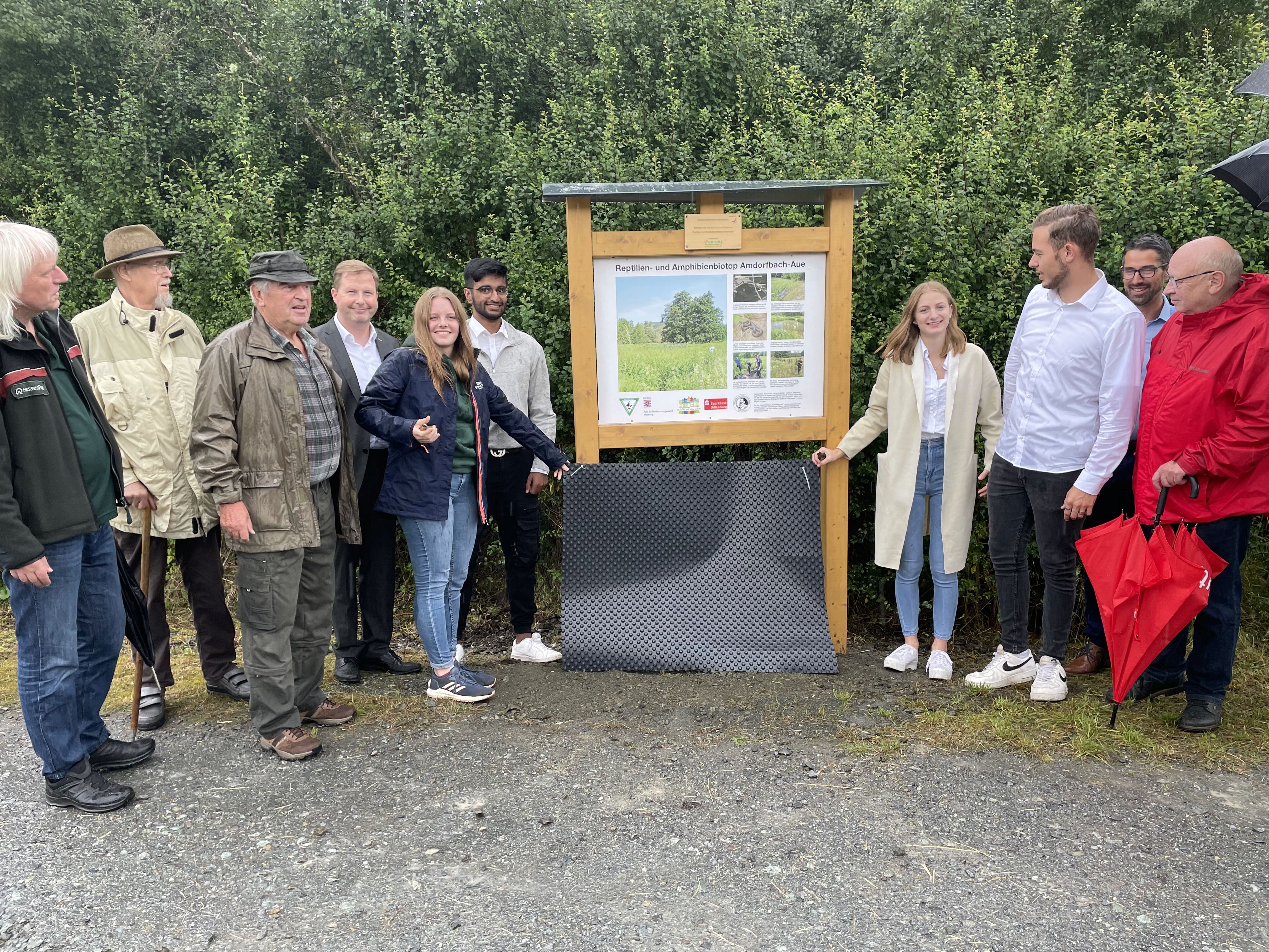 Im kleinen Kreis konnte trotz Gewitter und Regen eine Informationstafel für das Auenbiotop Amdorfbach enthüllt und von der Naturlandstiftung an das Dillenburger Gymnasium feierlich übergeben werden. Von nun an können sich alle Spaziergänger, Wanderer und Radfahrer über die Pflegemaßnahmen von WvO-SchülerInnen entlang der alten Bahntrasse sowie im angrenzenden Auenbiotop nahe des Ambachs ausgiebig informieren. Horst Ryba, Vorsitzender der Stiftung, übergab die Tafel an Schulleiter Martin Hinterlang. Die Schülerinnen und Schüler des Leistungskurses Biologie konnten diese dann unter den Augen von Landrat Wolfgang Schuster feierlich enthüllen. Neben ihm konnte Ryba auch den ersten Stadtrat Herborns, Claus Krimmel, sowie Friedemann Hensgen von der Rittal Foundation und Bernhard Clement, als Vertreter des zuständigen Forstamtes Herborn, begrüßen.