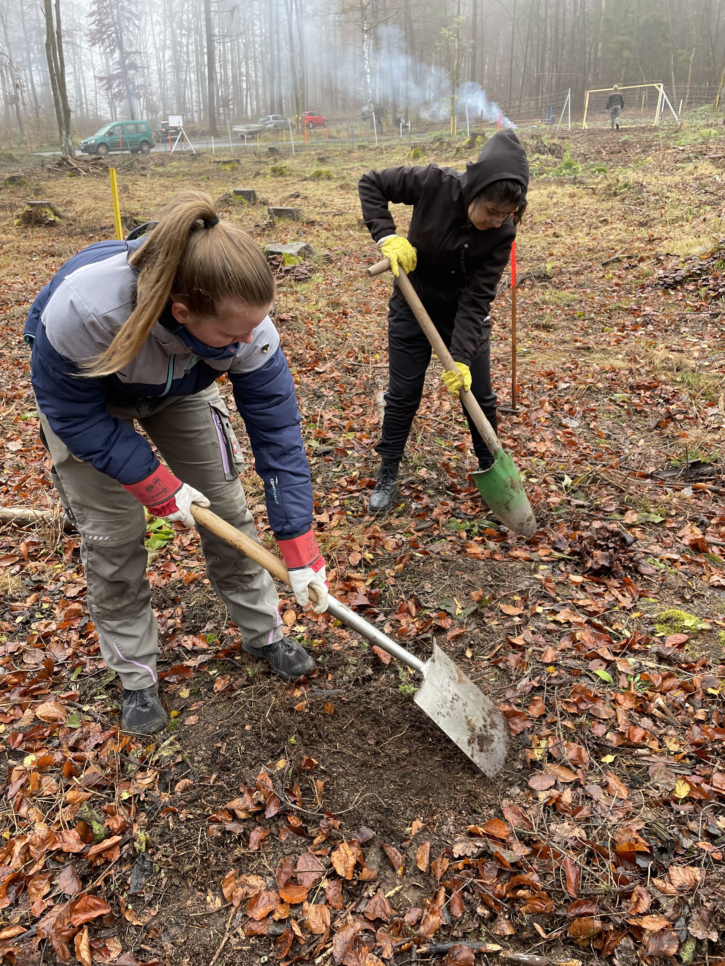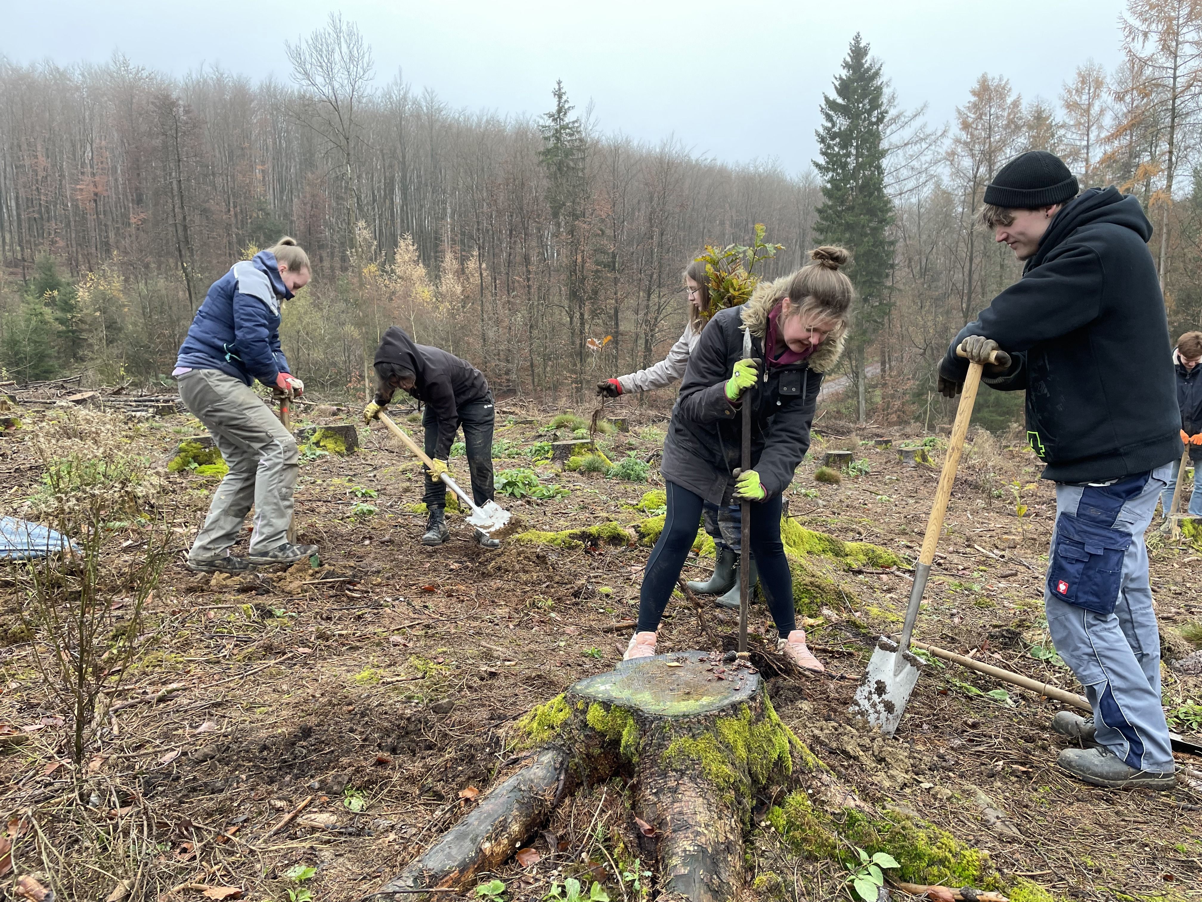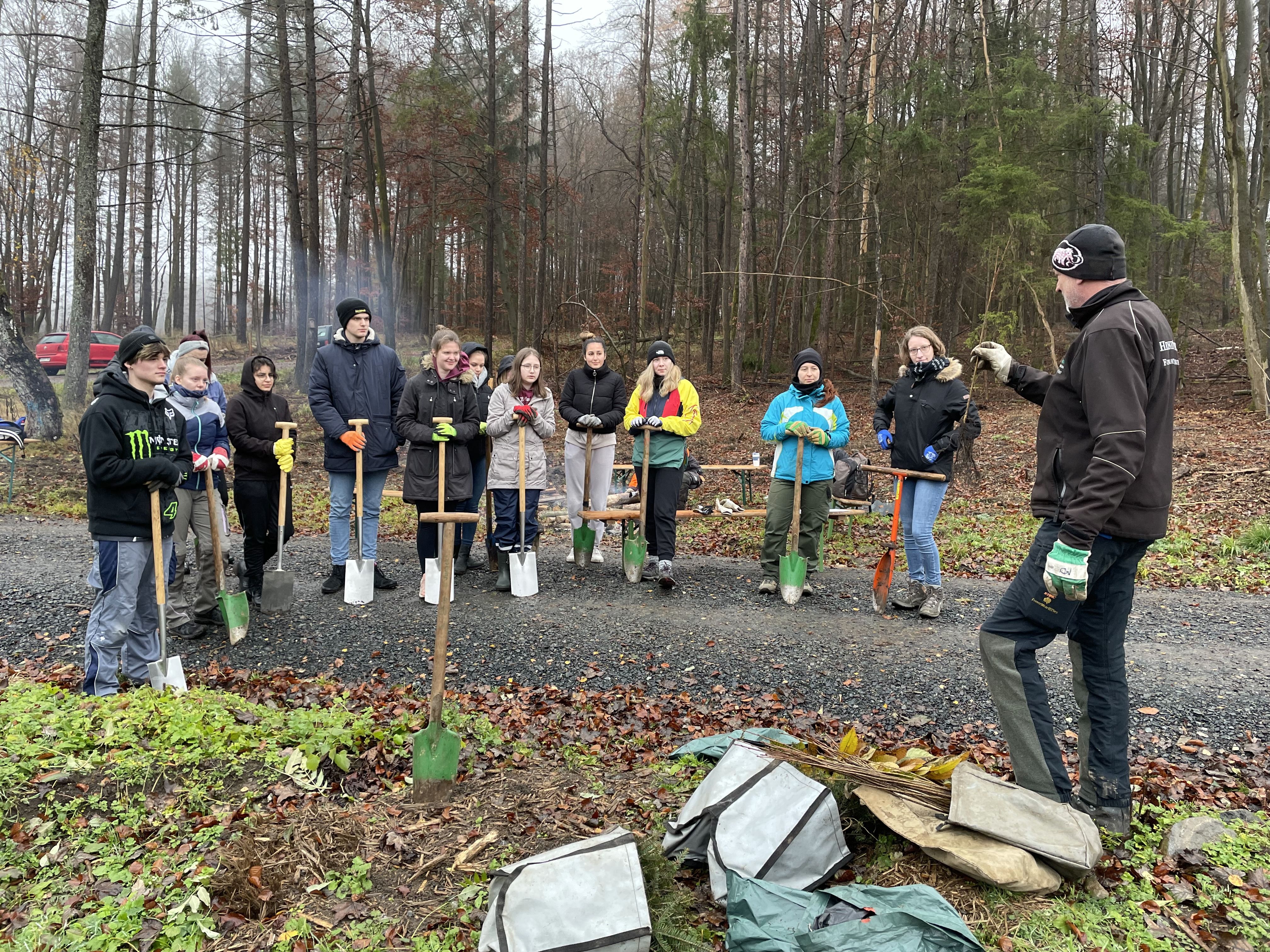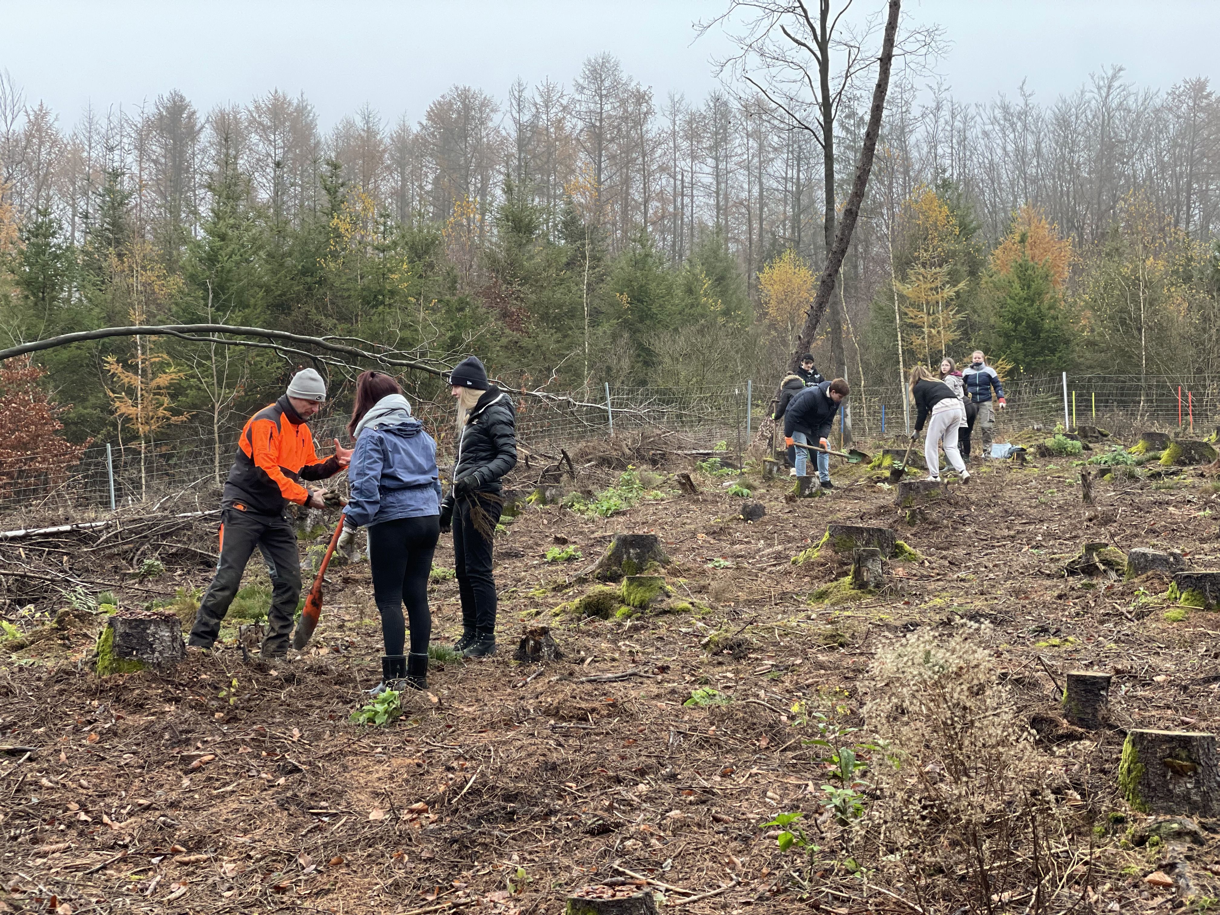 Aufgrund des geologischen Untergrunds der Region war das allerdings ein sehr steiniges Unterfangen. Kleine und auch große Basaltsteine im Mineralboden erschwerten die Arbeiten. Das eher nasskalte Novemberwetter trug das Übrige bei. Doch die Schülerinnen und Schüler zeigten, was ein Leistungskurs imstande ist zu leisten, trotzten den widrigen Bedingungen und waren voller Tatendrang bei der Sache. Und so fanden am Ende eines anstrengenden Arbeitseinsatzes alle vorhandenen Setzlinge ein neues Zuhause im Schelderwald.