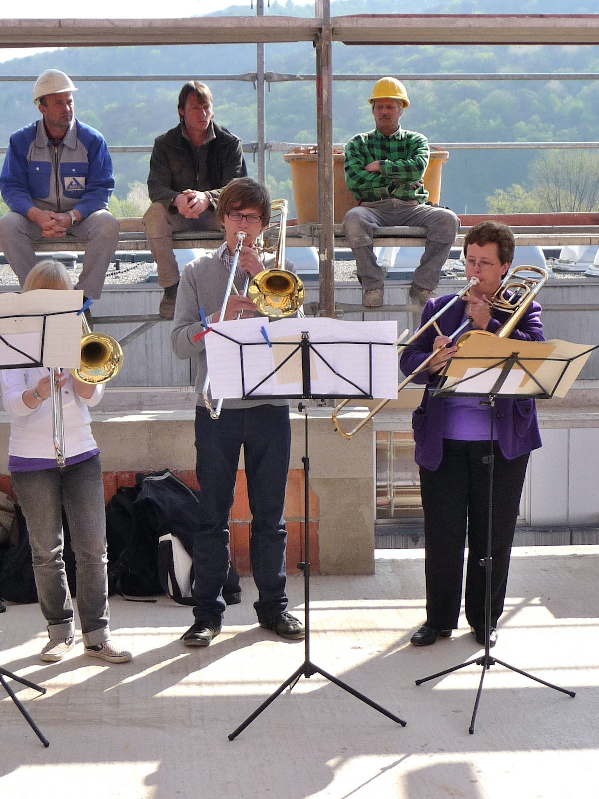 Ruth Schneider (r.) im Einsatz als Posaunistin und Leiterin des Blasorchesters beim Richtfest des Hofgebäudes im Jahr 2010