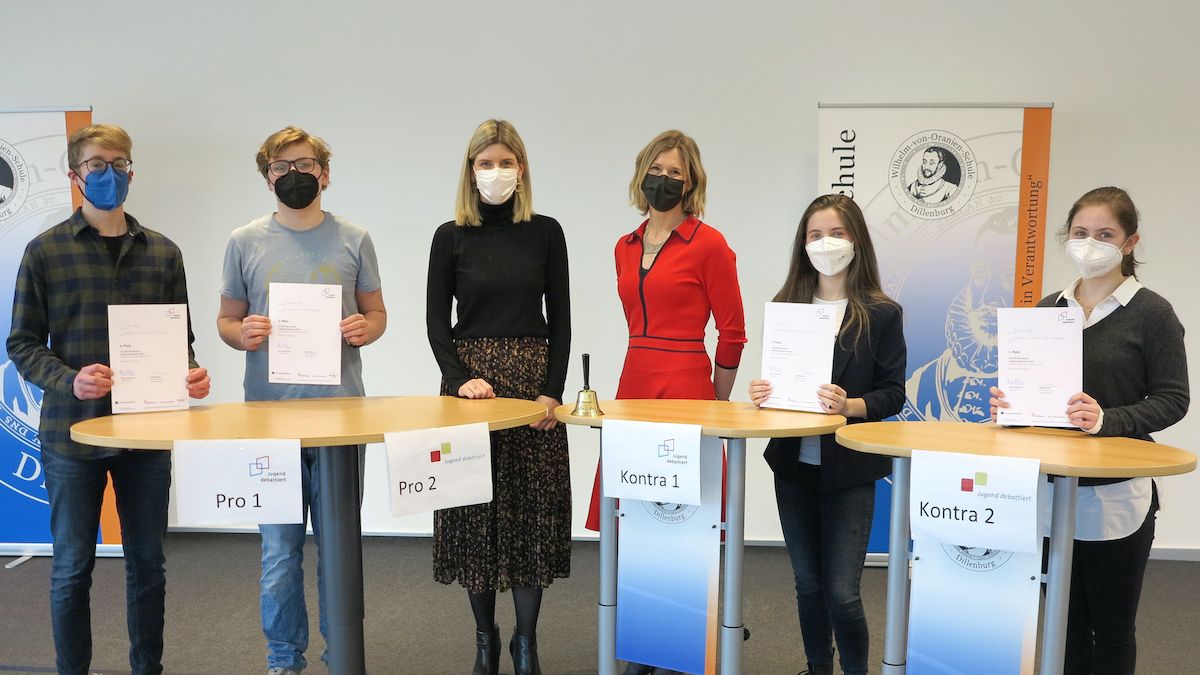 Die Debattantinnen und Debattanten sowie Jurorinnen des diesjährigen Schulwettbewerbs, von links: Ben Fetscher, Ole Kristan Lang, Judith Demmer, Mirjam Maage, Ira Peter, Liv Marit Stehl
