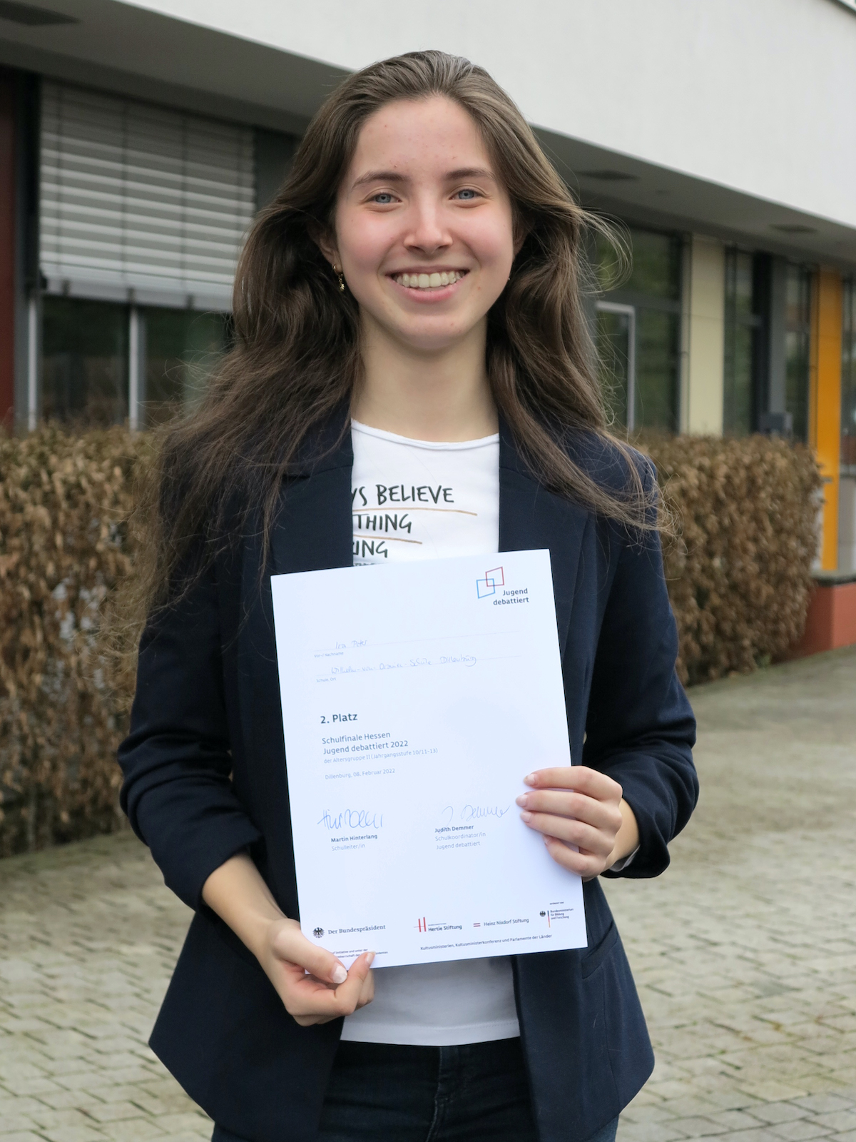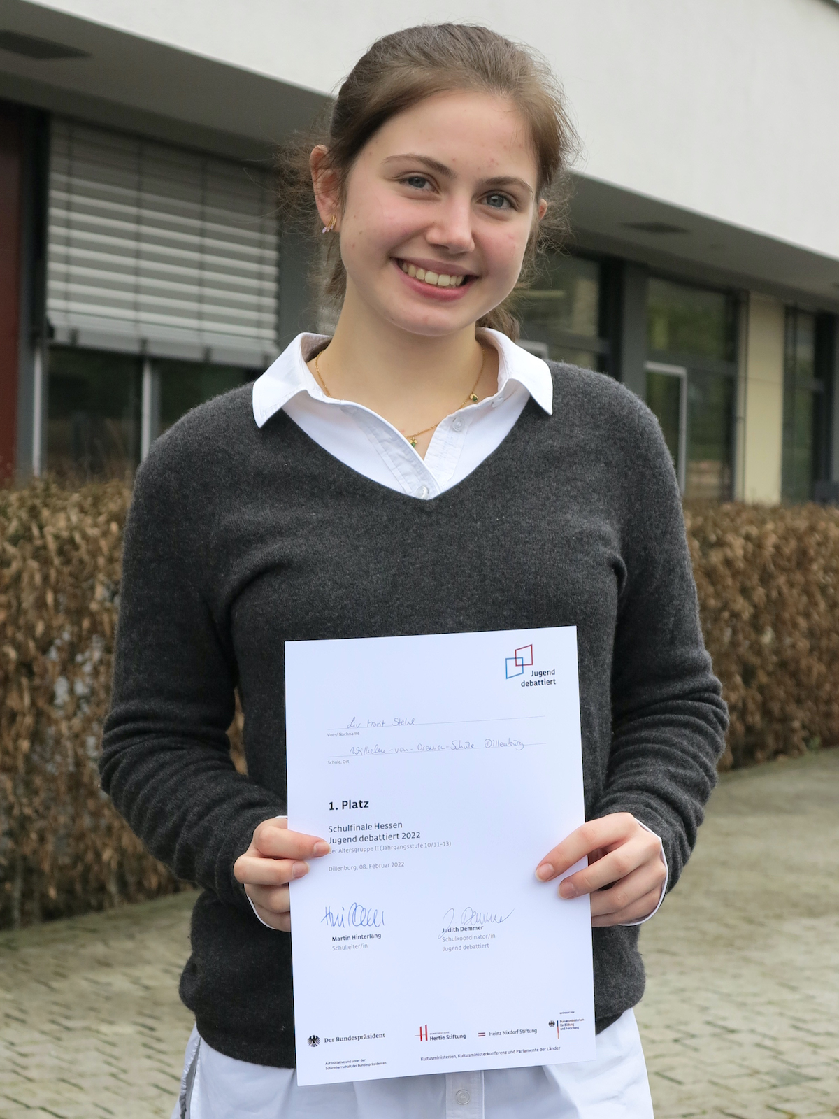 Mir persönlich hat der Schulentscheid jedoch besser gefallen, da wir vor Ort debattiert haben und direkt miteinander reden konnten. Dies war im Regionalentscheid anders, der online stattgefunden hat. Dennoch muss man da ein Lob an die Organisatoren aussprechen, weil es sehr gut organisiert war und es keine Zwischenfälle oder Störungen gab.