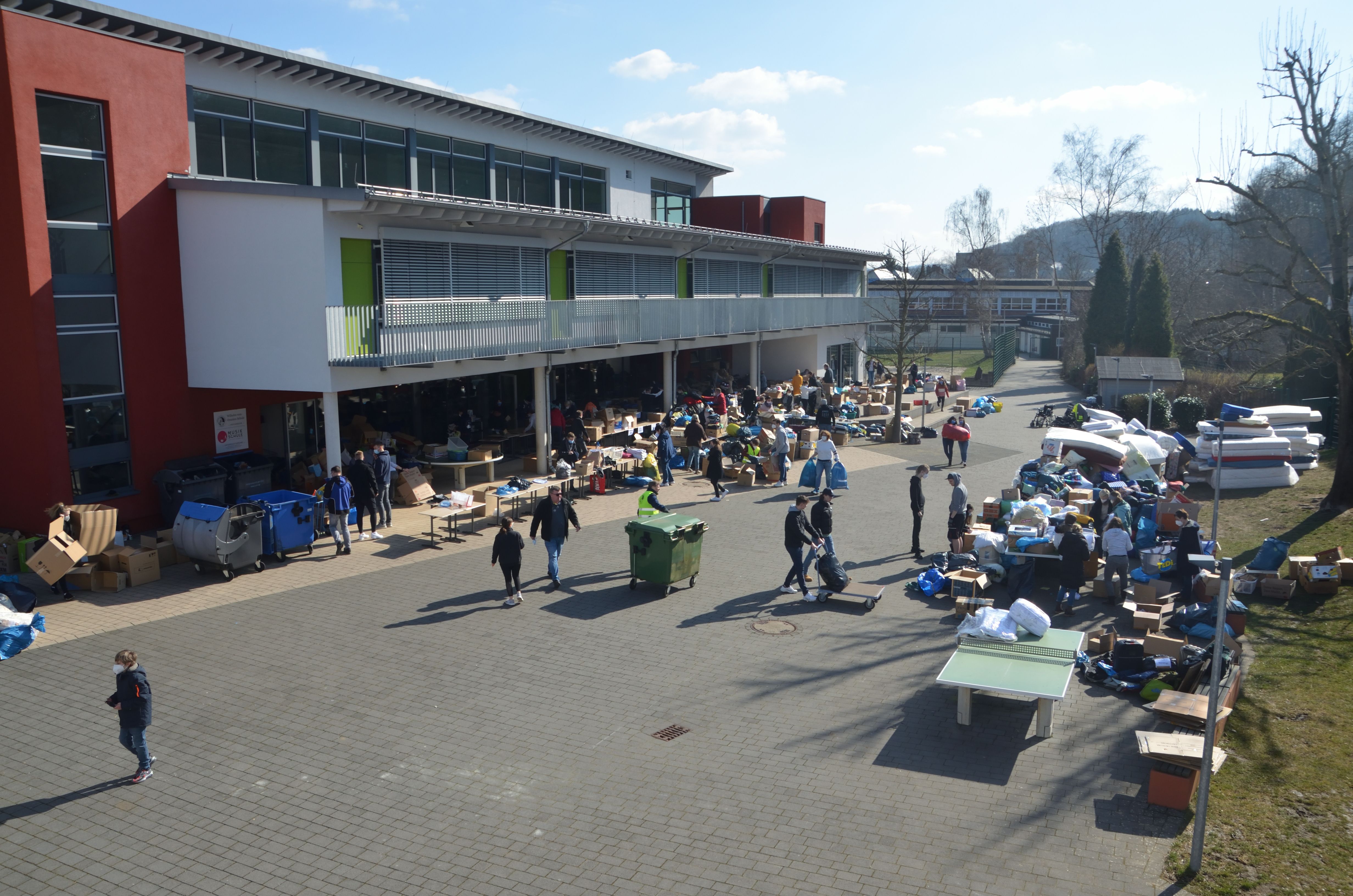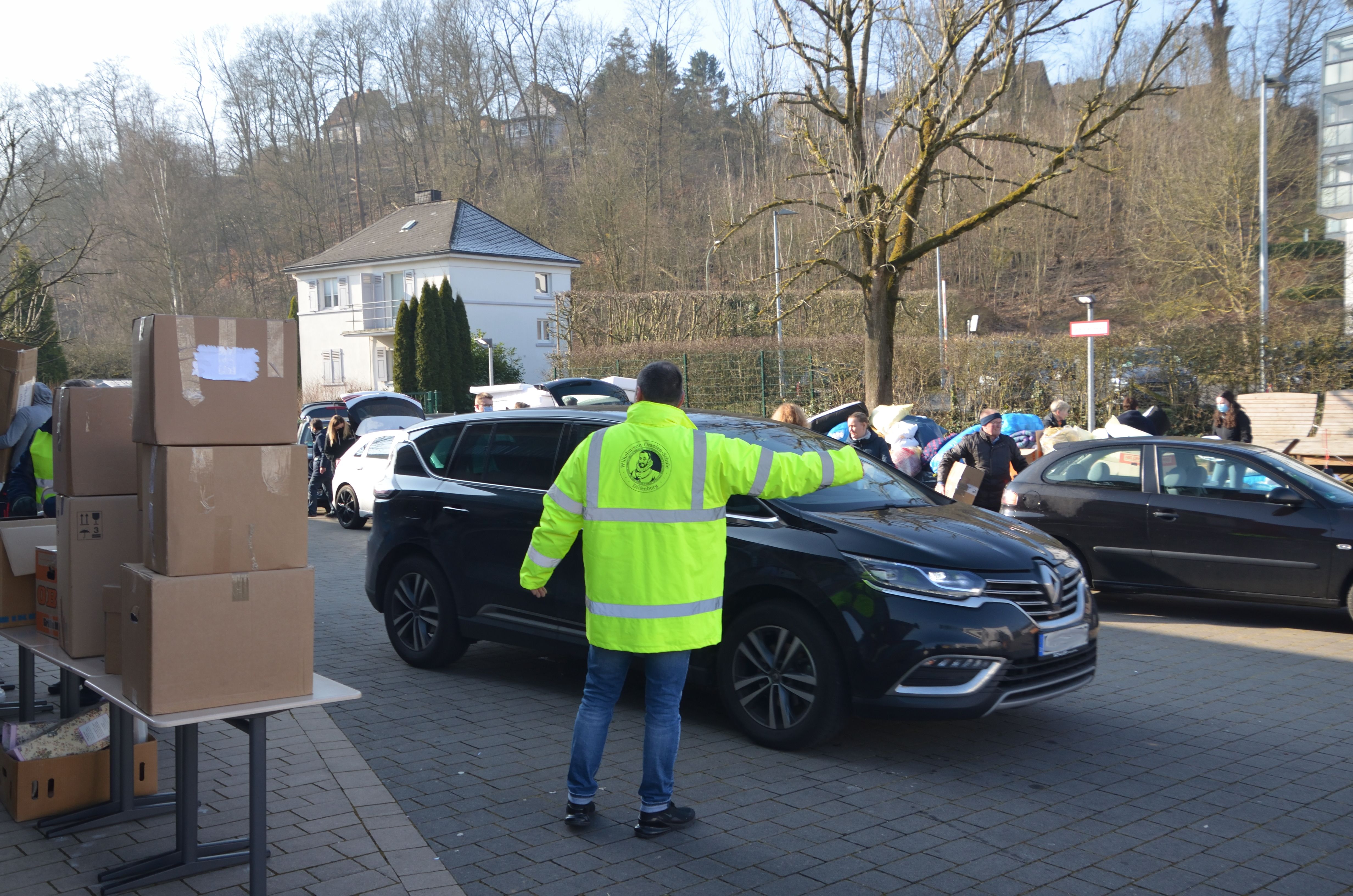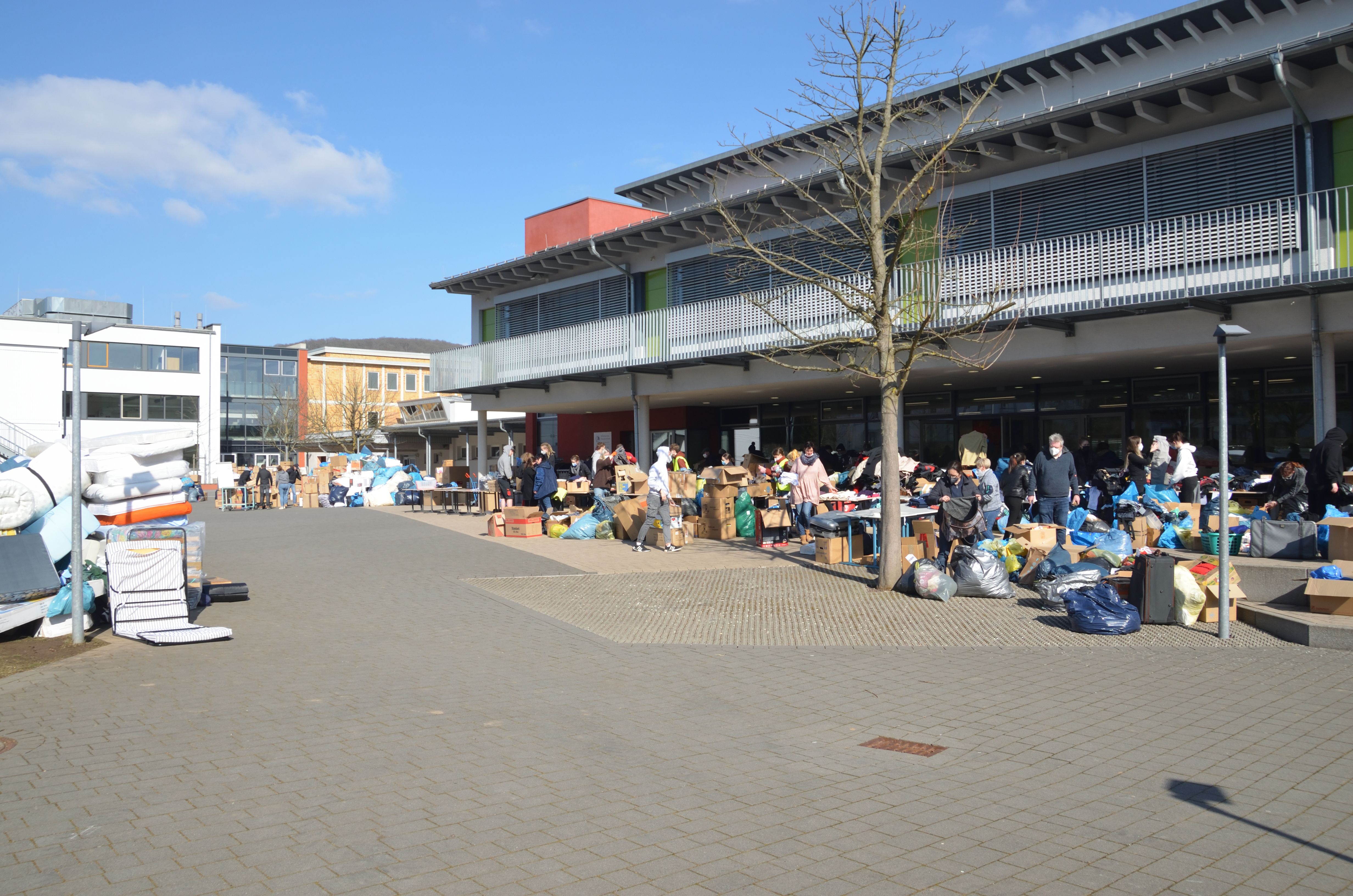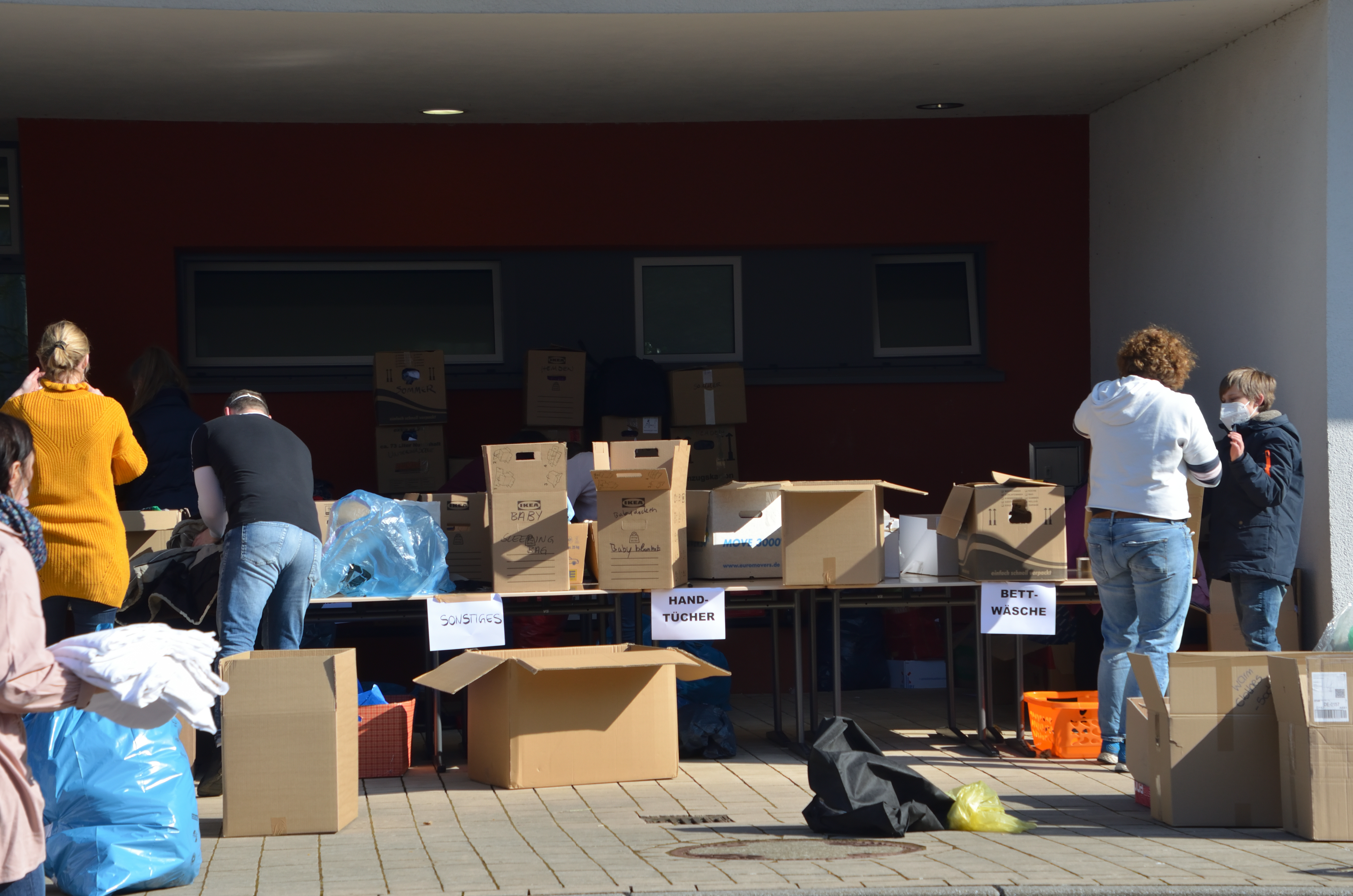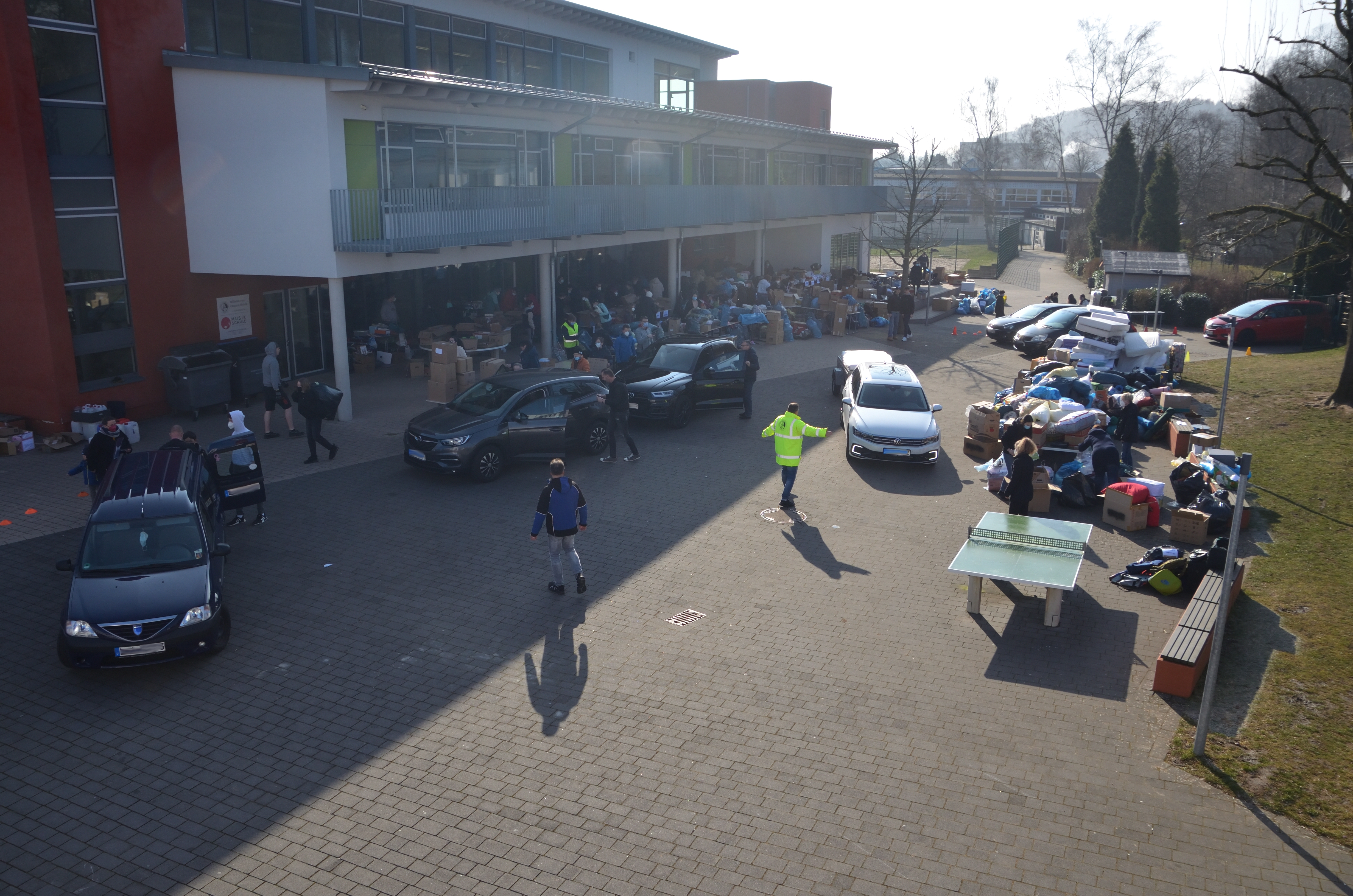 Um den Sammelpunkt der Ukrainehilfe Breitscheid in Frohnhausen zu entlasten, hatte die Wilhelm-von-Oranien-Schule kurzerhand am Samstag einen zweiten Stützpunkt eingerichtet. Der Flut der gespendeten Materialien – Verbandmaterial, Kleidung, Matratzen, Zelte, Nahrungsmittel, Medikamente usw. – war zunächst kaum Herr zu werden, ca. 80 Helferinnen und Helfer packten kräftig mit an. Dazu gehörten zahlreiche Schülerinnen und Schüler, Eltern, Lehrkräfte und Mitarbeiter der Schule, aber auch Ehemalige und Freunde.
