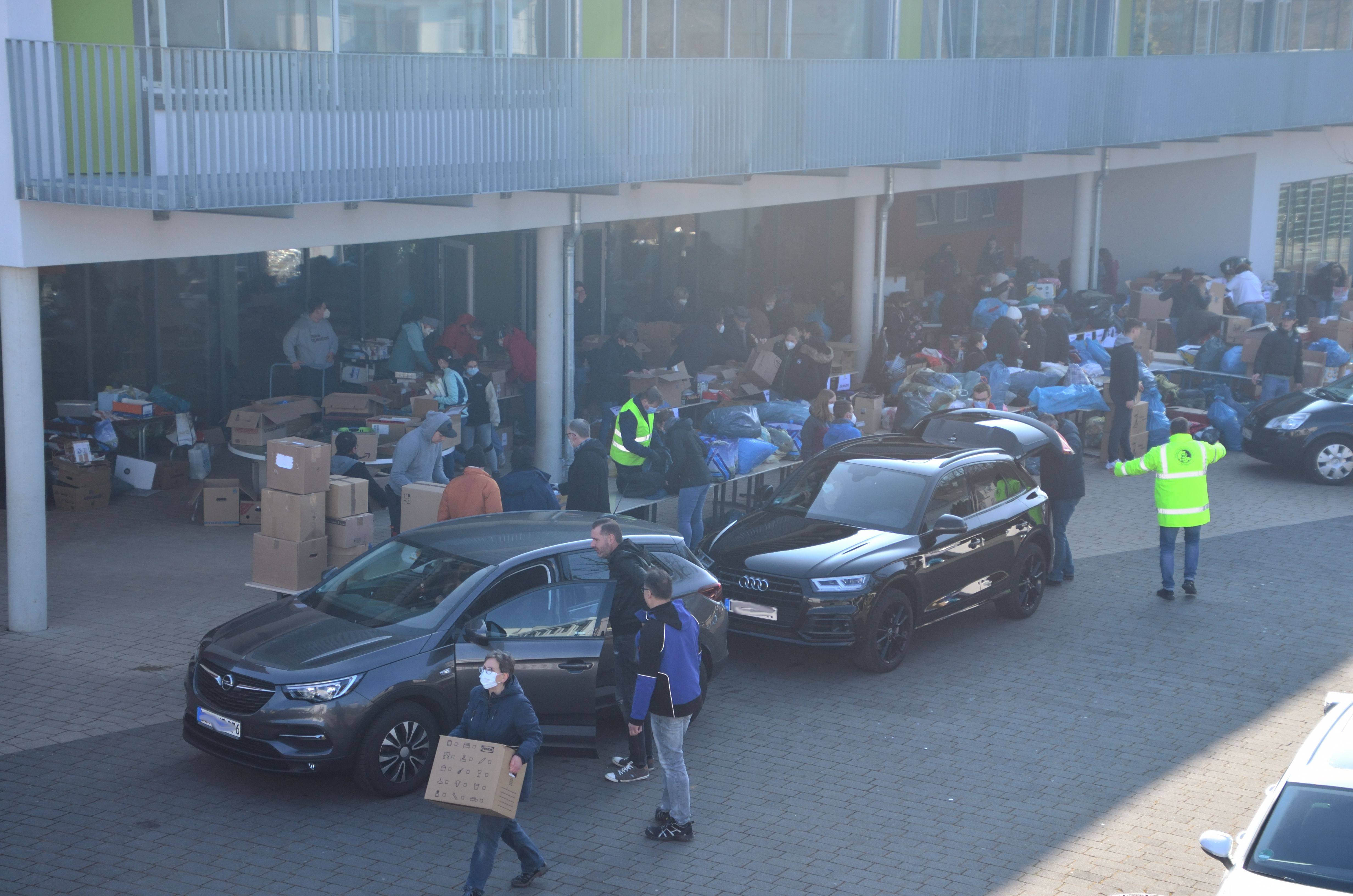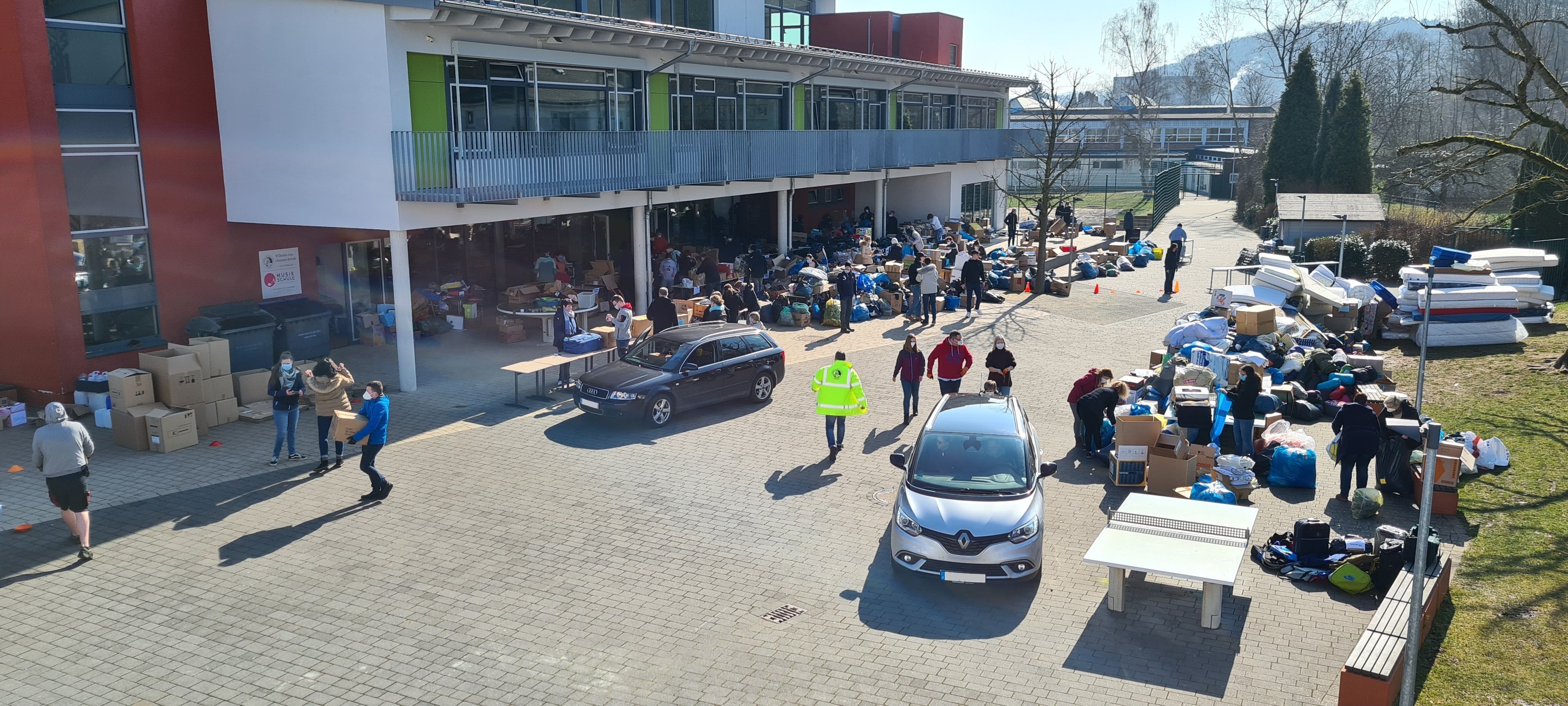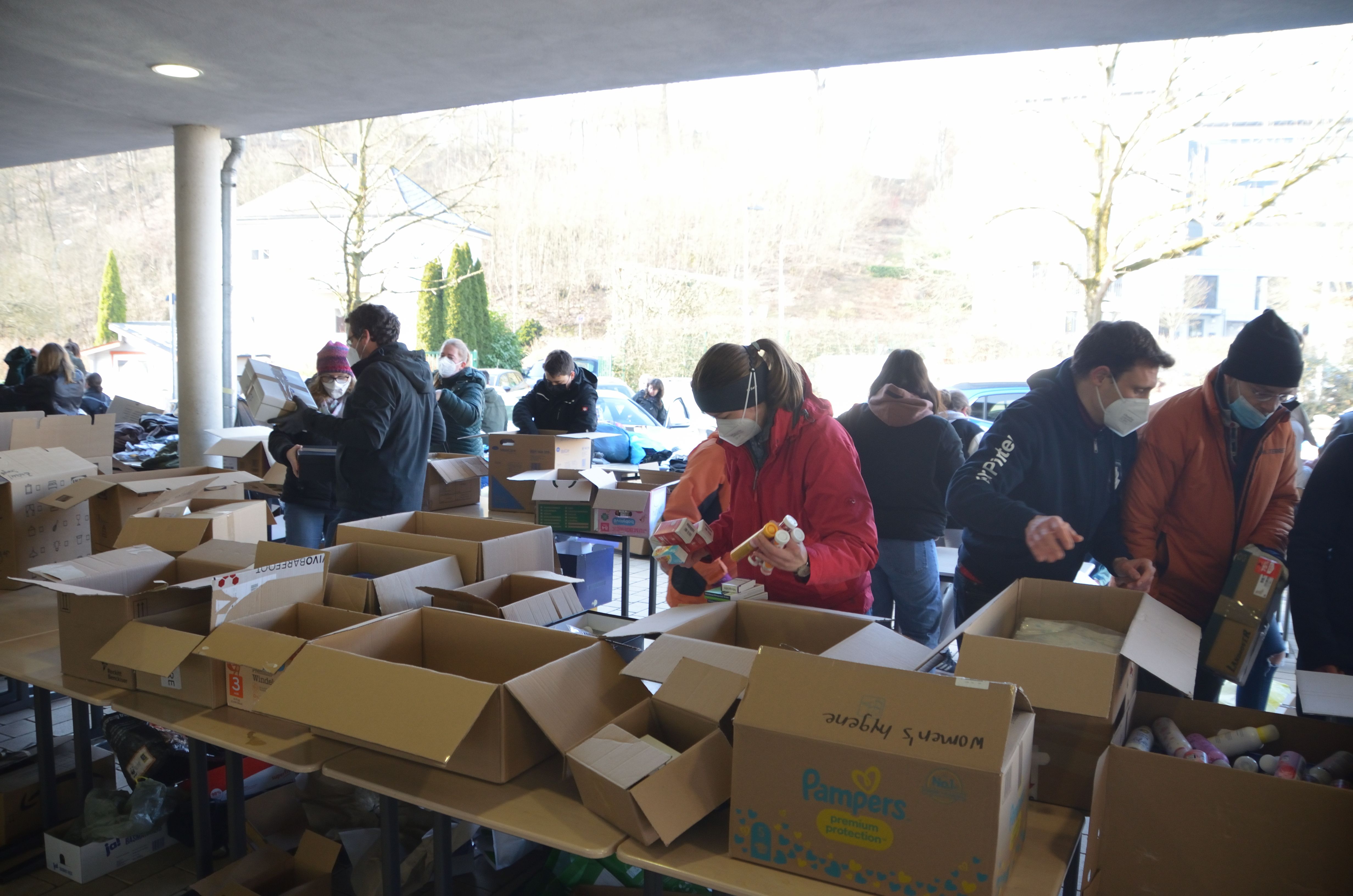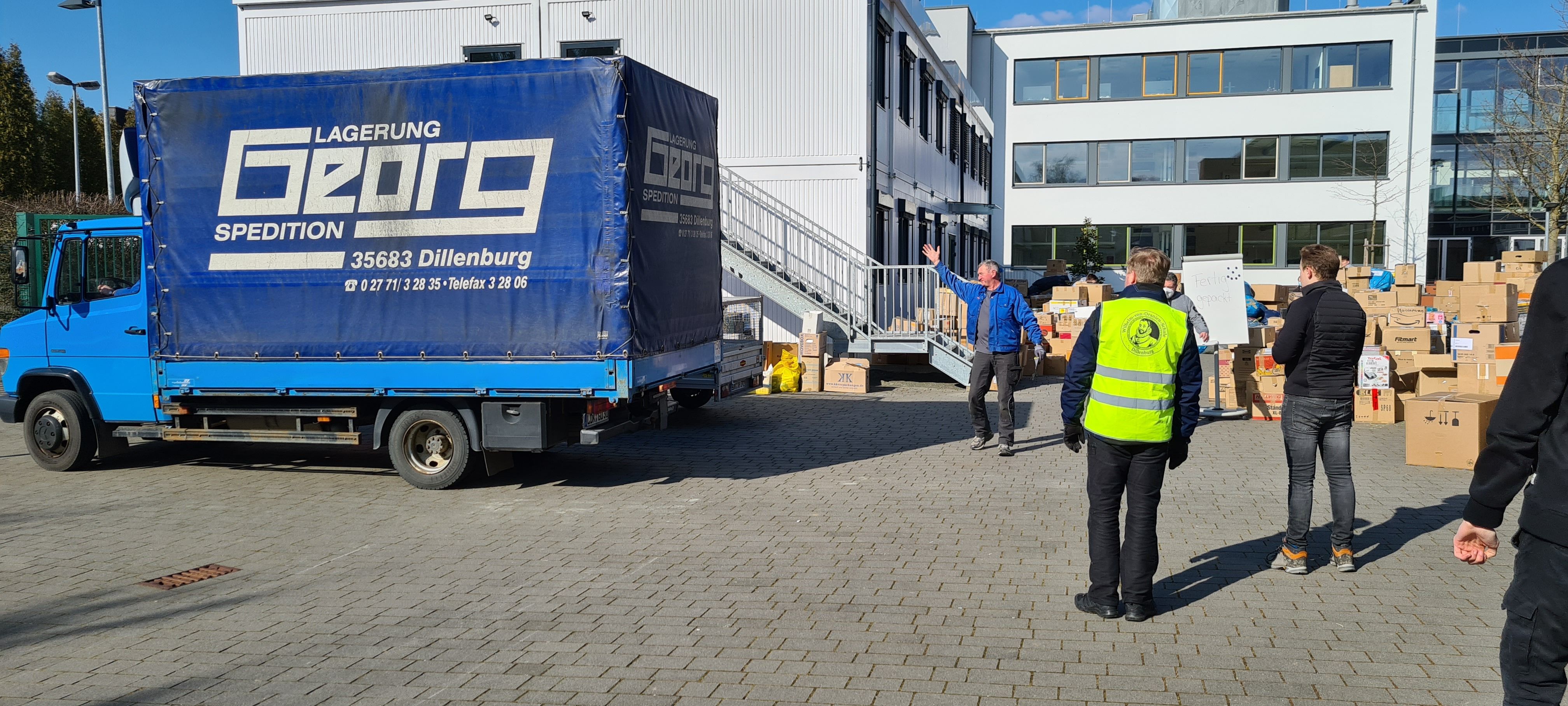 Um den Sammelpunkt der Ukrainehilfe Breitscheid in Frohnhausen zu entlasten, hatte die Wilhelm-von-Oranien-Schule kurzerhand am Samstag einen zweiten Stützpunkt eingerichtet. Der Flut der gespendeten Materialien – Verbandmaterial, Kleidung, Matratzen, Zelte, Nahrungsmittel, Medikamente usw. – war zunächst kaum Herr zu werden, ca. 80 Helferinnen und Helfer packten kräftig mit an. Dazu gehörten zahlreiche Schülerinnen und Schüler, Eltern, Lehrkräfte und Mitarbeiter der Schule, aber auch Ehemalige und Freunde.