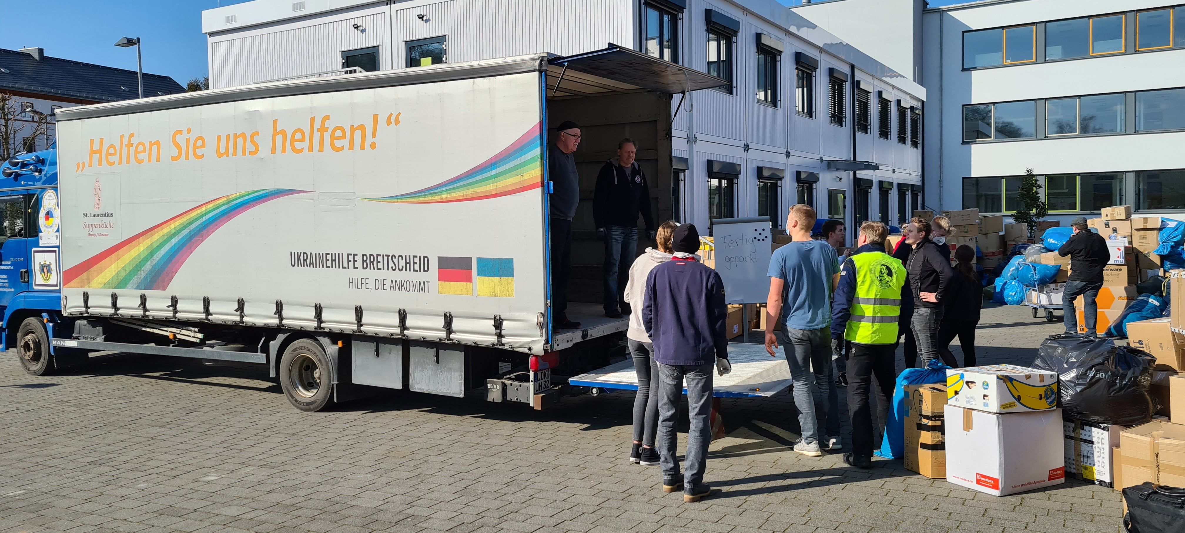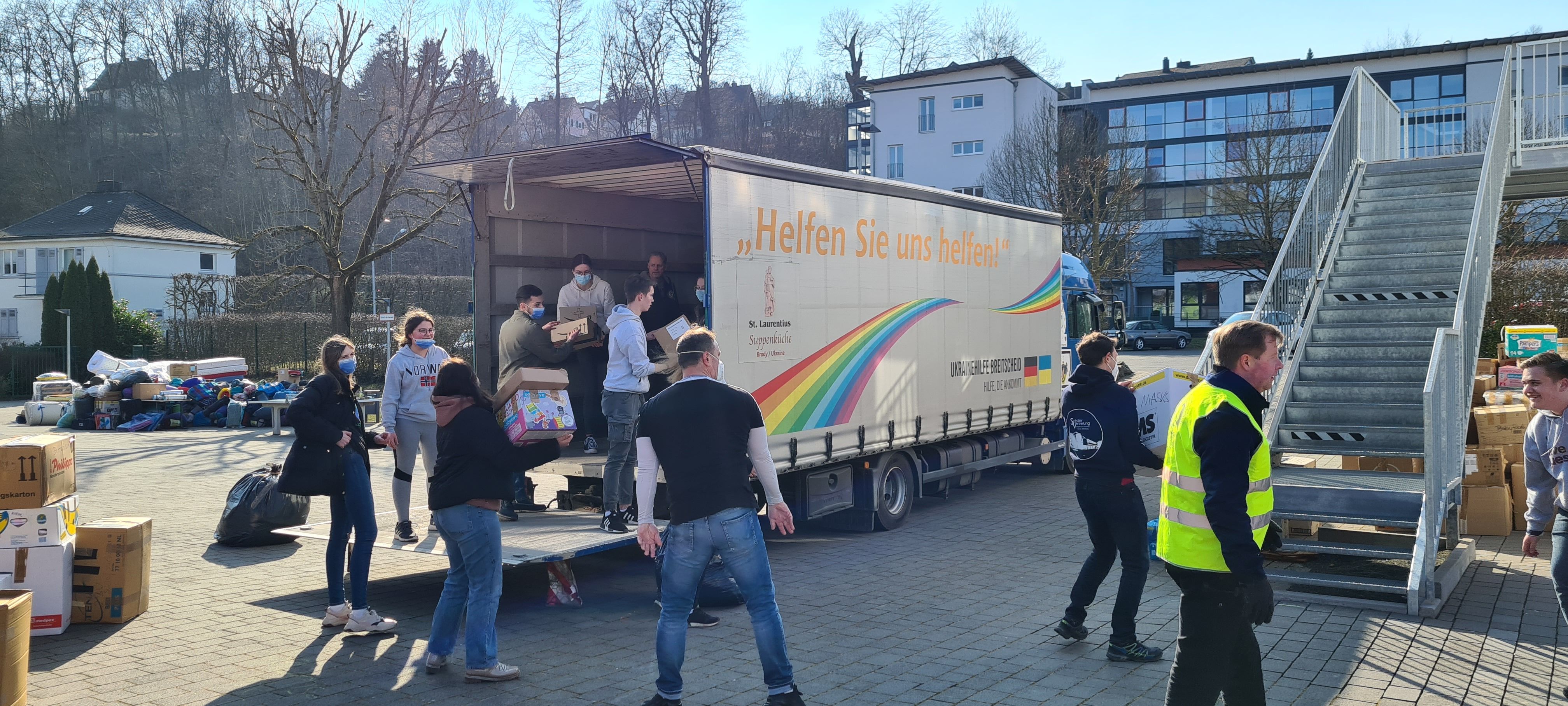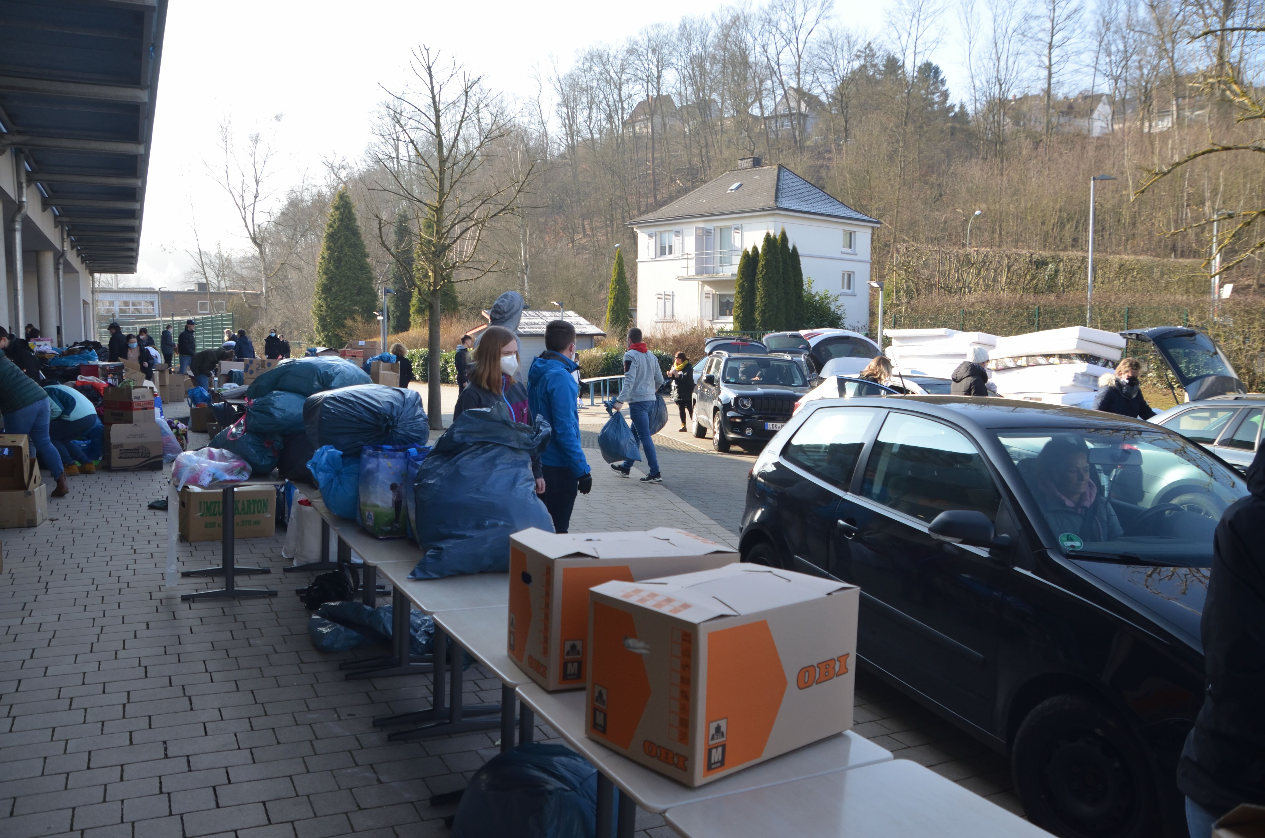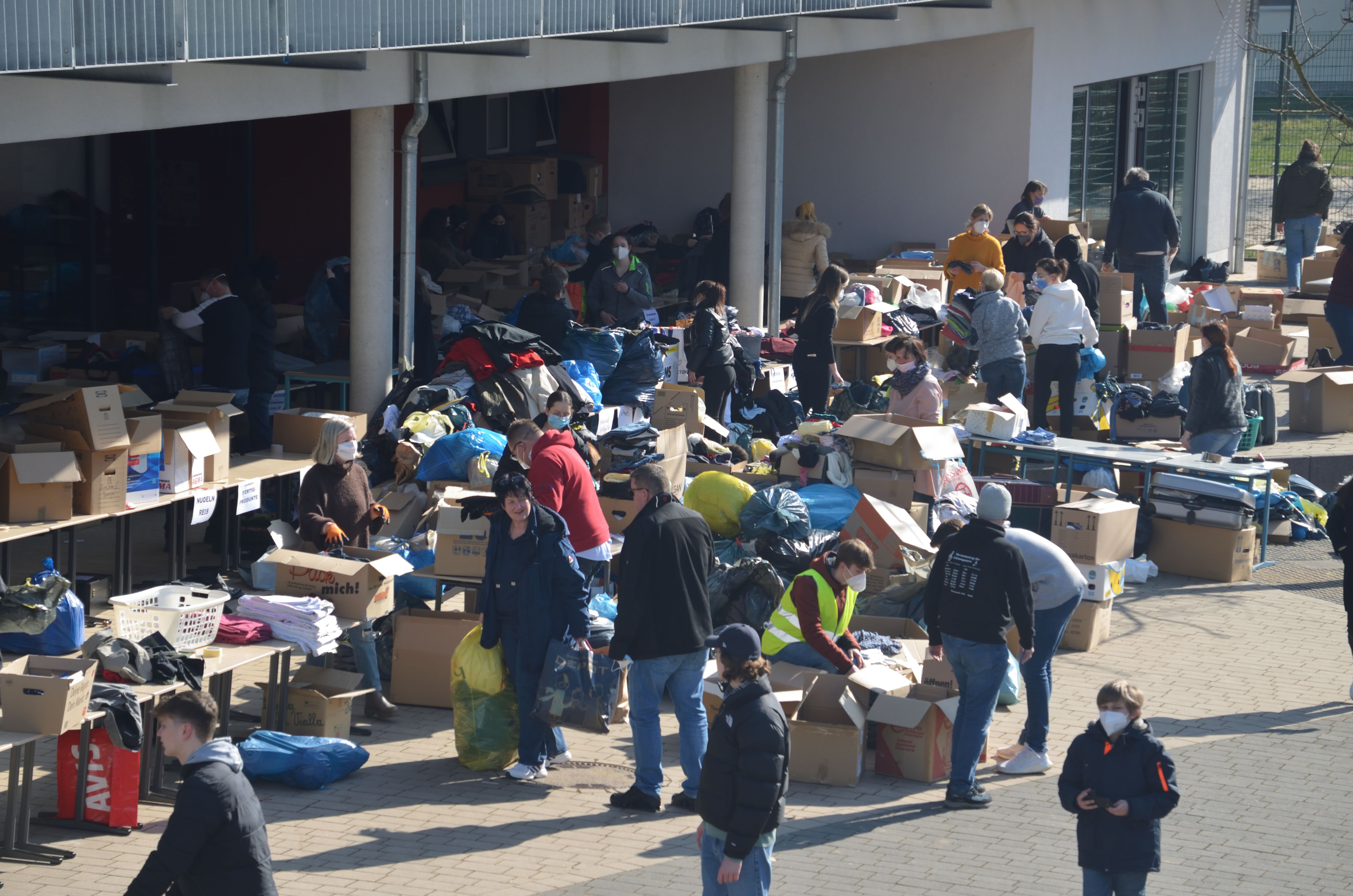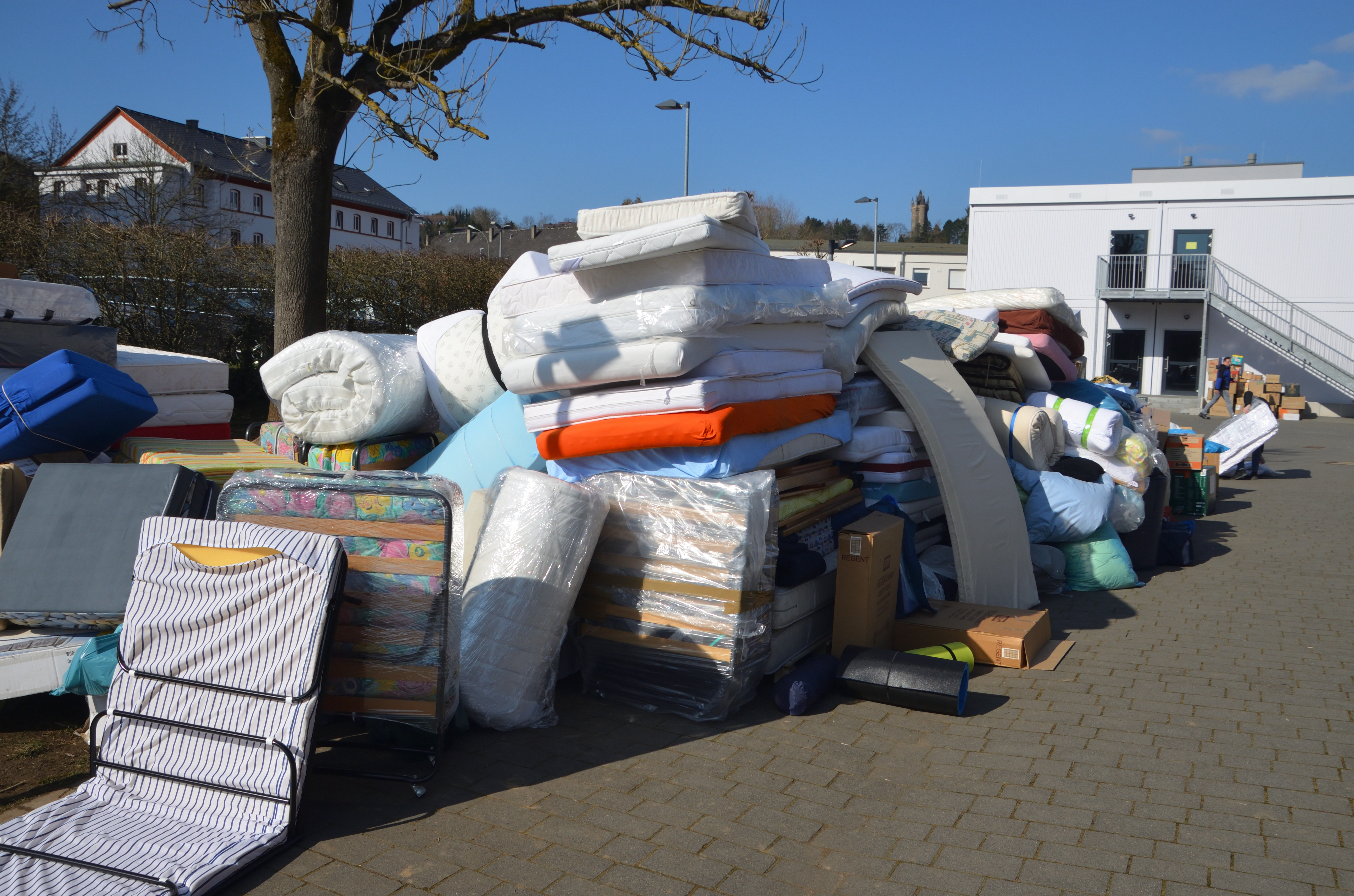 Um den Sammelpunkt der Ukrainehilfe Breitscheid in Frohnhausen zu entlasten, hatte die Wilhelm-von-Oranien-Schule kurzerhand am Samstag einen zweiten Stützpunkt eingerichtet. Der Flut der gespendeten Materialien – Verbandmaterial, Kleidung, Matratzen, Zelte, Nahrungsmittel, Medikamente usw. – war zunächst kaum Herr zu werden, ca. 80 Helferinnen und Helfer packten kräftig mit an. Dazu gehörten zahlreiche Schülerinnen und Schüler, Eltern, Lehrkräfte und Mitarbeiter der Schule, aber auch Ehemalige und Freunde.