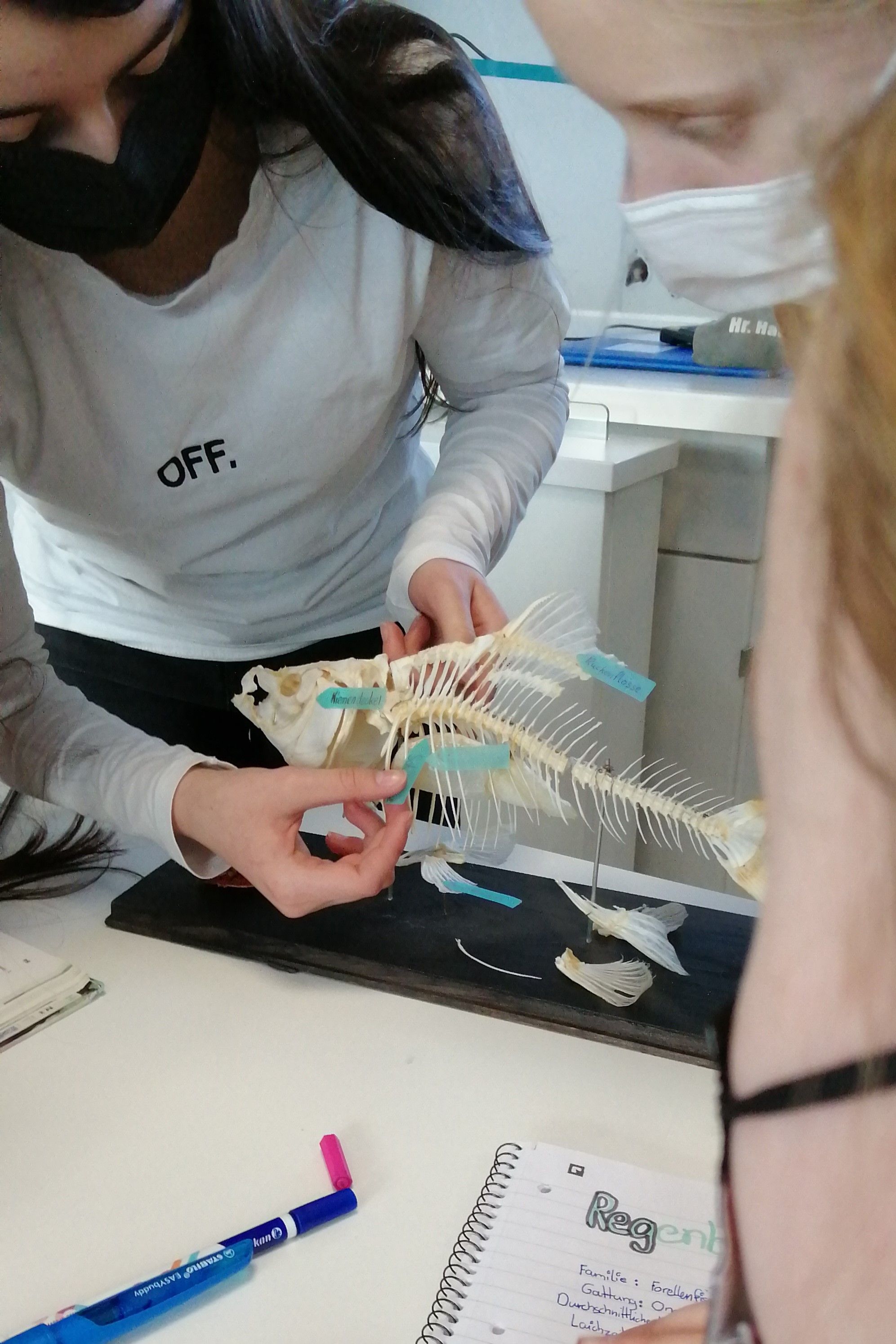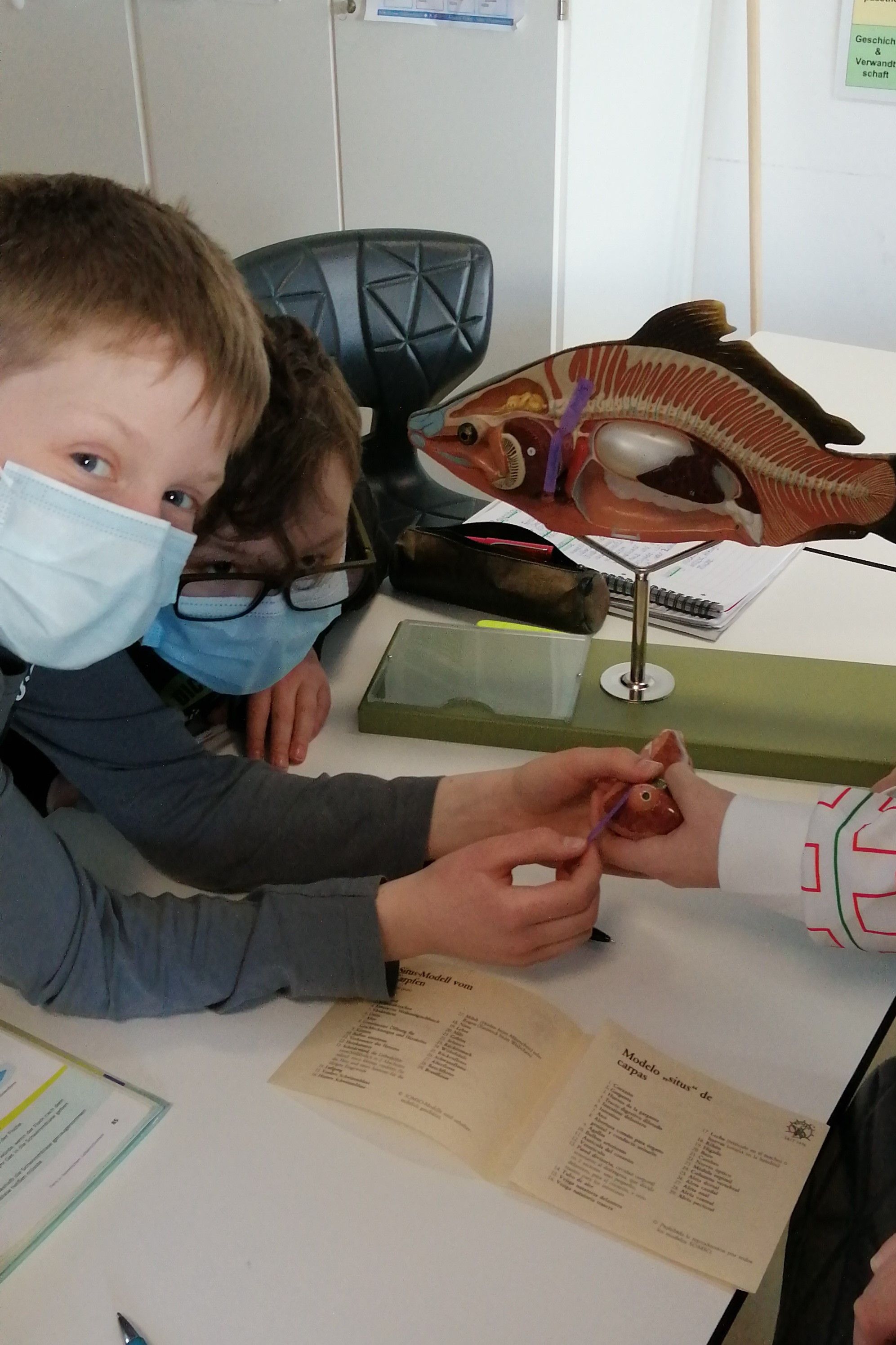 Die Klasse 06 B hat im Rahmen ihres Biologieunterrichts die Möglichkeit, Fische genauer zu untersuchen. Nachdem in vorangegangenen Unterrichtstunden bereits Fische im Aquarium beobachtet wurden, konnten der Aufbau und die Angepasstheit von Fischen an das Leben im Wasser genauer untersucht werden. So konnte bei der Arbeit mit einem Strukturmodell eines Karpfens und der Untersuchung eines echten Karpfenskeletts auf Materialien aus der Biologie-Sammlung der Schule zurückgegriffen werden. Für die Präparation einer Regenbogenforelle bekam die Klasse Unterstützung eines Anglers.