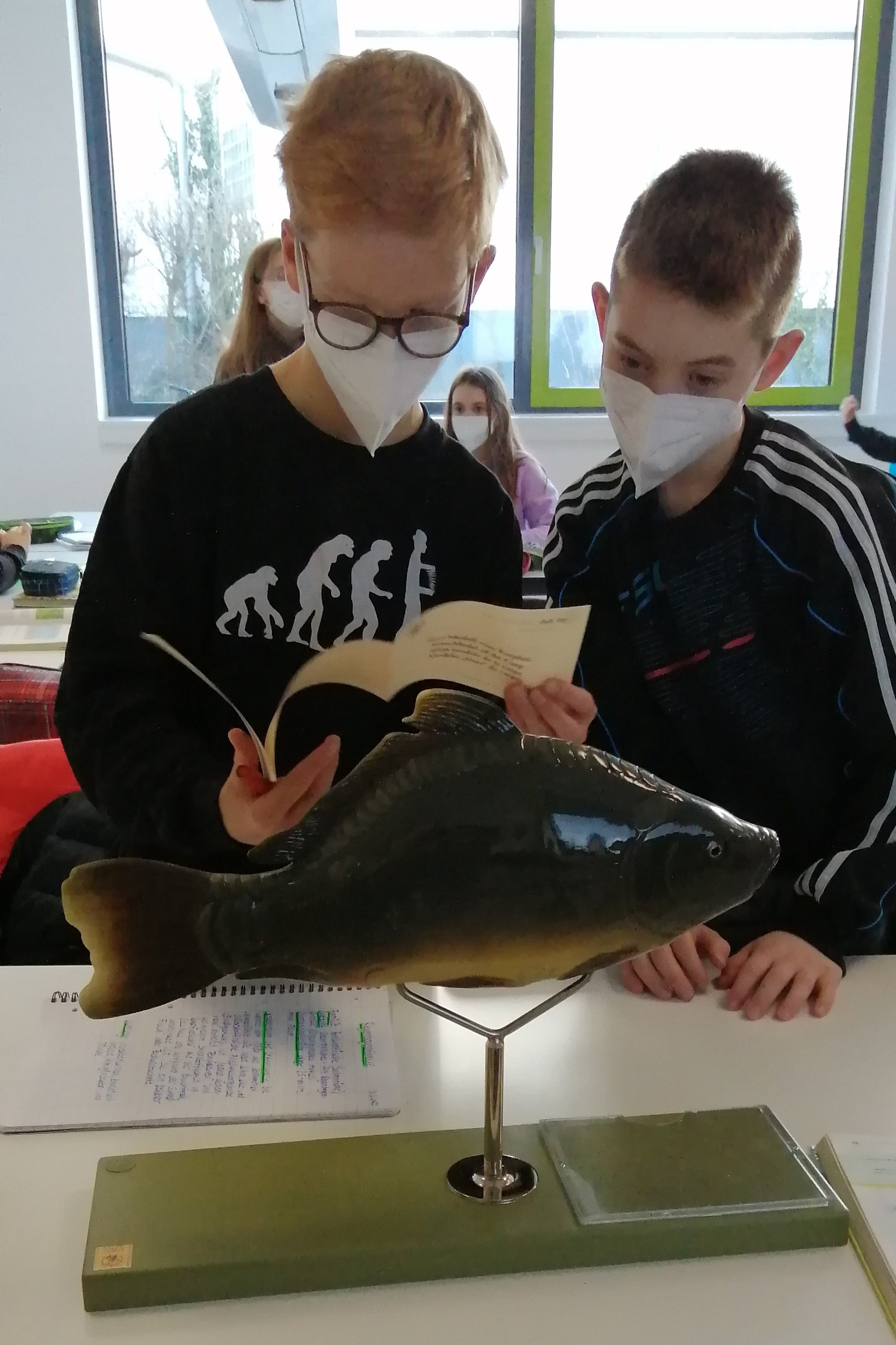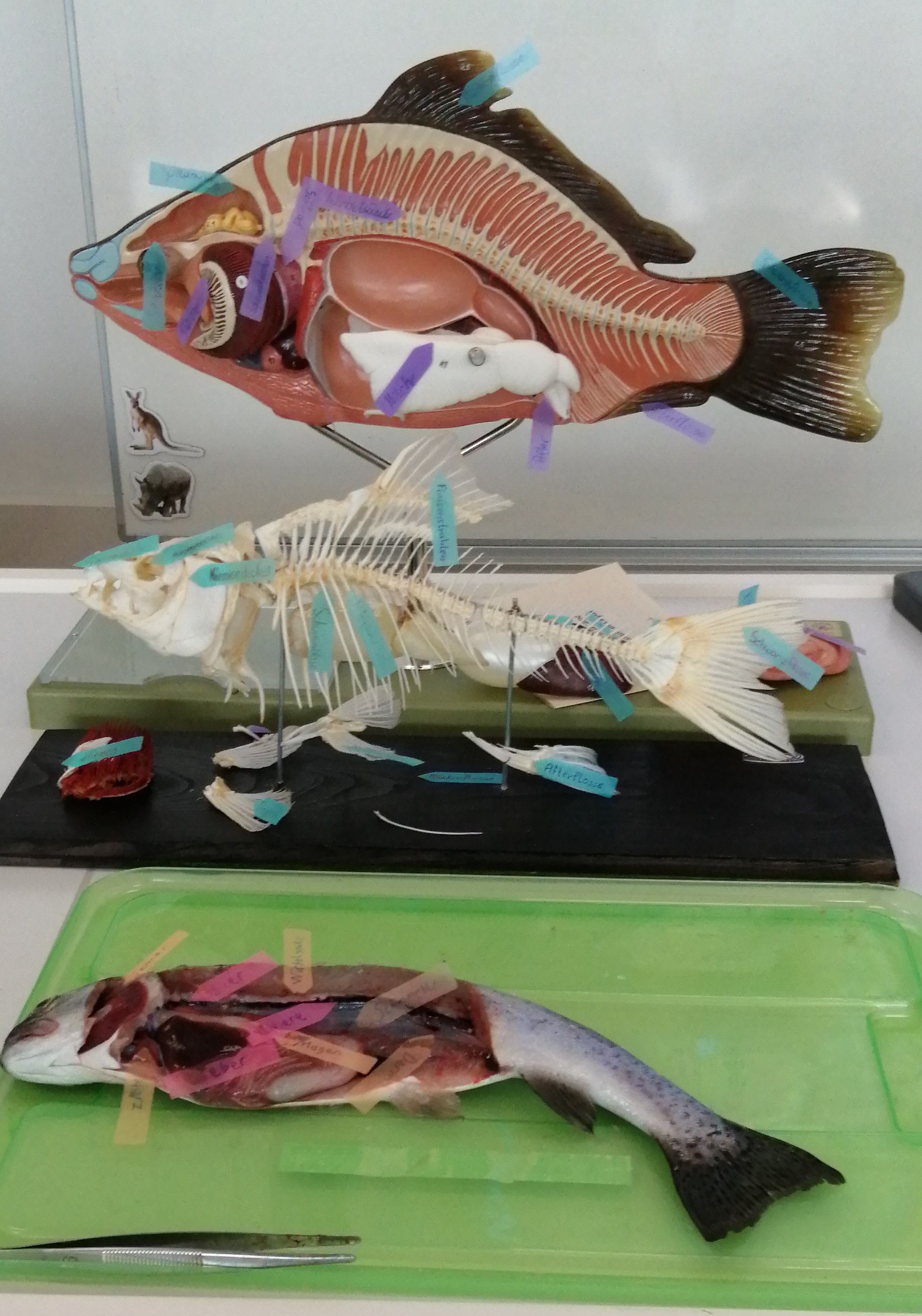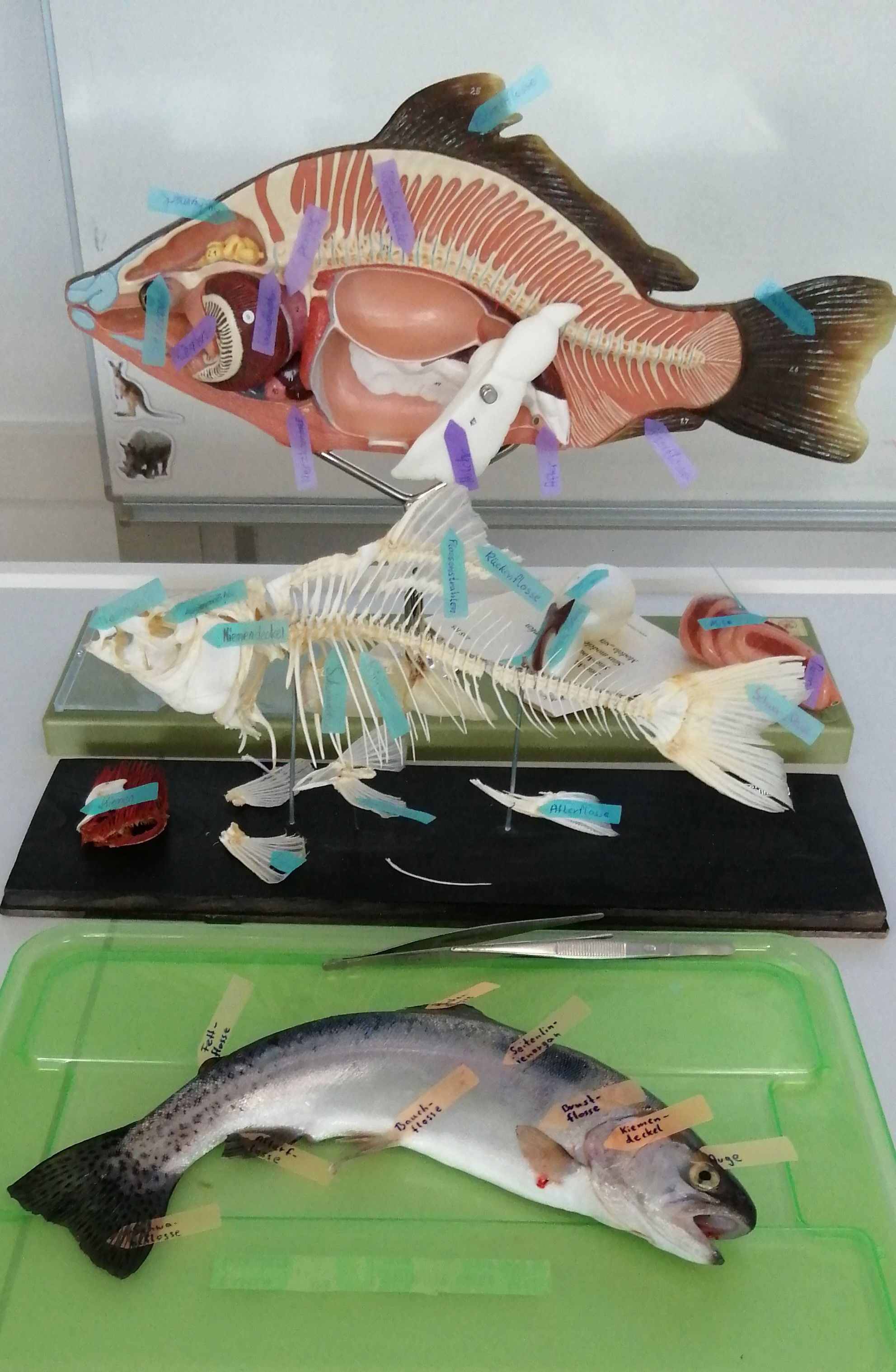 Das neu angeschaffte Kunststoffmodell der Biologiesammlung stellt einen ca. 40 cm großen Karpfen dar. Die rechte Körperhälfte ist naturgetreu gehalten und wirkt so sehr realistisch. Die linke Körperseite ist als bereits freipräpariertes Strukturmodell gestaltet. Hier können alle wesentlichen Organe des Kopf- und Bauchbereichs betrachtet und teilweise auch herausgenommen werden, wobei das spätere Zusammensetzen des Modells die größere Herausforderung darstellt. Ziffern auf den einzelnen Strukturen und Organen und eine beigefügte Beschreibung helfen bei der Benennung und in unserem Fall bei der Beschriftung mit Hilfe von kleinen Post-its.