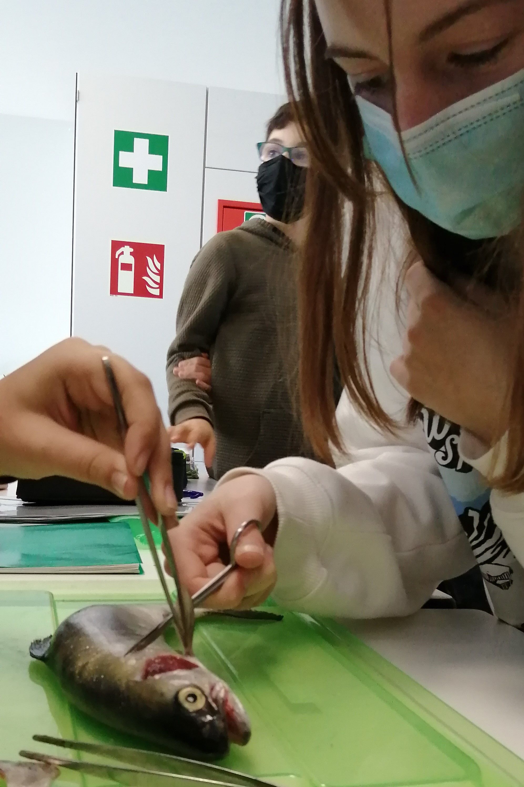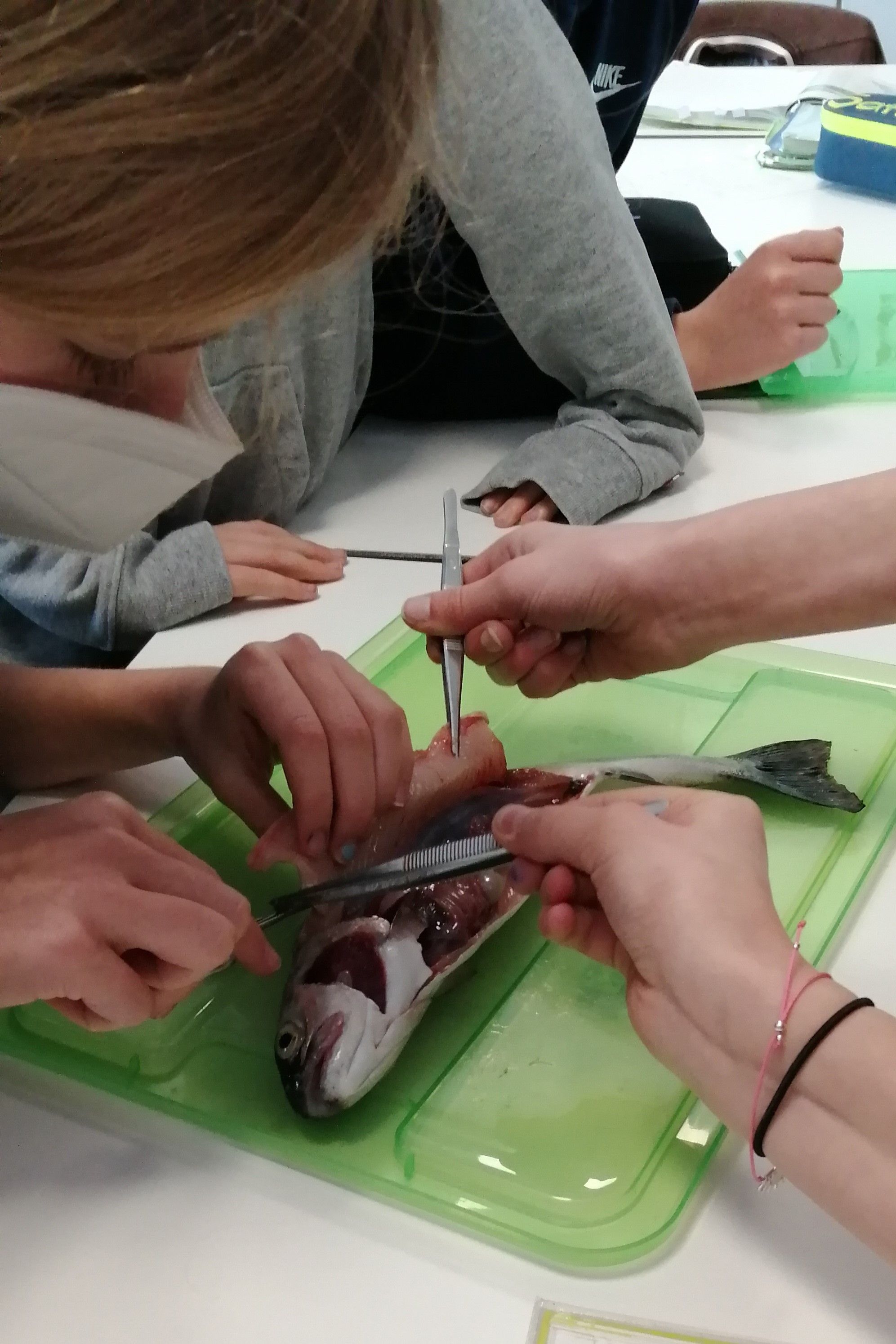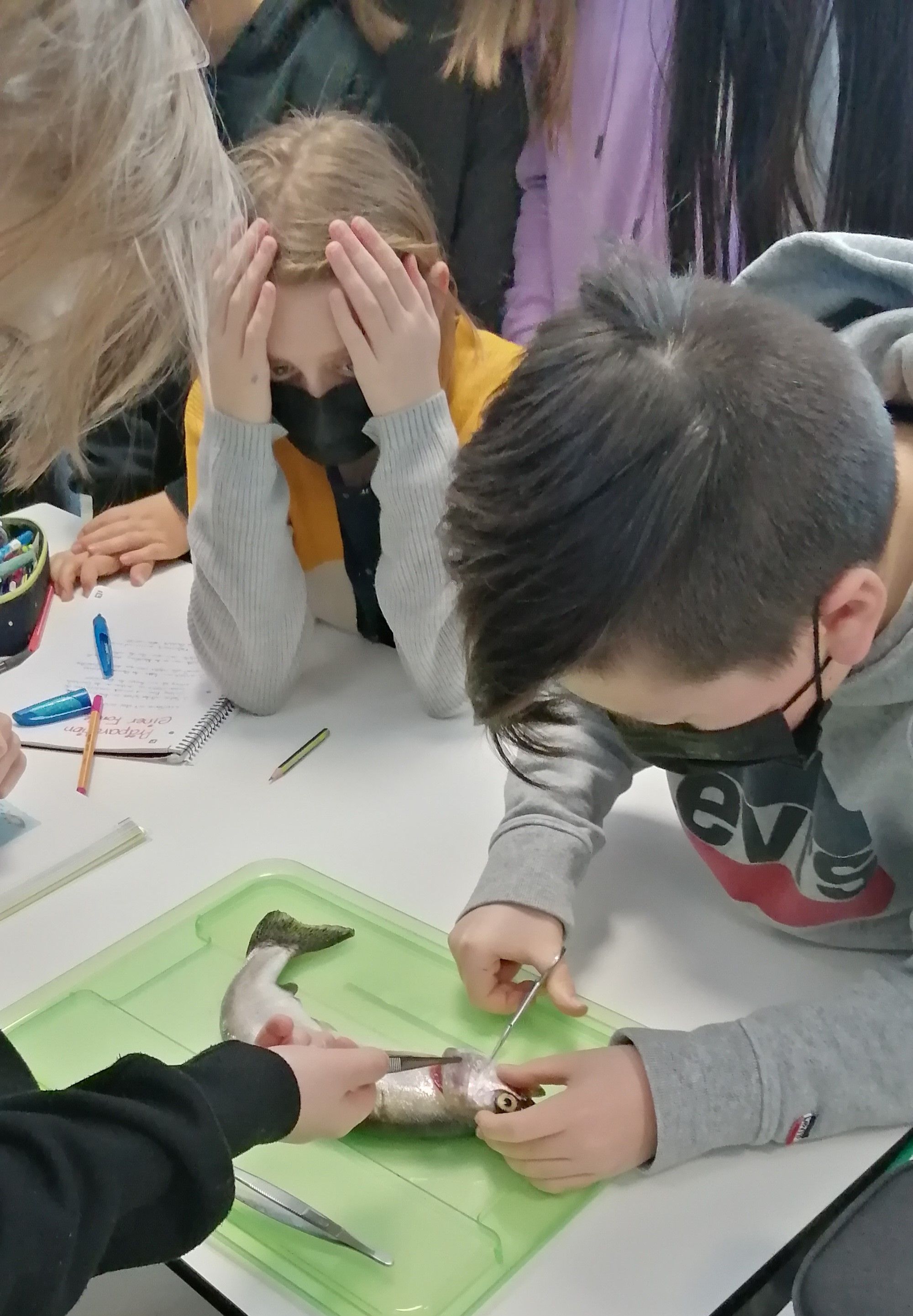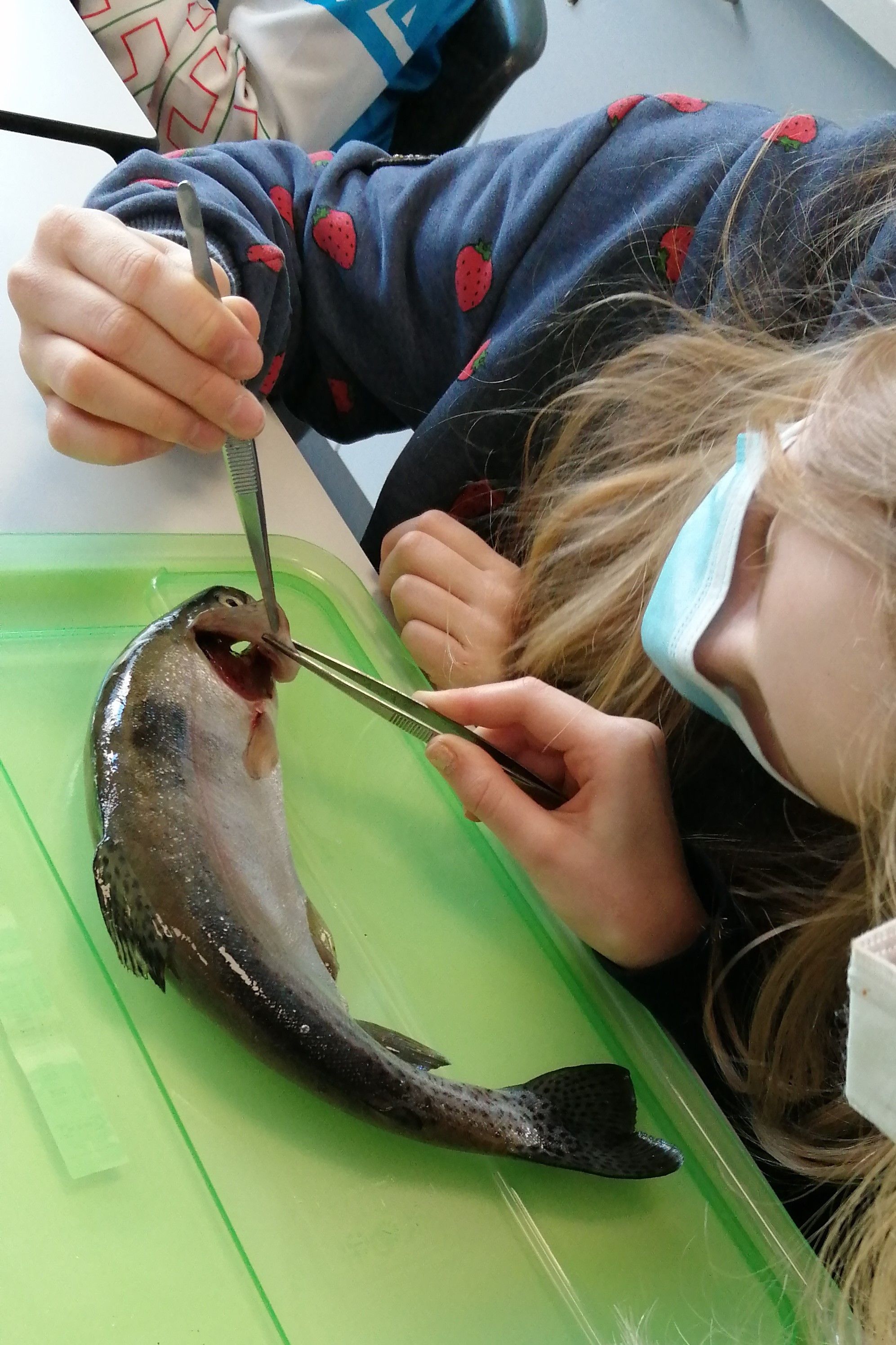 „Ich habe gelernt, dass Fische echt gar nicht viel Blut haben und dass das Herz klein ist. Und dass die Fischhaut noch eine Schleimschicht hat, die sich viel schleimiger anfühlt als ich dachte. Das Präparieren habe ich mir erst eklig vorgestellt, aber dann war es gar nicht so schlimm. Es war dann eher interessant.“ (Chiyara)