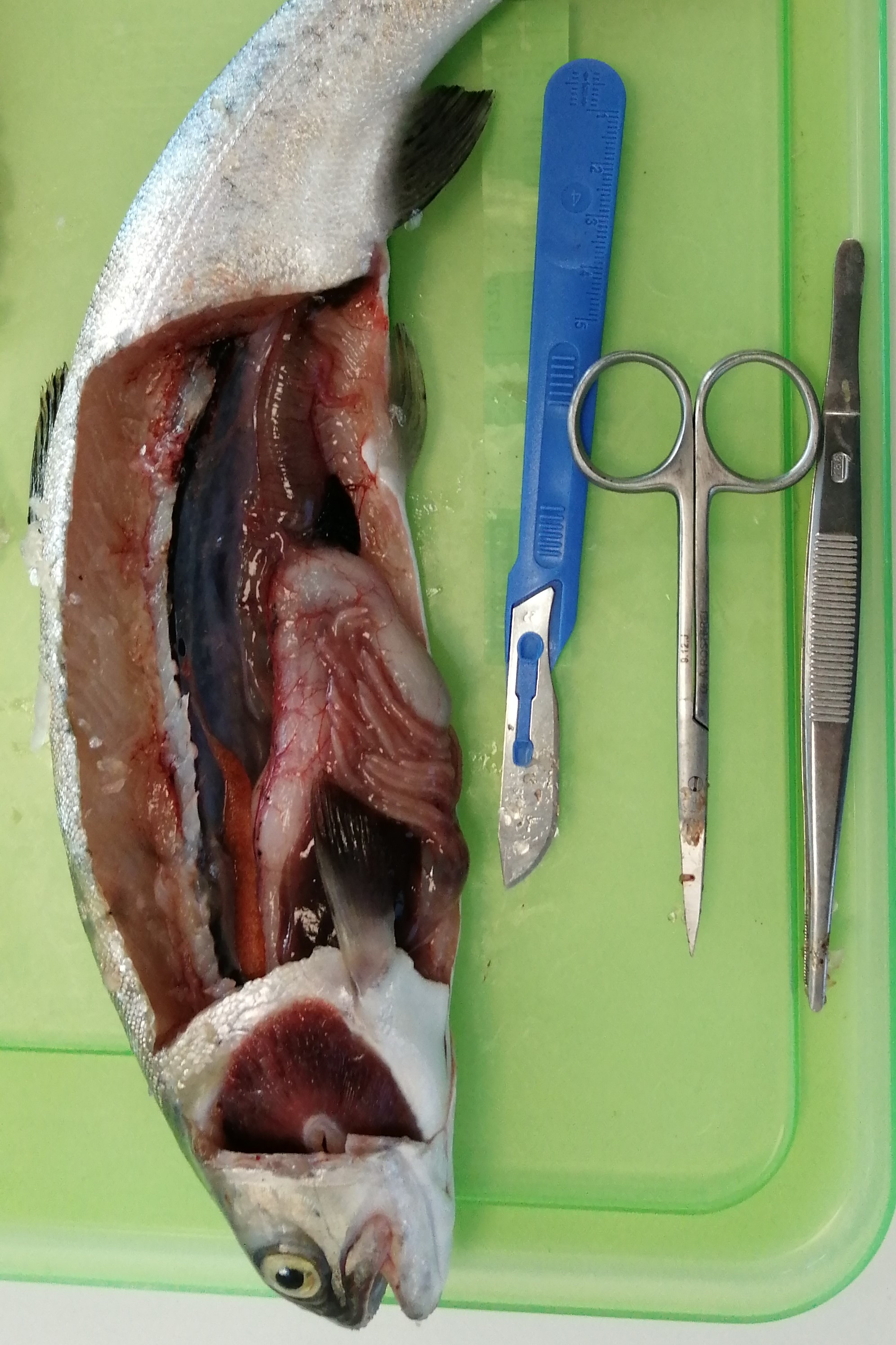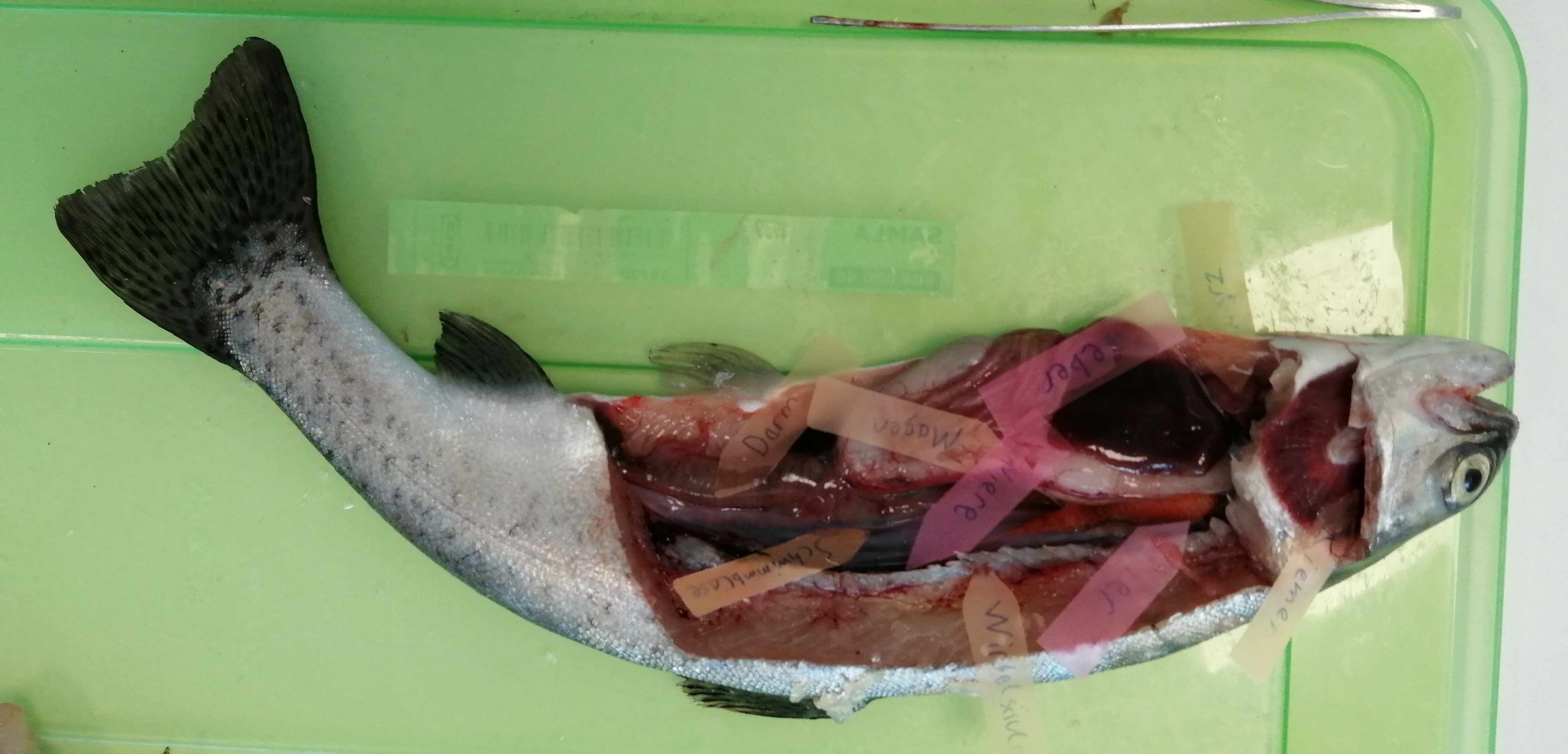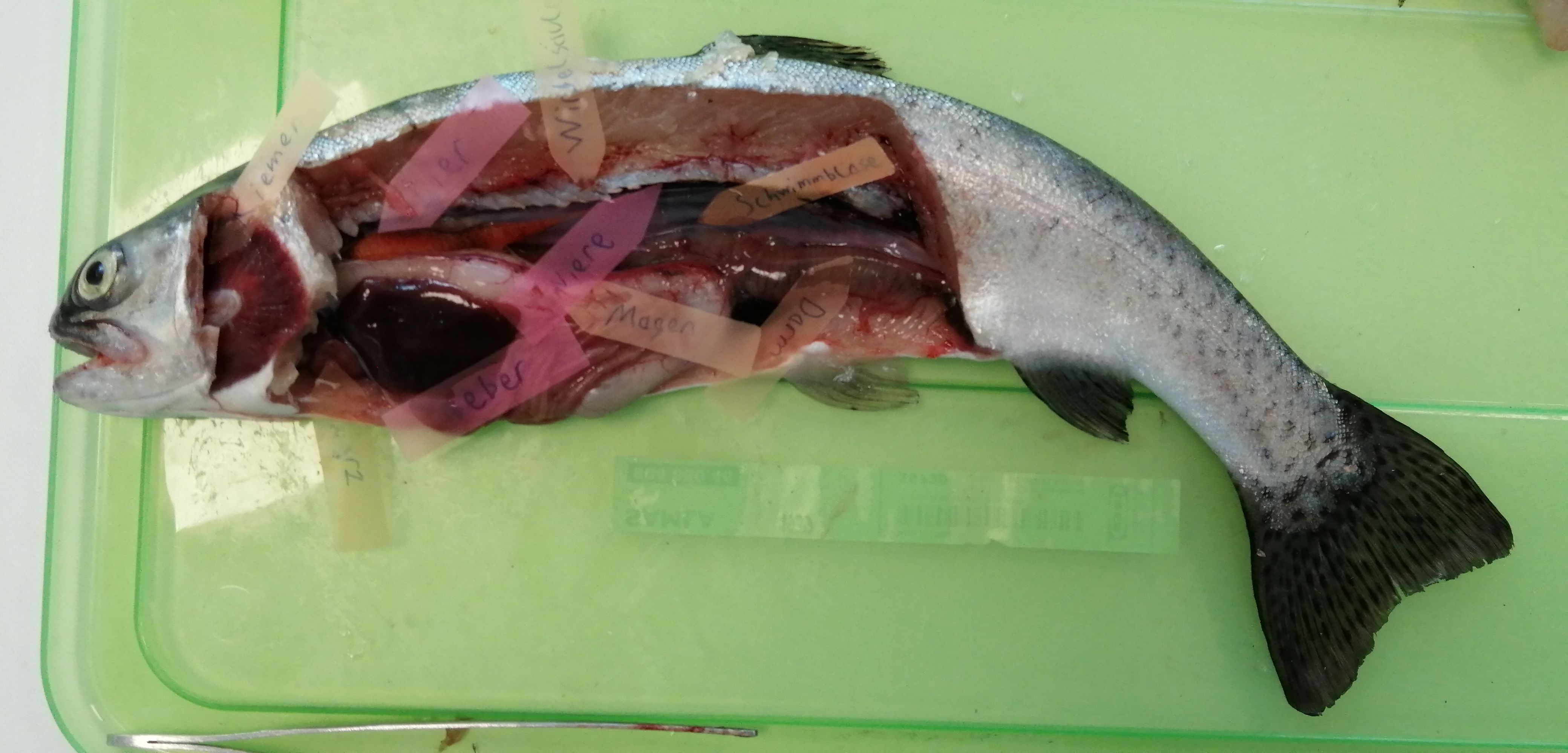 „Je mehr man den Fisch aufschneidet, desto mehr stinkt es. Der Magen der Regenbogenforelle ist hautfarben. Die Leber des Fisches ist dunkelbraun. Wie ein schwarzer Faden ziehen sich die Nieren die Wirbelsäule entlang (Die Nieren sind sehr dünn, schwarz und lang). Dieser Fisch war ein junges Weibchen, das erkennt man an der Anzahl der Eier. Wenn ein Weibchen noch jung ist, hat es wenig Eier. Je älter der Fisch wird, desto mehr Eier trägt das Weibchen im Bauch. Wenn man ein älteres Weibchen seziert hätte, wären die Eier aus dem Bauch herausgequollen. Die Eier der Regenbogenforelle haben eine orangene Färbung. Das Herz der Fische ist winzig, klein und liegt unter der Brustflosse. Bei Fischen kann man, ohne etwas abzuschneiden, den Kiemendeckel hochklappen und darunter schauen. Unter dem Kiemendeckel befinden sich die Kiemenlappen, bei dem Weibchen, das wir seziert haben, waren es vier. Ein Fisch hat eine eher härtere Zunge. Eine Regenbogenforelle hat kleine Zähne, die man fast gar nicht sehen kann.“ (Lina)