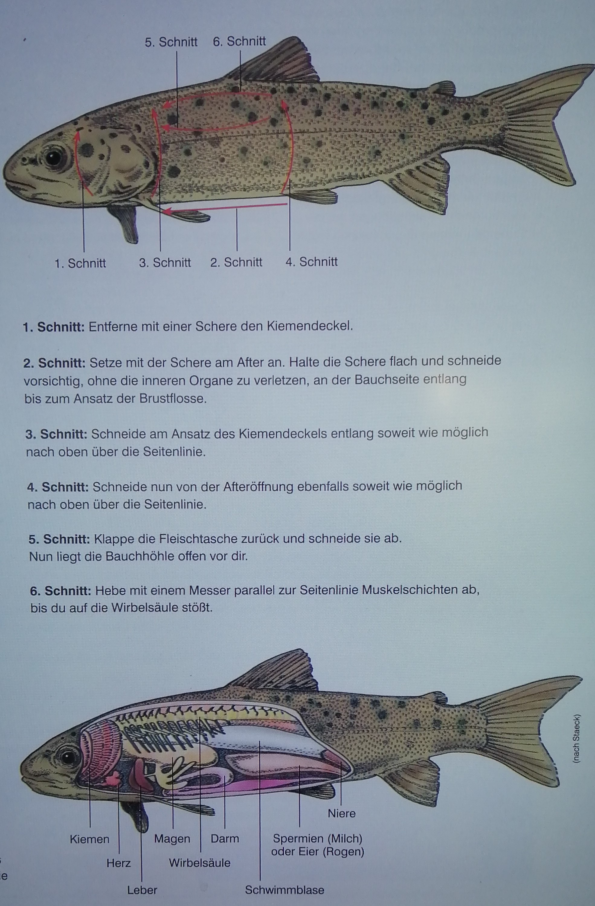 Anschließend griffen einzelne Schülerinnen und Schüler zu Pinzette, Schere und Skalpell und folgten einer Anleitung in sechs Schritten zur Präparation einer Forelle. Ziel war es nun, alle inneren Organe und typischen Anpassungen an den Lebensraum „Wasser“ frei-zu-präparieren. Die folgenden Arbeitsschritte wurden von mehreren Zweier-Teams sehr konzentriert durchgeführt. Die Beschriftung der einzelnen Organe erfolgte mit Hilfe der u.g. Abbildung und dem Biologiebuch.