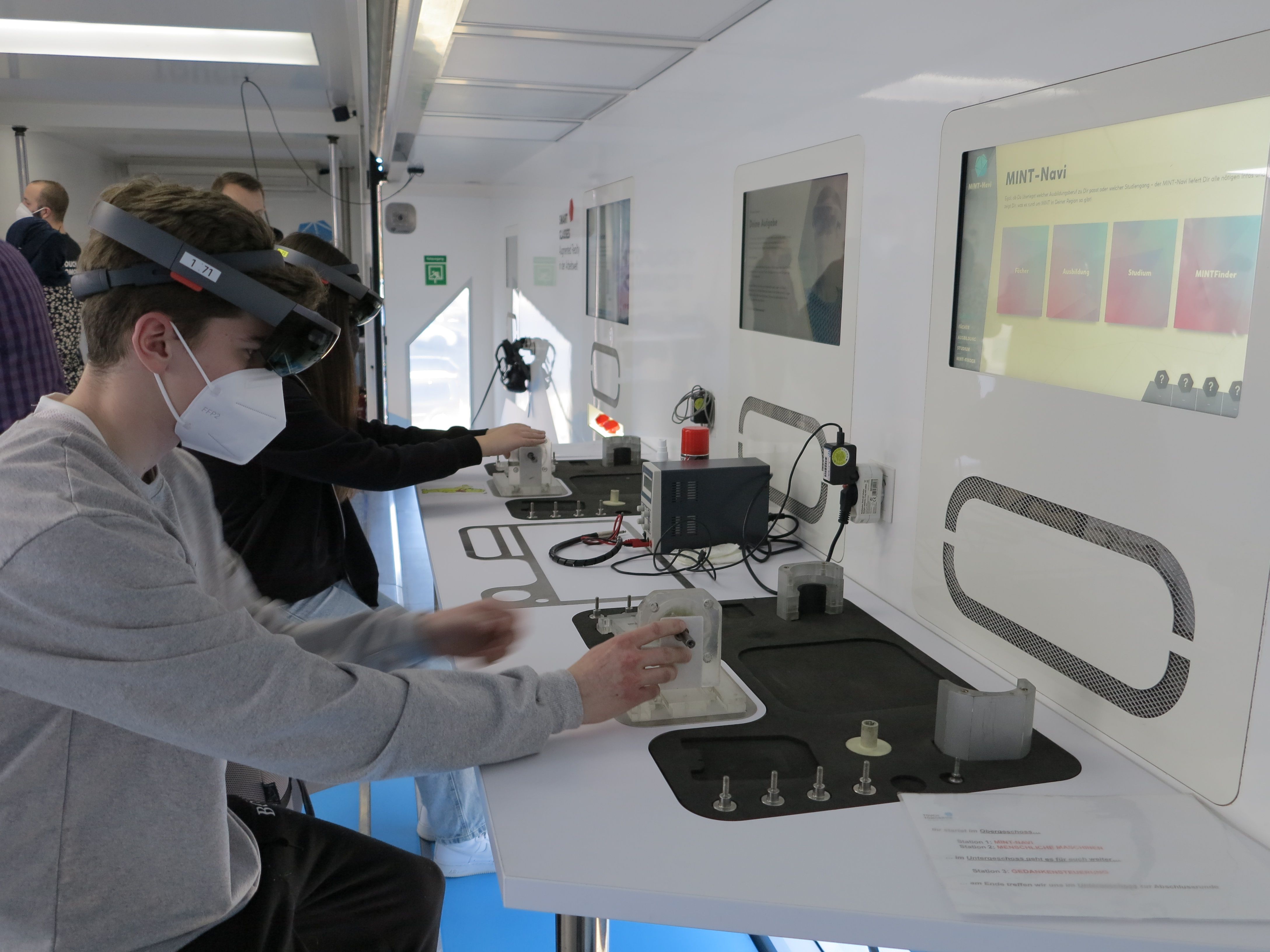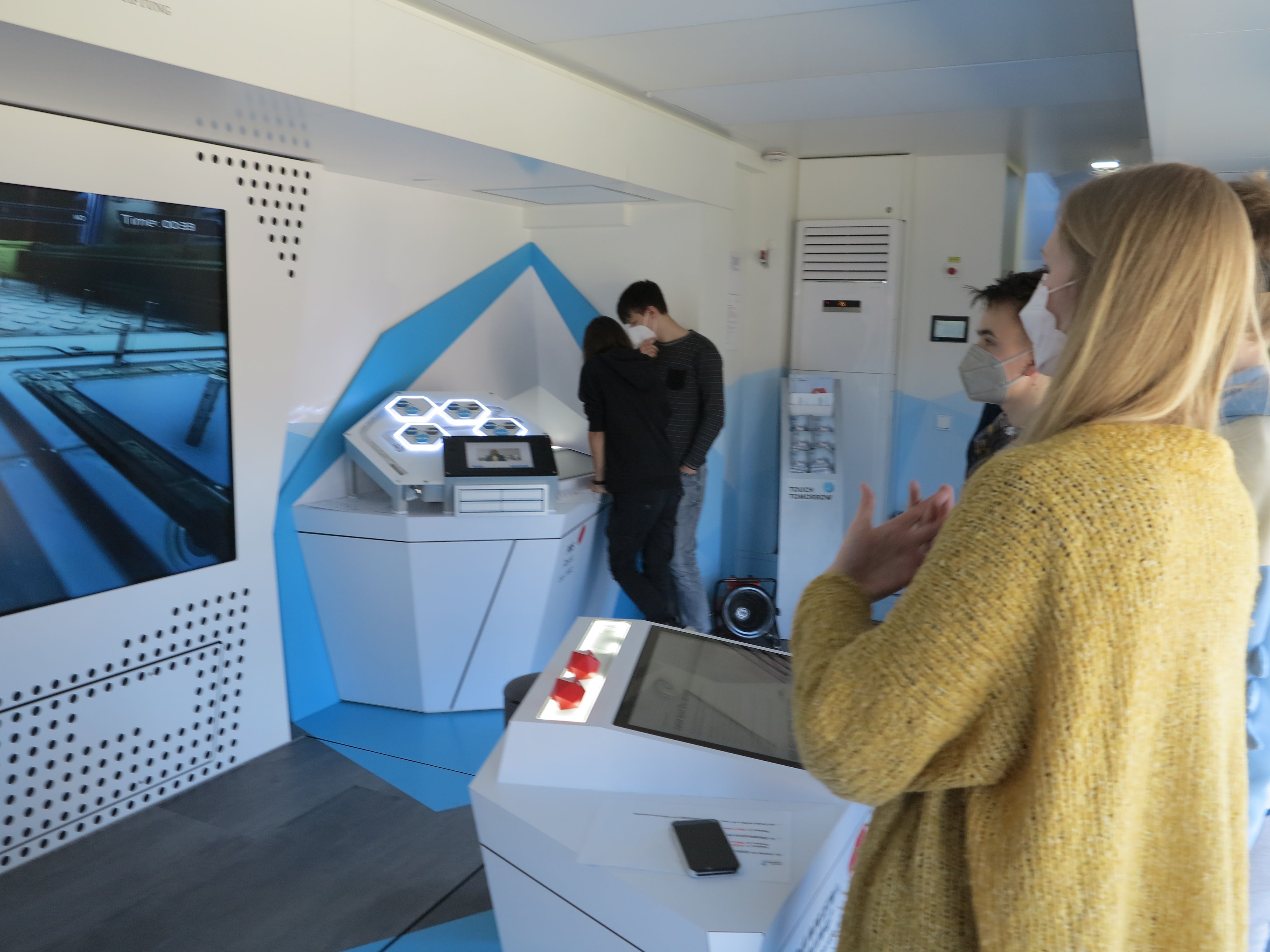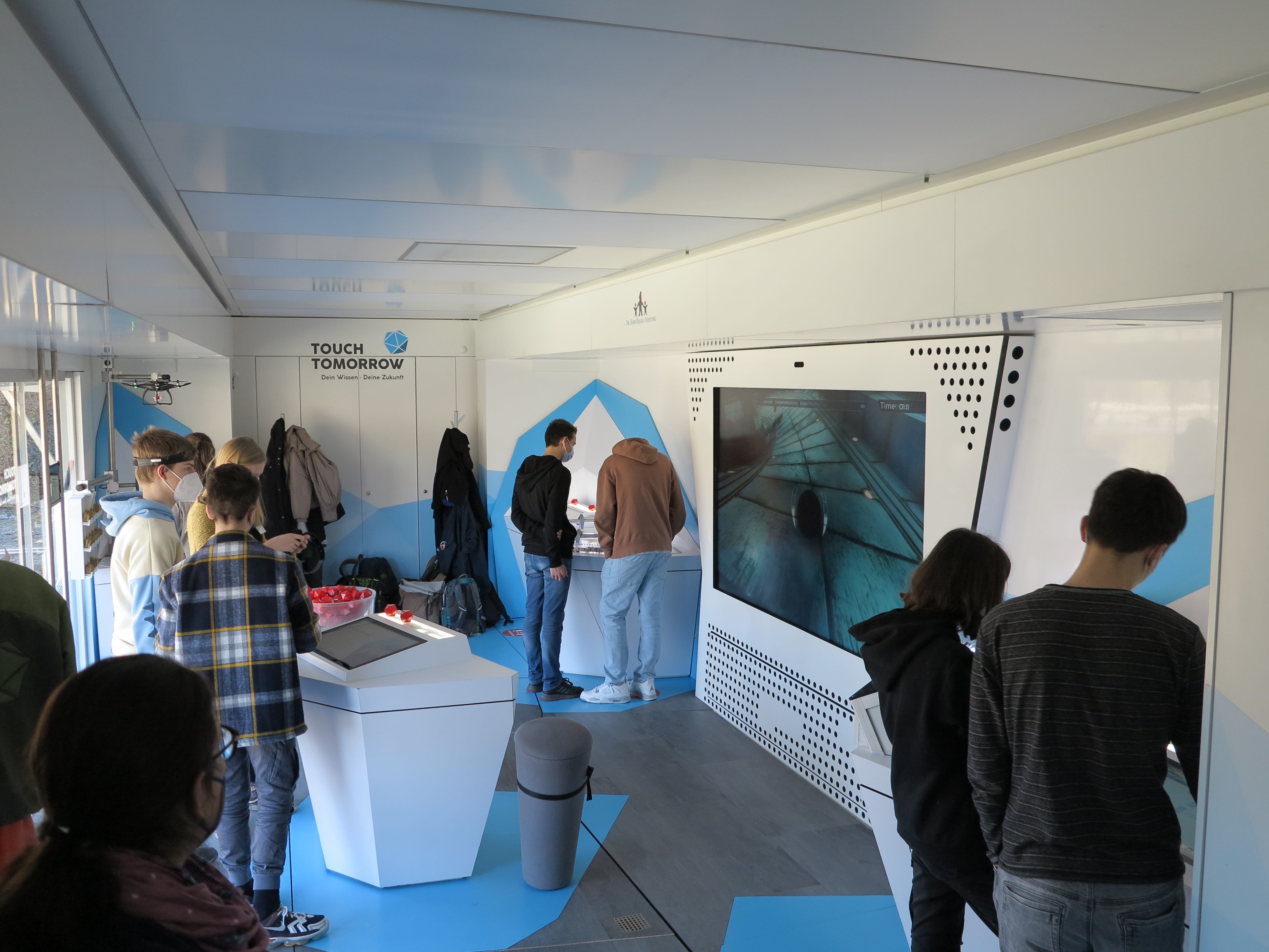 Kugeln nur mit Gedanken steuern, Roboter programmieren, die anschließend Plüschbären apportie-ren, einen Personenzug in einer Vakuumröhre durch Elektromagnetismus auf 1.300 Stundenkilome-ter beschleunigen, mit ‚Smart Glases“ in einer virtuellen Welt technische Bauteile zusammensetzen oder schon heute die textilen Materialen der Zukunft anfassen – die experimentellen Ansätze be-geistern die Schüler der 8. Klasse in der Doppelstunde, die sie im Truck zubringen. Begleitet werden sie dabei von „MINT-Coaches“ – allesamt junge, pädagogisch geschulte Naturwissenschaftler, wie Hanna Wagner. Der Kognitionswissenschaftlerin macht die Arbeit mit den Jugendlichen sichtlich Freude. Dass sie häufig von den Achtklässlern angesprochen wird, zeigt: die Chemie stimmt. „Was, die zwei Stunden sind schon vorbei?“ „Wann kann ich denn nochmal kommen?“ „Kommt Ihr wie-der?“ – alles Fragen, die Wagner nicht zum ersten Mal hört.