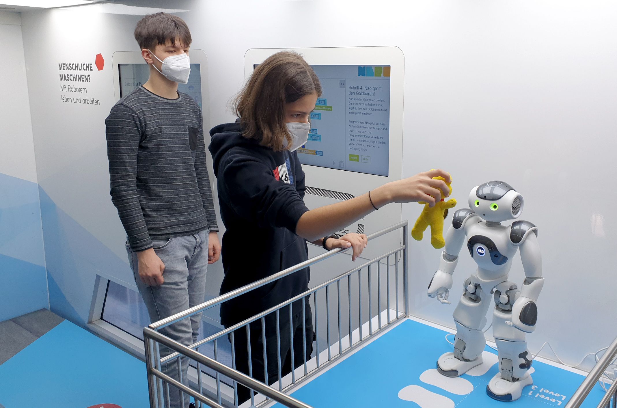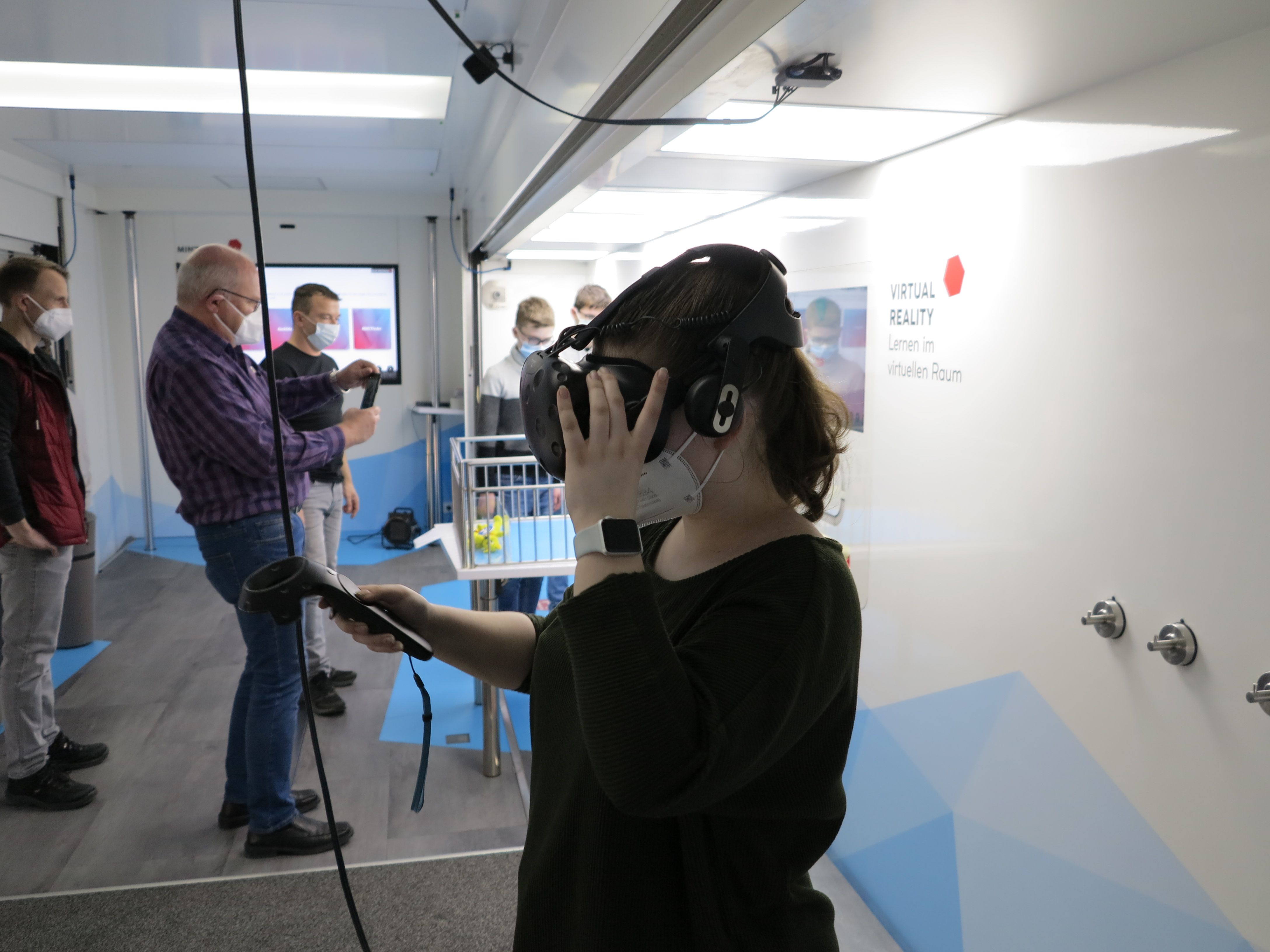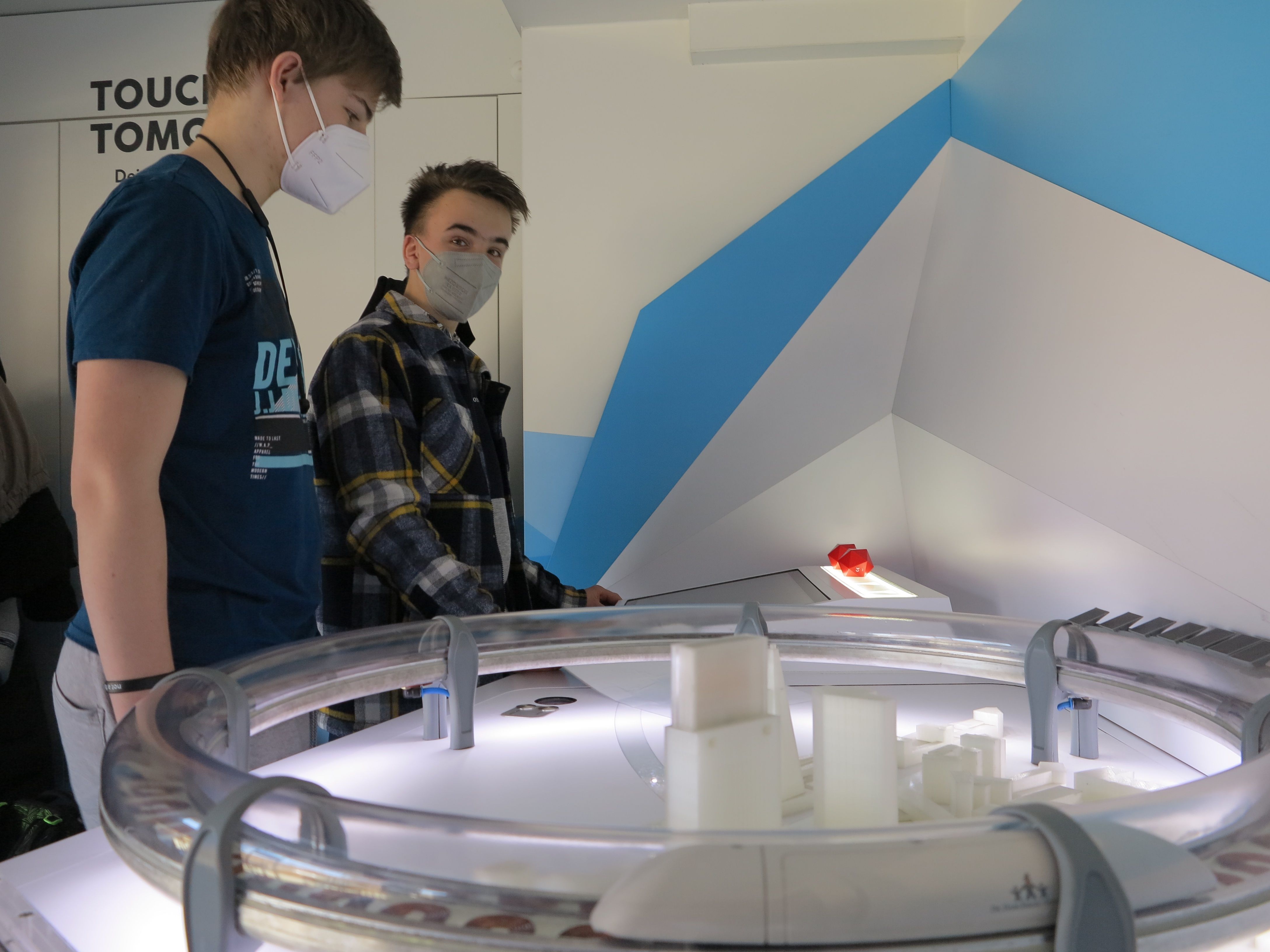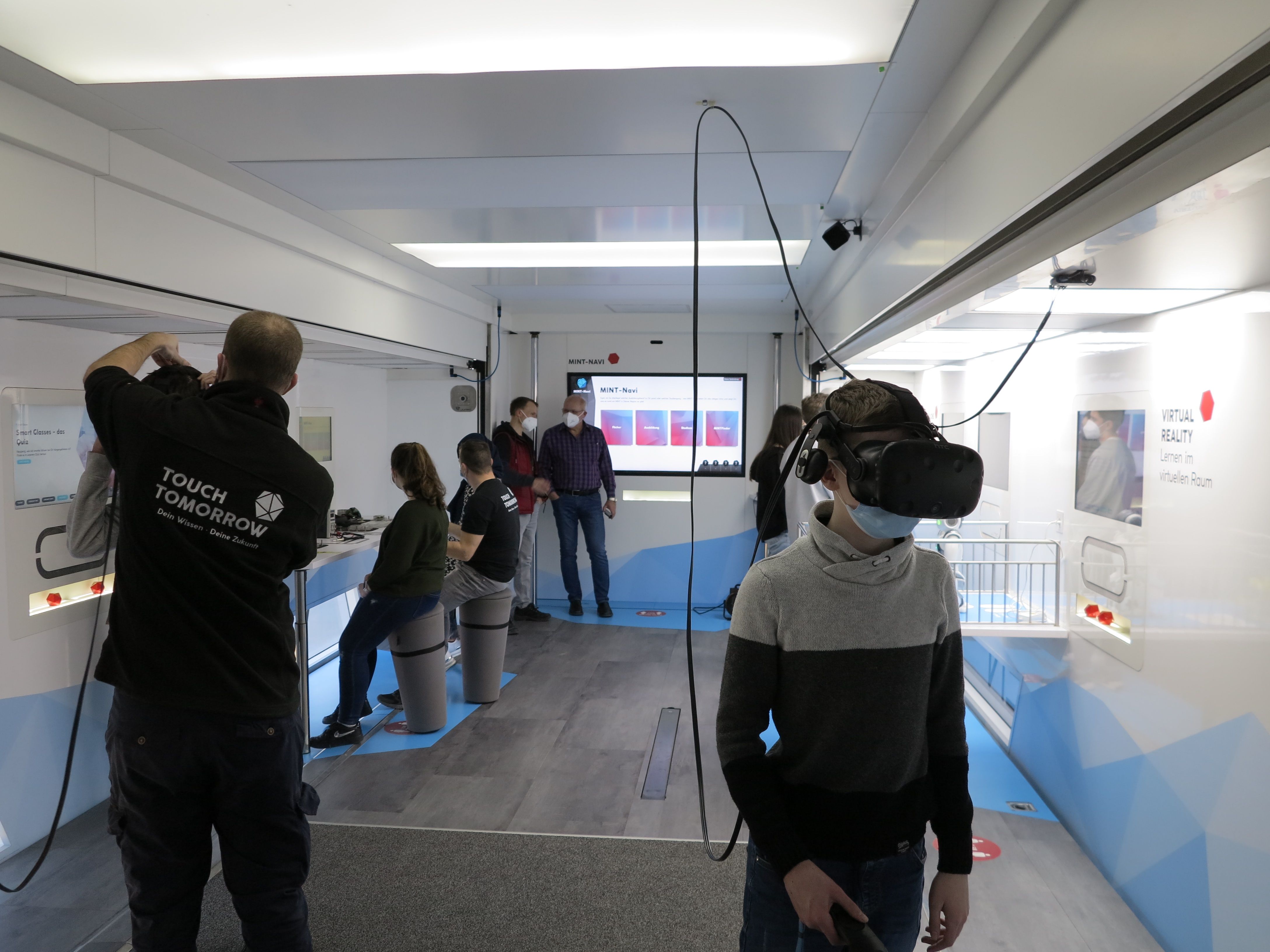 Kugeln nur mit Gedanken steuern, Roboter programmieren, die anschließend Plüschbären apportie-ren, einen Personenzug in einer Vakuumröhre durch Elektromagnetismus auf 1.300 Stundenkilome-ter beschleunigen, mit ‚Smart Glases“ in einer virtuellen Welt technische Bauteile zusammensetzen oder schon heute die textilen Materialen der Zukunft anfassen – die experimentellen Ansätze be-geistern die Schüler der 8. Klasse in der Doppelstunde, die sie im Truck zubringen. Begleitet werden sie dabei von „MINT-Coaches“ – allesamt junge, pädagogisch geschulte Naturwissenschaftler, wie Hanna Wagner. Der Kognitionswissenschaftlerin macht die Arbeit mit den Jugendlichen sichtlich Freude. Dass sie häufig von den Achtklässlern angesprochen wird, zeigt: die Chemie stimmt. „Was, die zwei Stunden sind schon vorbei?“ „Wann kann ich denn nochmal kommen?“ „Kommt Ihr wie-der?“ – alles Fragen, die Wagner nicht zum ersten Mal hört.