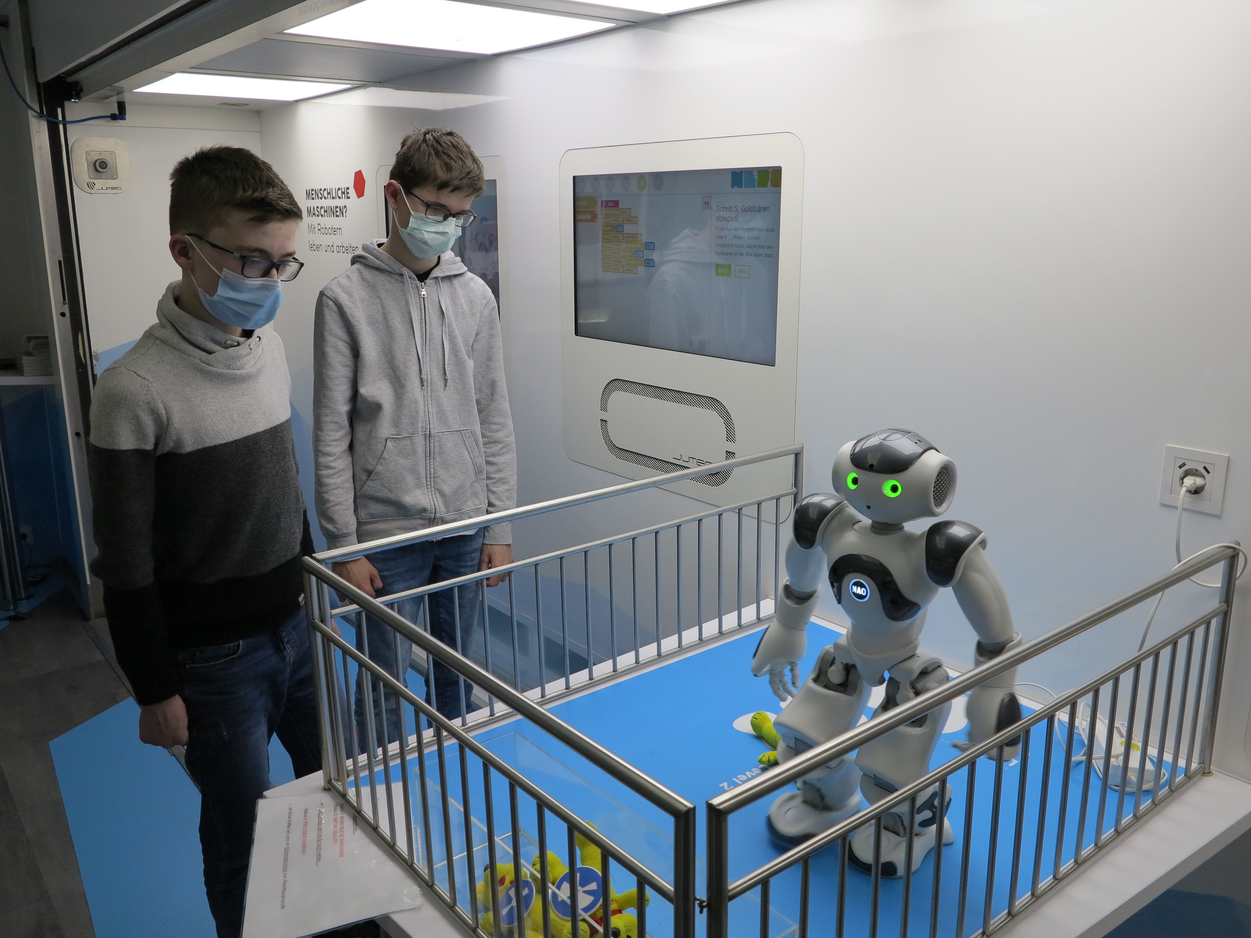 Kerstin Renkhoff von der Schulleitung hat vor allem der ‚Nao-Roboter‘ begeistert: „Eine Schülerin sagte noch zu Beginn, dass sie bei MINT-Fächern und bei Programmierung überhaupt nichts könne. Das geringe Selbstwertgefühl beobachten wir häufiger in diesem Bereich. Und dann konnte diese Schülerin bei der Programmierung im Truck die Aufgabe meistern. Die Gruppe hat sich ein ‚Highfive‘ gegeben und gemeinsam ein koopertives Erfolgserlebnis gesammelt. Das stimmt uns sehr zuver-sichtlich, dass solche Projekte der richtige Ansatz sind." Ihr Kollege, Stefan Riemer, der in der Schu-le die berufliche Orientierung koordiniert fügt hinzu: „Uns war bei der Auswahl der Teilnehmer be-sonders wichtig, in der Jahrgangsstufe 8 ein breites Interesse zu wecken. Daher besuchen alle Jahrgangsteilnehmer den Truck. Diese Jugendlichen beginnen erst ihren Weg der Berufsorientie-rung. Auf diesem Prozess bereits ein eindrückliches Aha-Erlebnis im MINT-Bereich zu sammeln, ist uns als Schule sehr wichtig. Gleichzeitig haben wir aber auch gezielt interessierte Gruppen der älte-ren Jahrgänge ausgewählt, um vorhandenes Interesse durch Begeisterung zu verstärken und den Weg der Orientierung durch Angebote zu prägen."